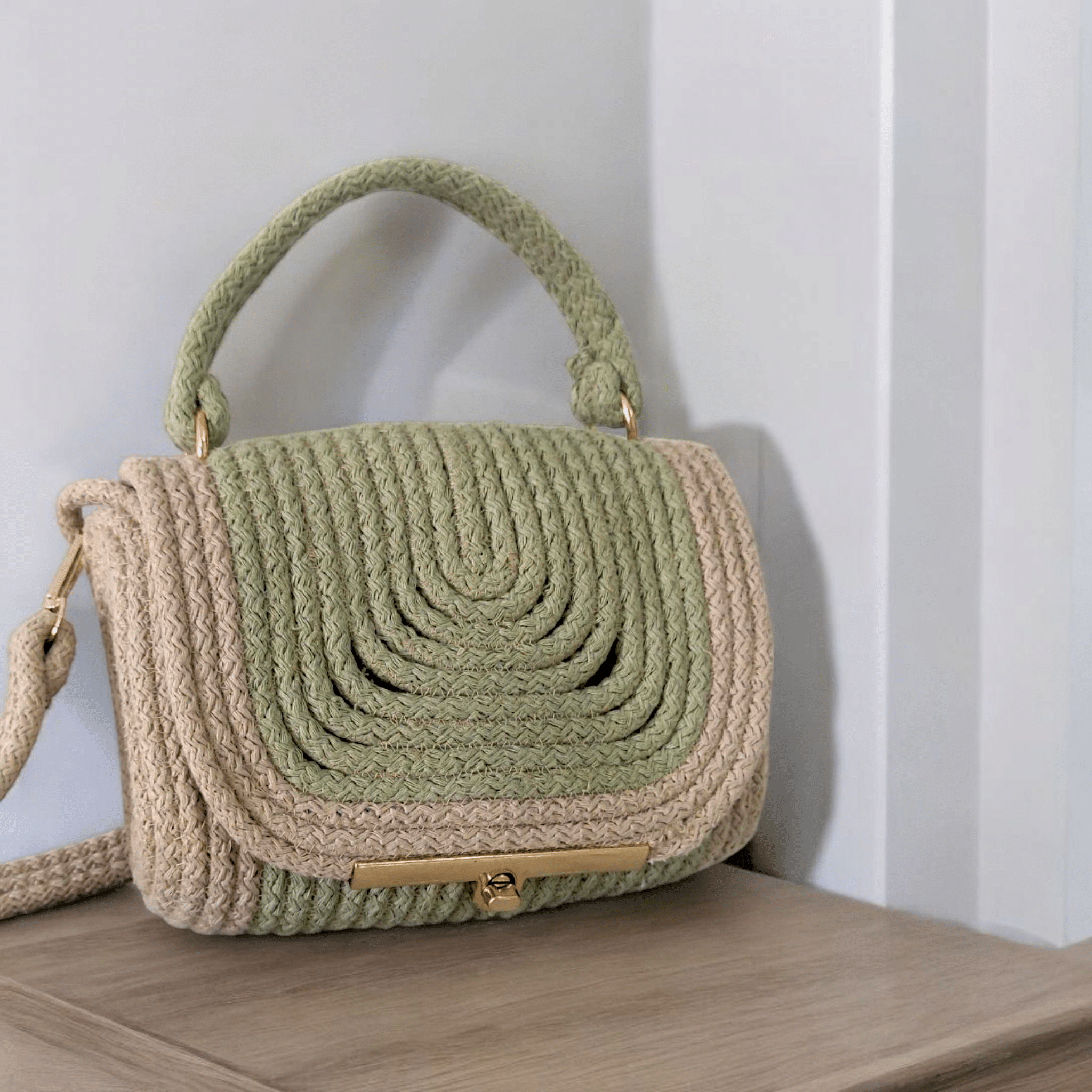“Introducing Olive Harmony – where nature meets elegance! Handwoven with eco-friendly braided rope, this unique piece blends earthy green and beige tones for a timeless look. Perfect for any occasion! 🌿✨