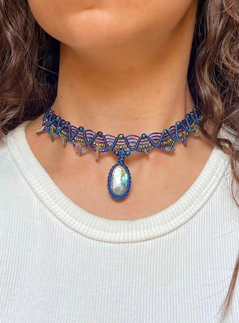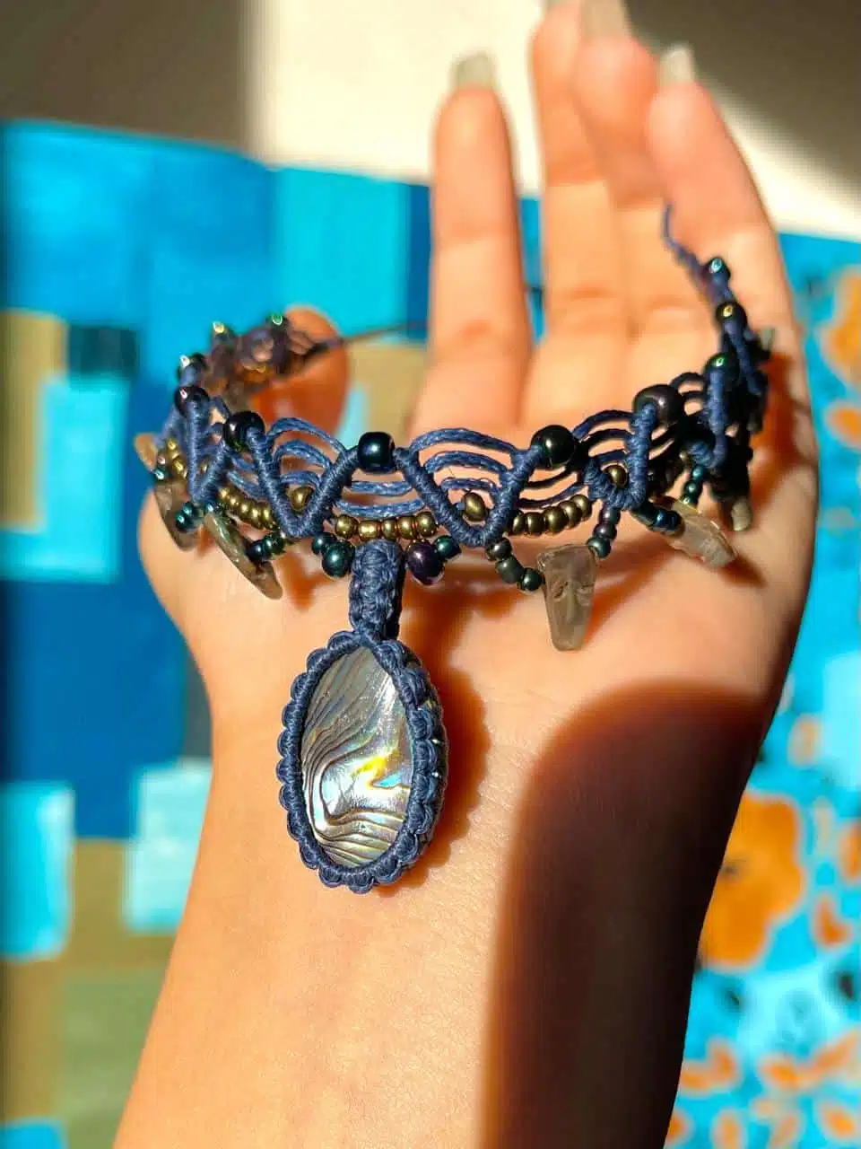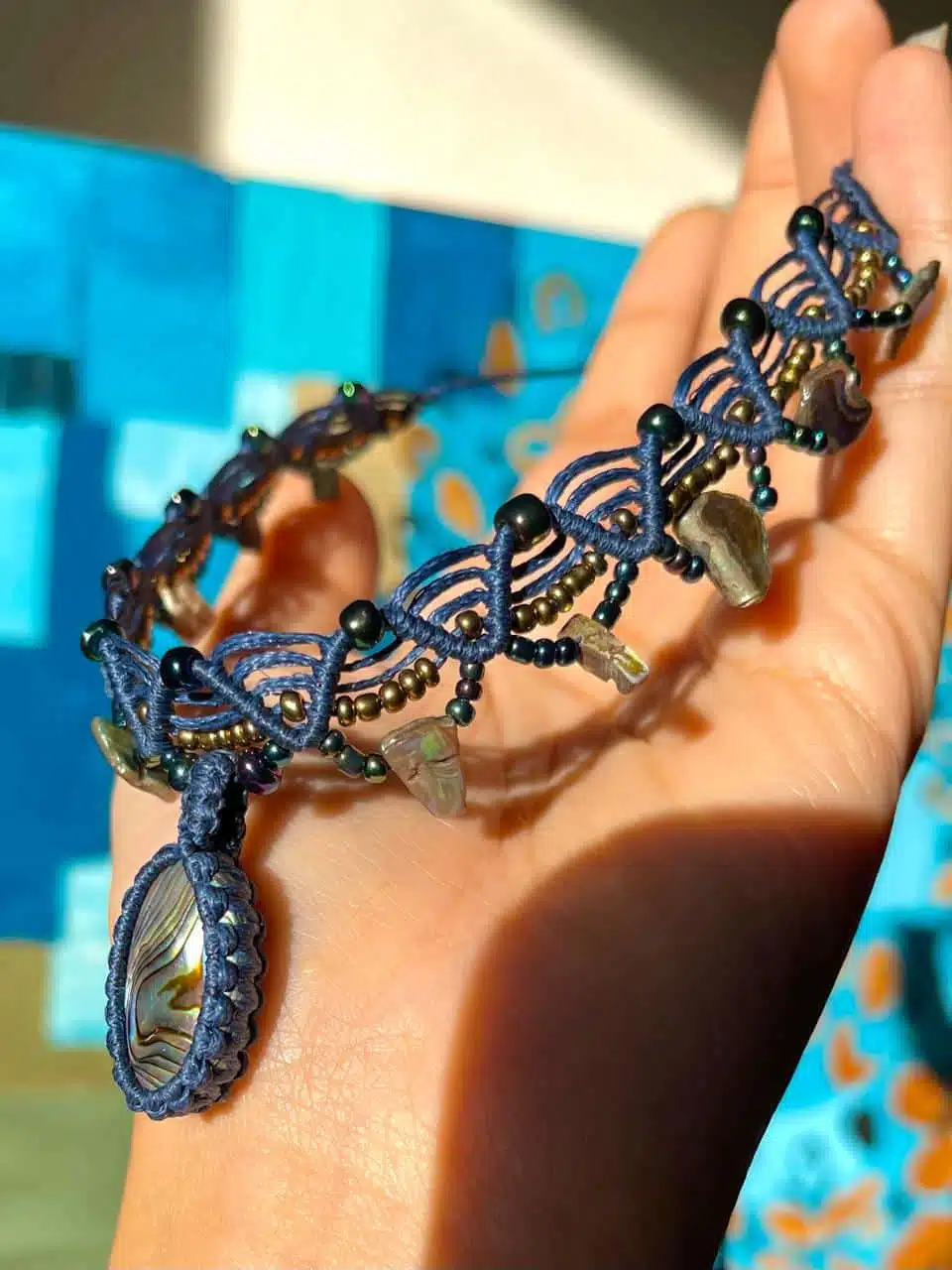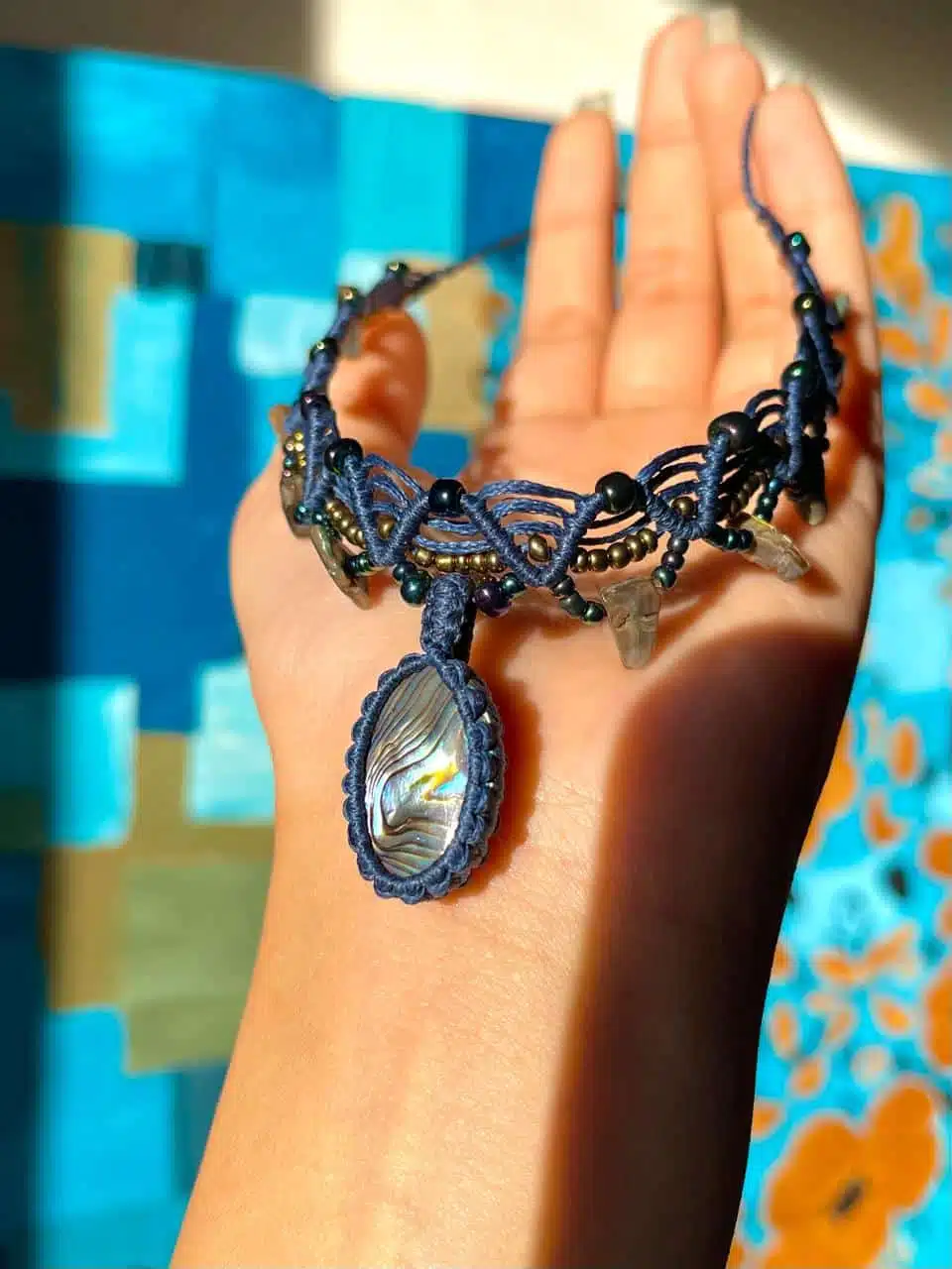 abalone stone in navy cords surrounded by irregular abalones and brass