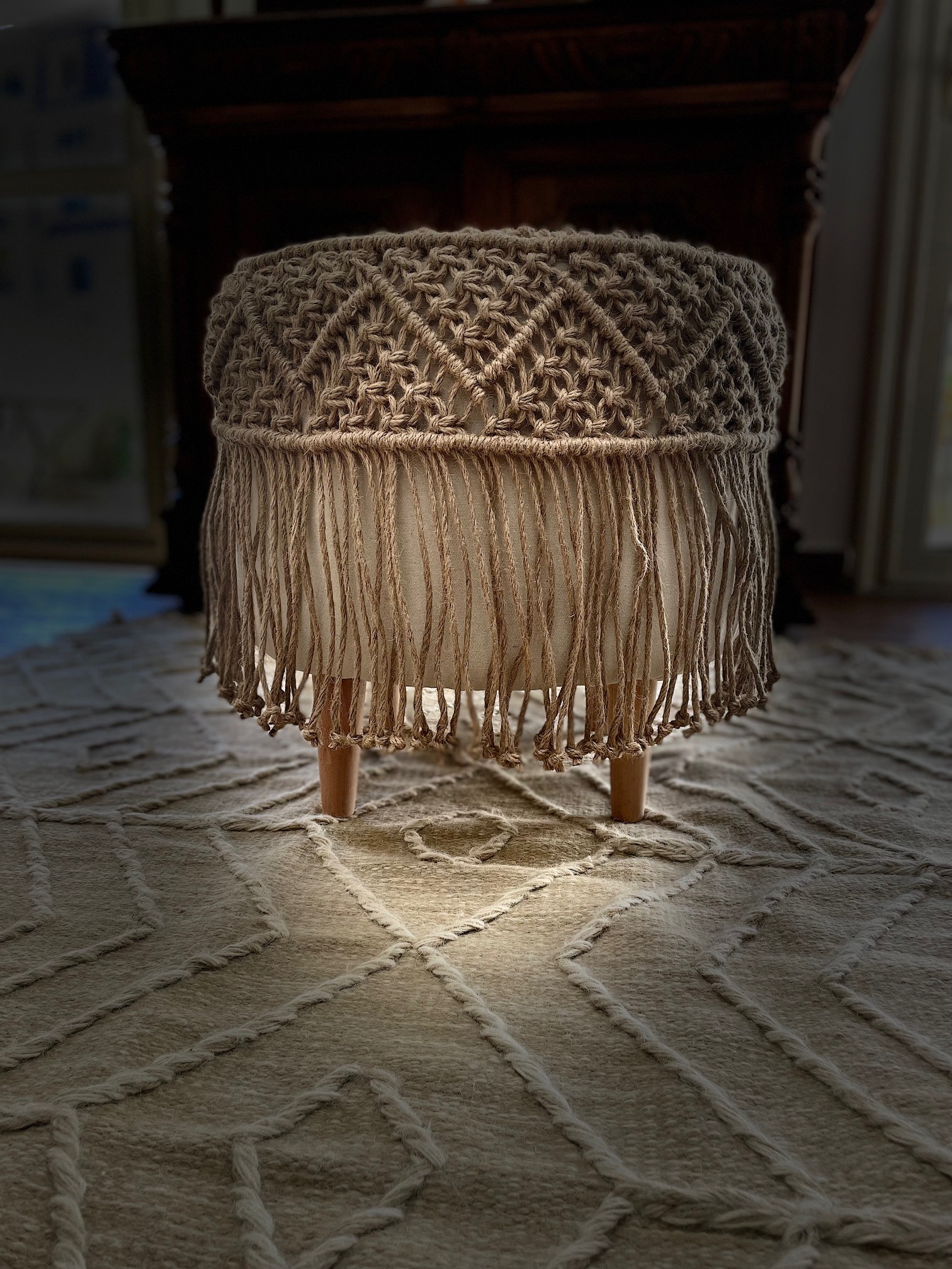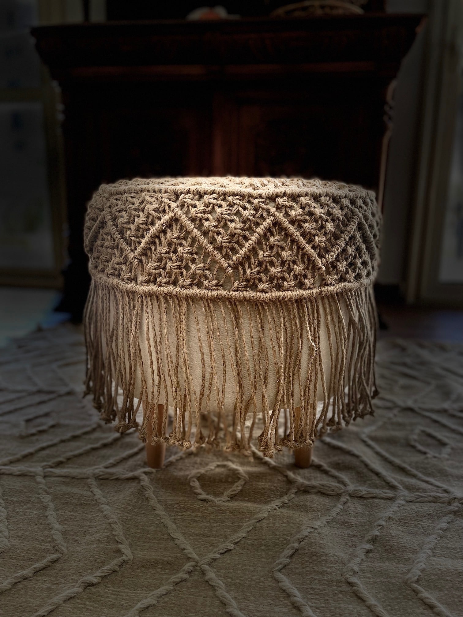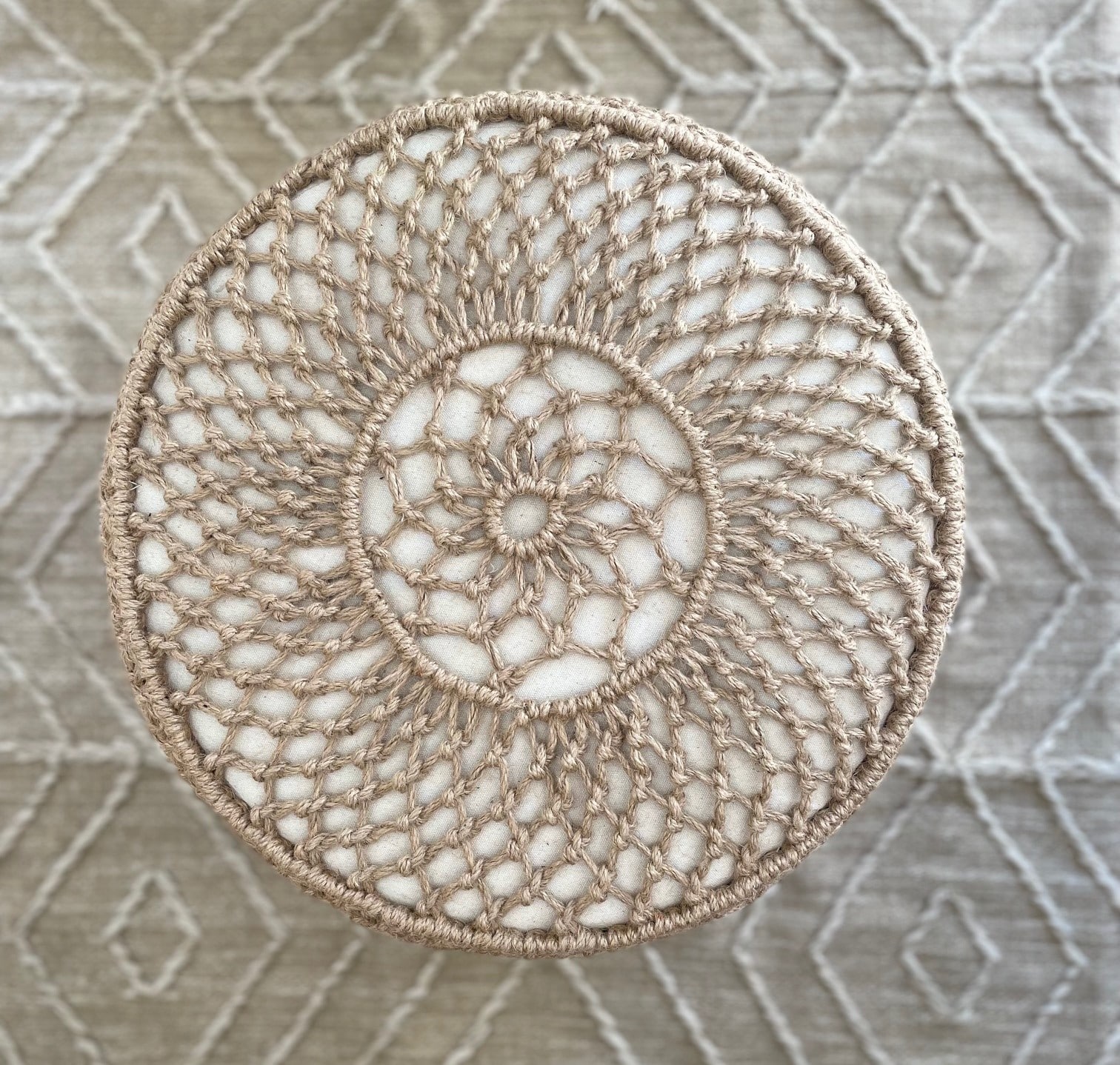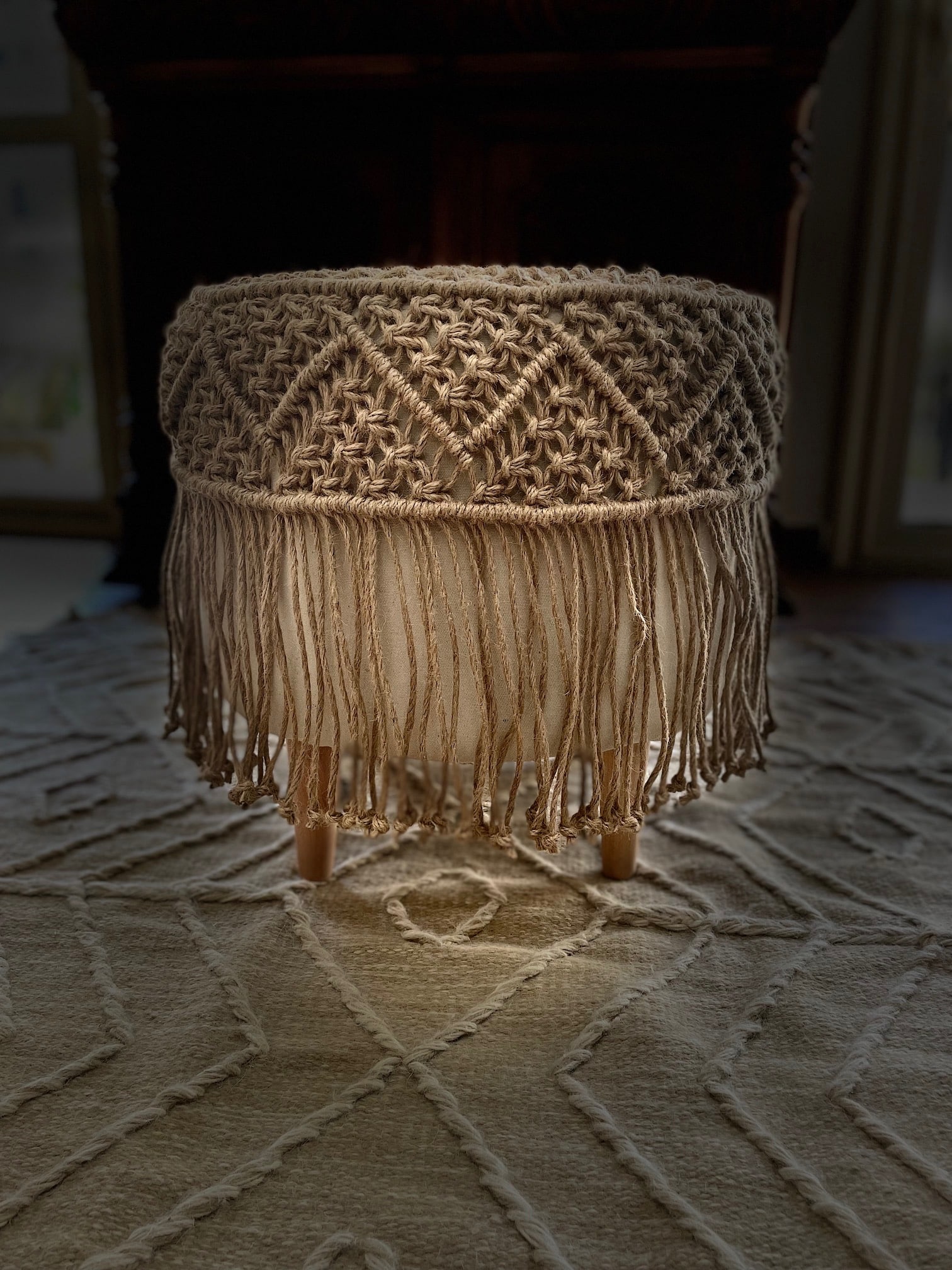Jute Macrame handmade puff cover with pure cotton fabric and beach wood, 45cm diameter * 45cm height, handwash, cold water only