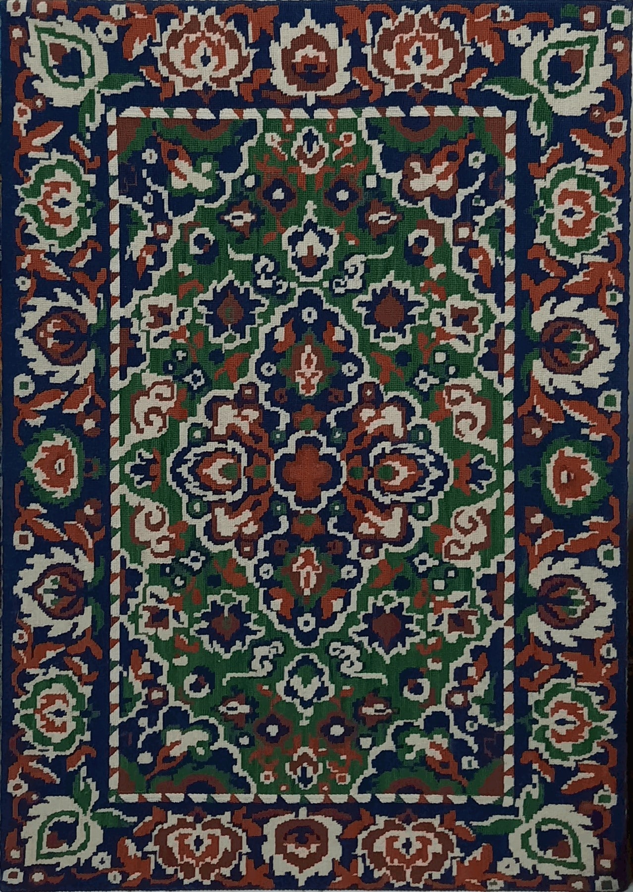 Elevate your space with this exquisite handcrafted canvas, inspired by traditional Persian motifs. Featuring a harmonious blend of deep green, navy blue, rust orange, and ivory hues, this tapestry embodies timeless elegance and cultural significance. Each intricate detail reflects the artistry and dedication to traditional craftsmanship, making it a statement piece for any interior.