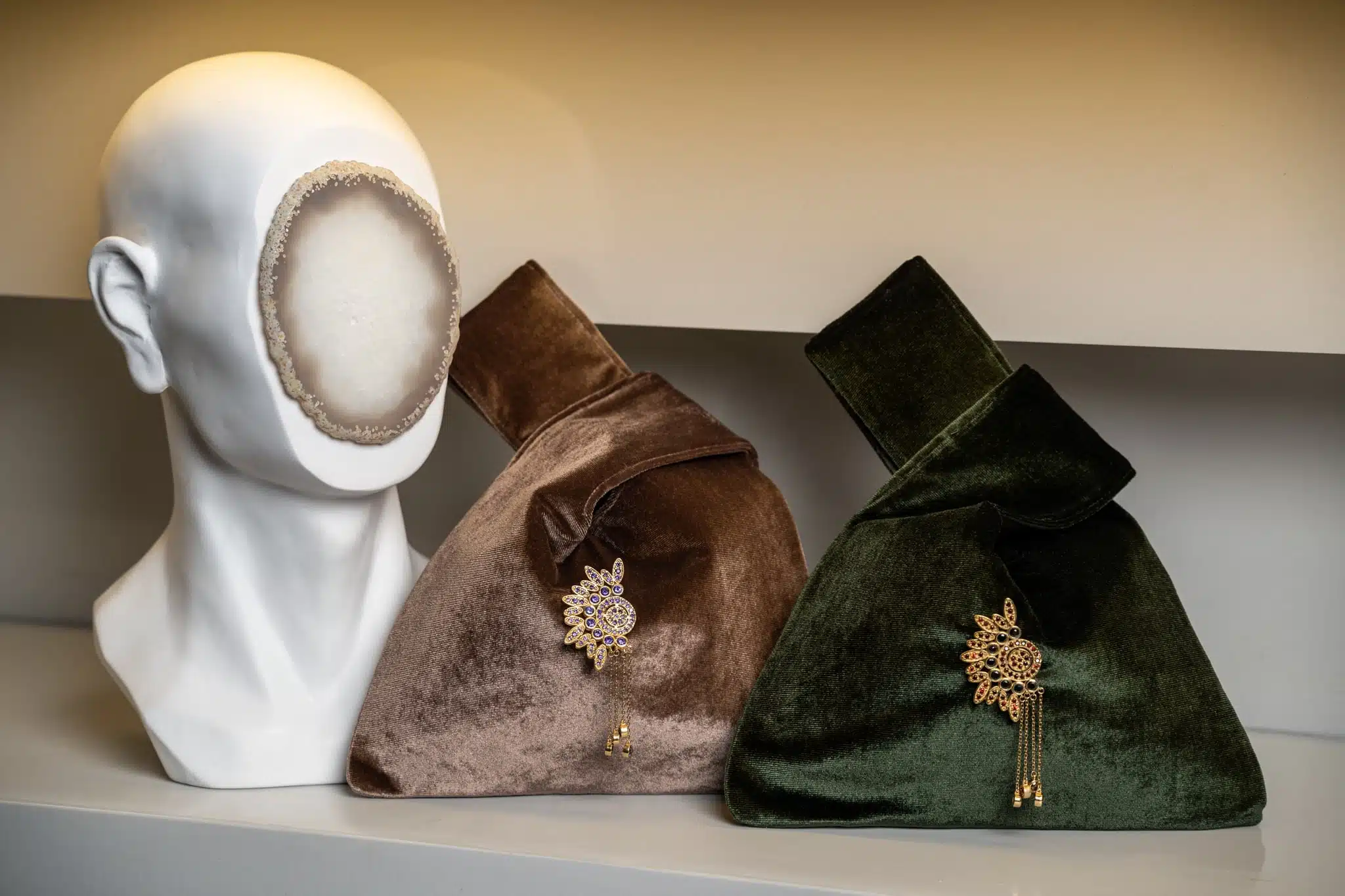 Oxide Japanese Knot Wristbag, in rich Velvet Material , tailored with inside satin lining, and our signature yellow gold-embedded piece with purple stones, by CH by Christine Habib Azer,