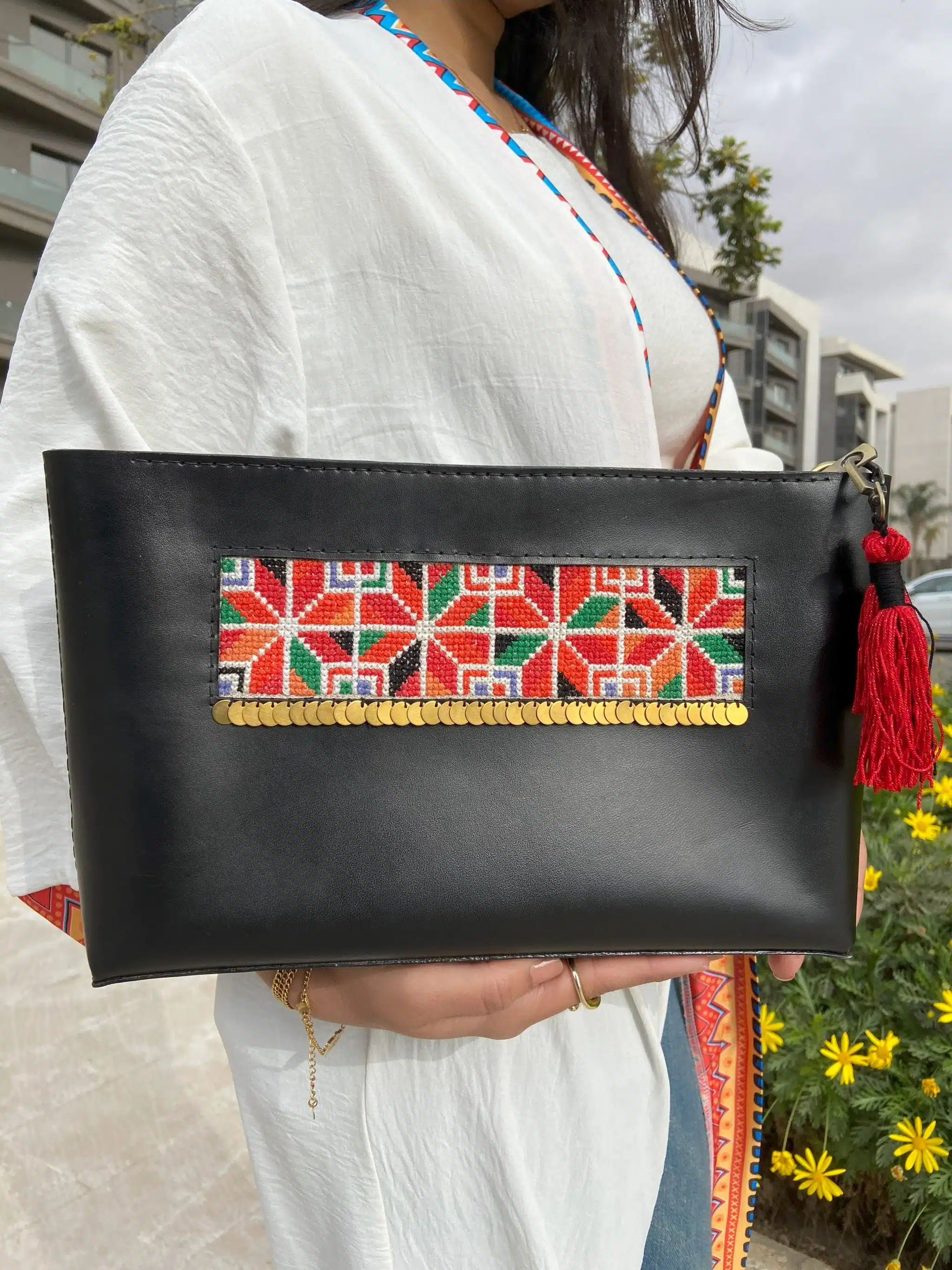 حقيبه جلد طبيعي بتطريز فلسطيني بها جيوب داخليه ويد سلسله طويله