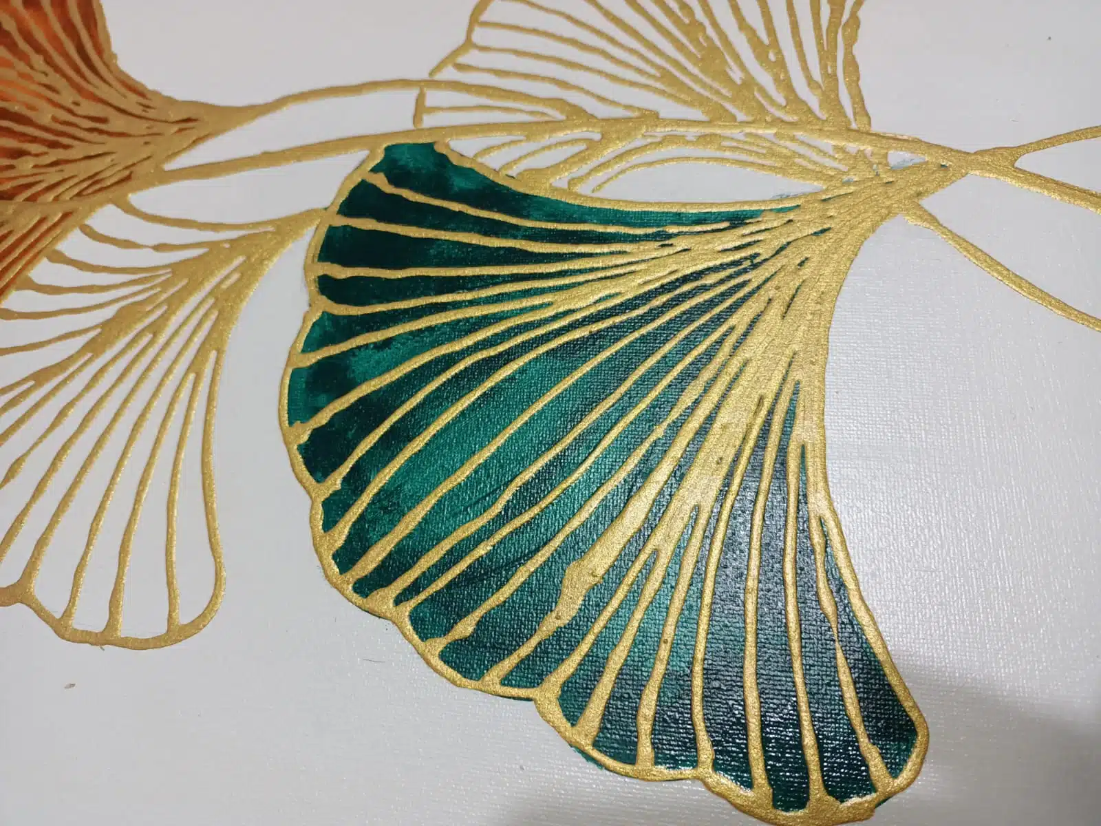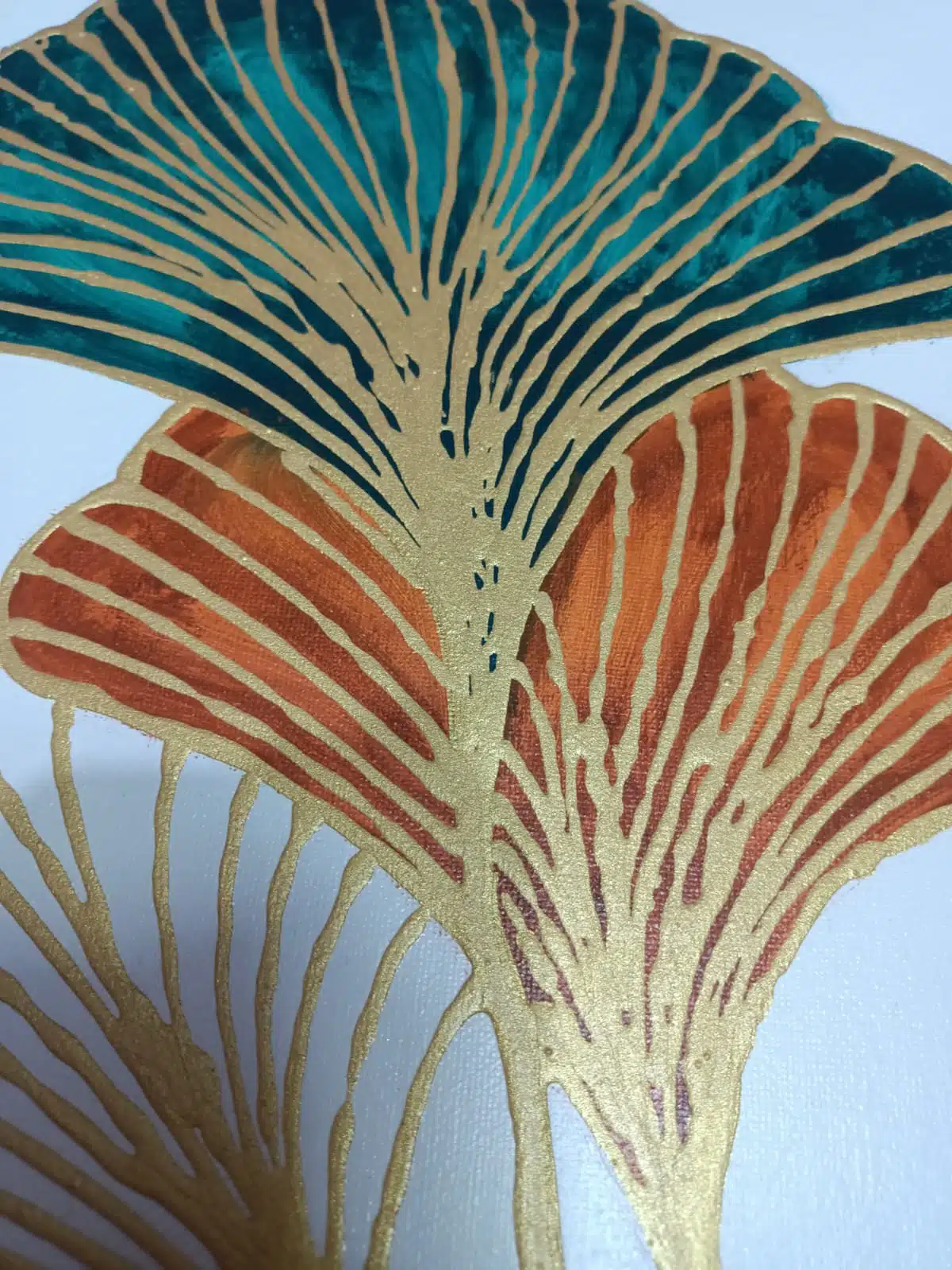3D abstract Papyrus flower drawn by golden paste and golden leaf found in the edges of the 2 small canvas.