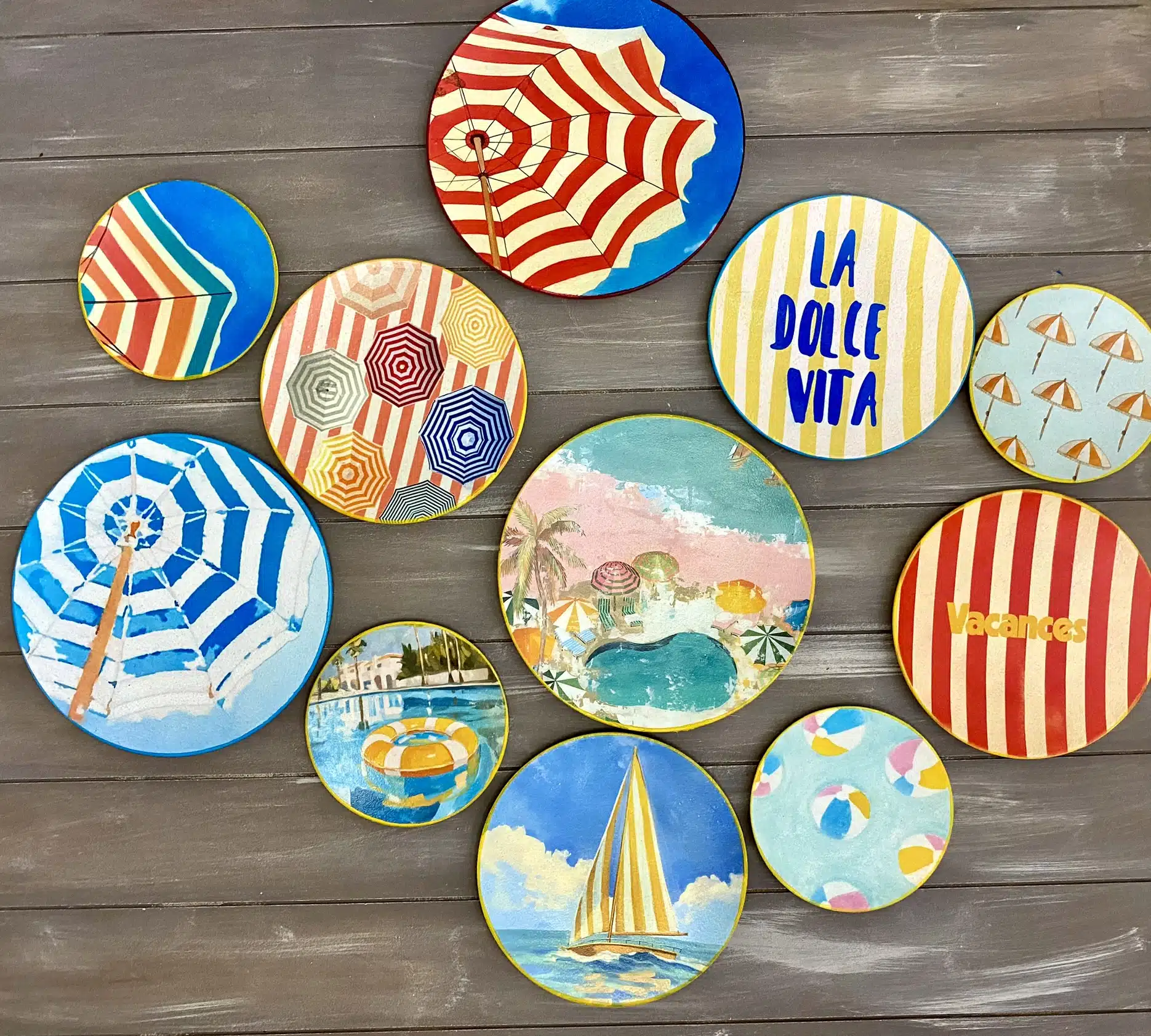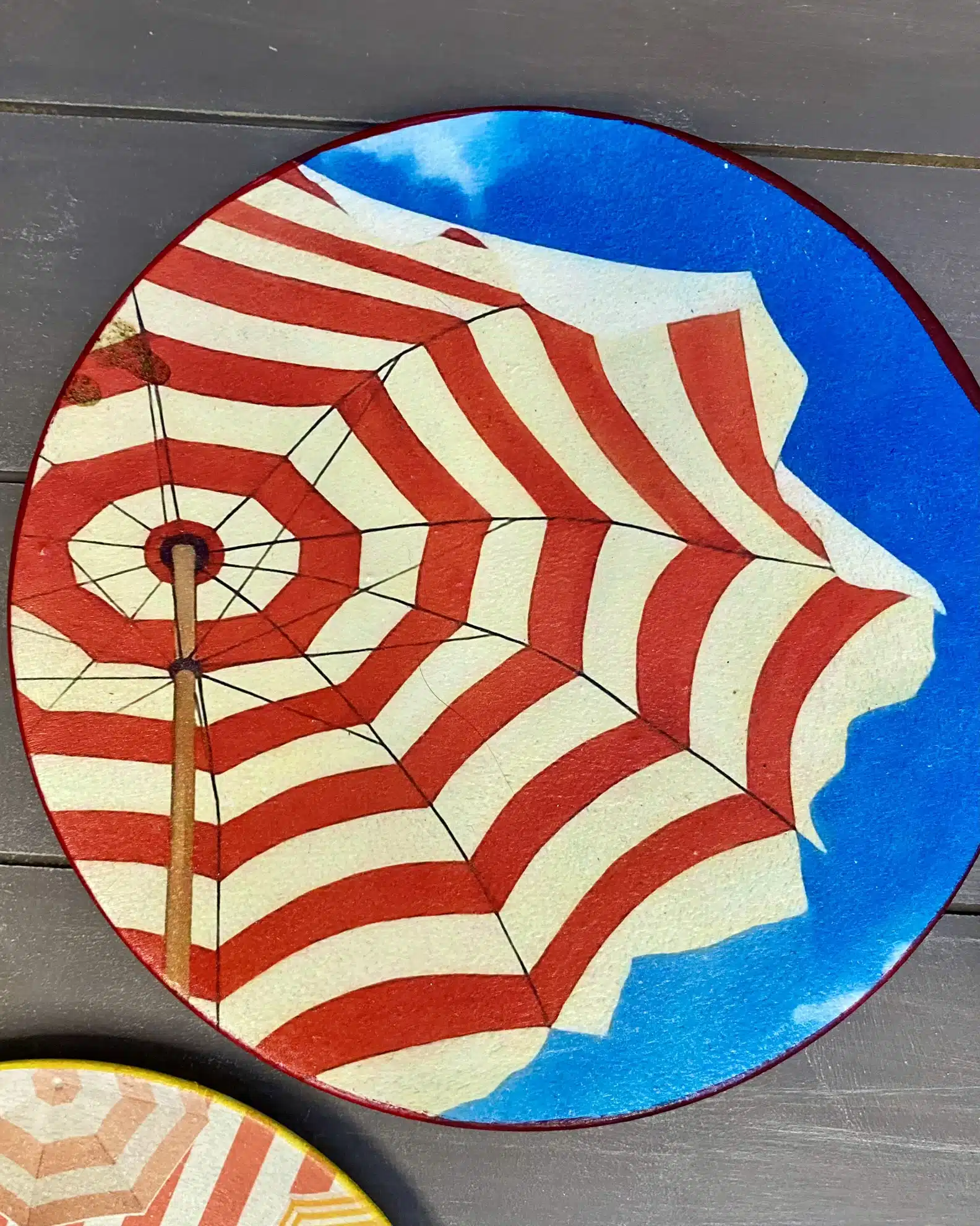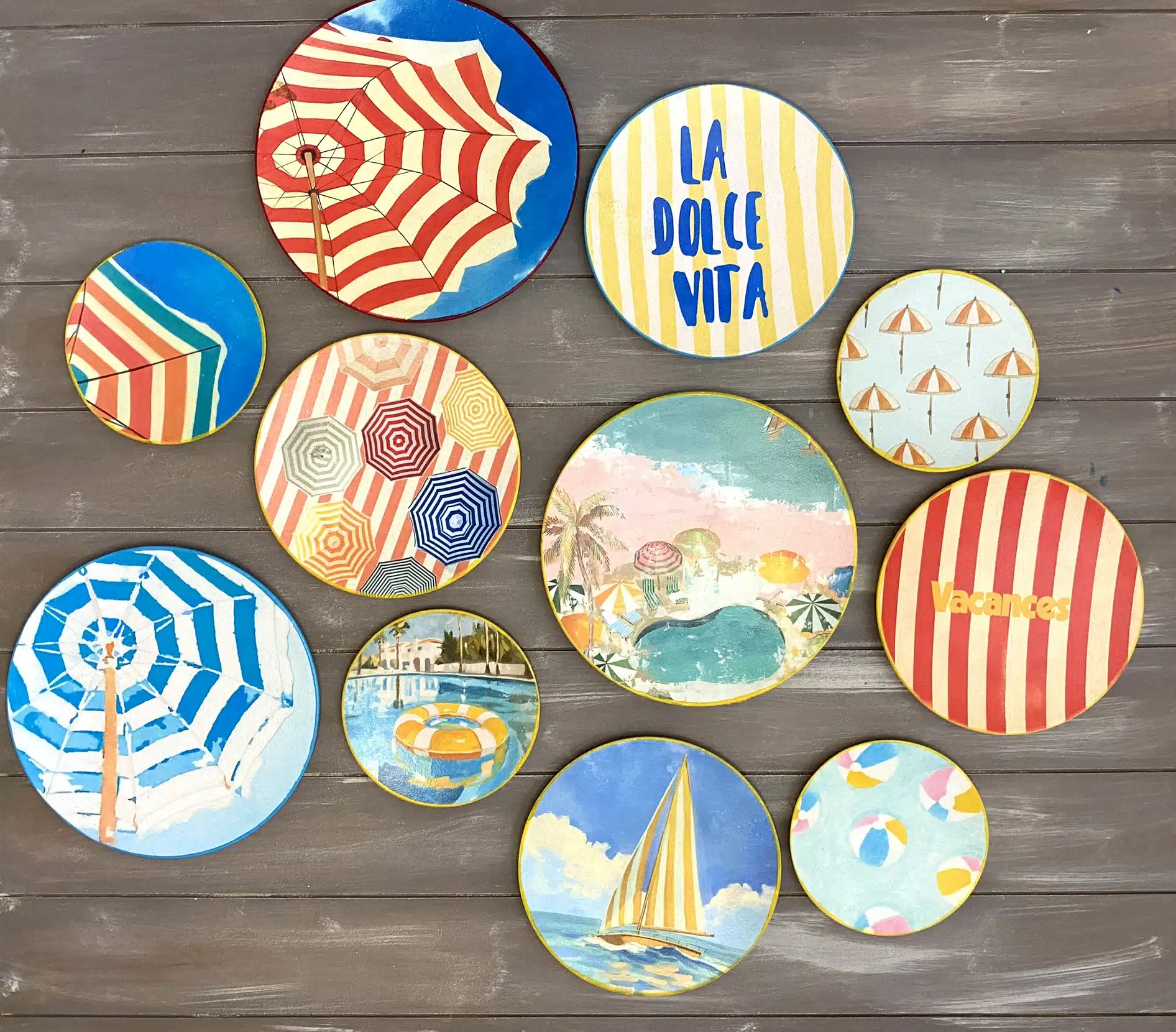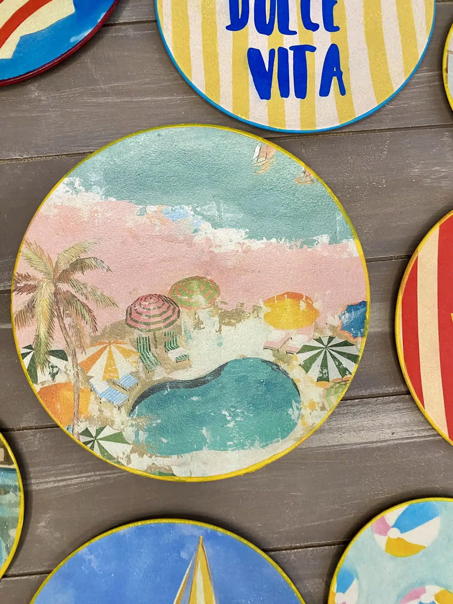 Decoupaged wall plates for summer in retro parasol theme