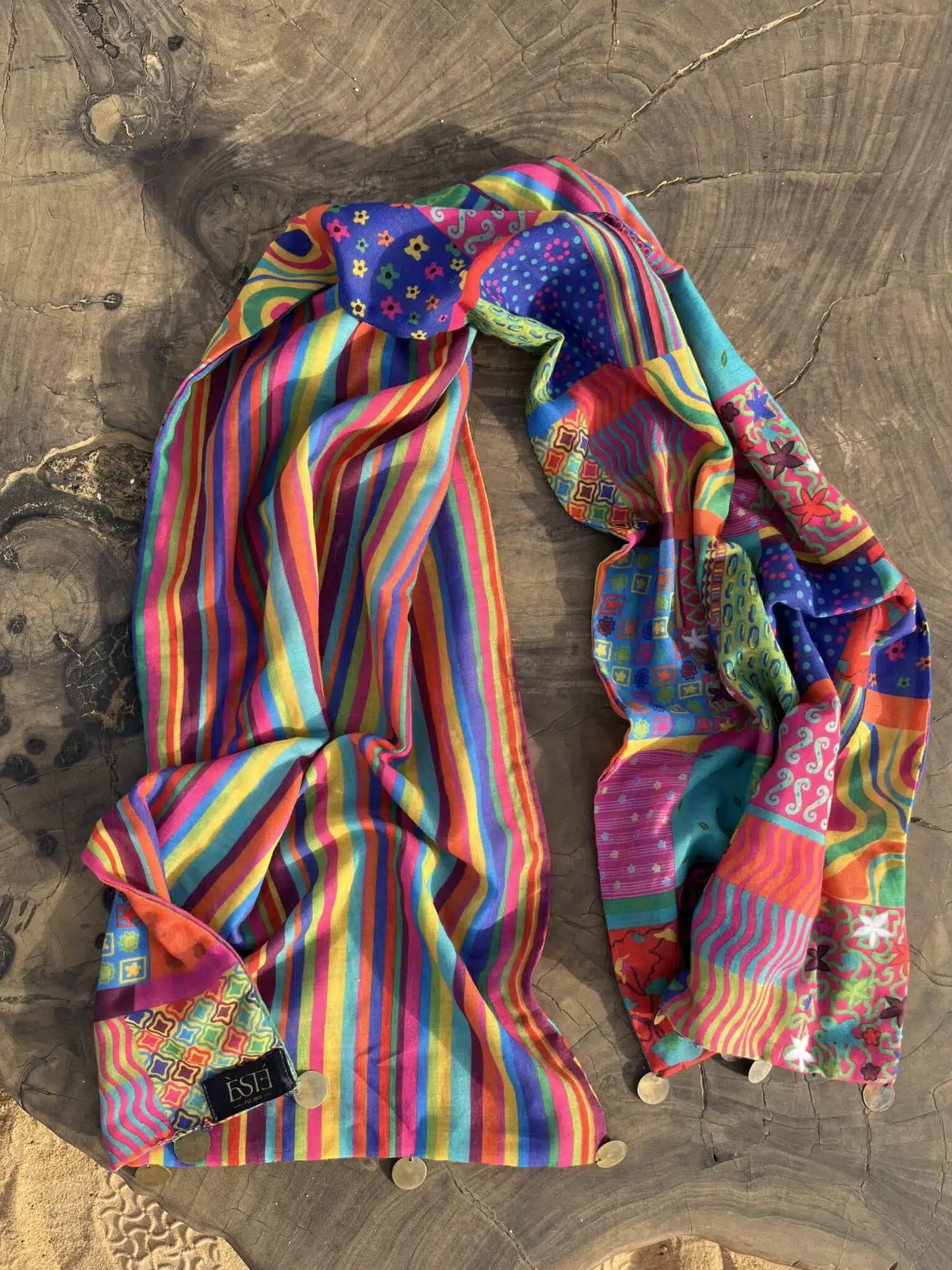Our scarf is a timeless accessory that will add a very stylish look to all your outfits. You can wear it as a scarf, as a kerchief , tie it into your tote bag, wrap it around your hair, or wrap it around your waist on the beach. It’s double faced, one side is patterned, and the other side is in stripes with the same palette. They have on the edges small dangling copper discs for an extra shiny look.