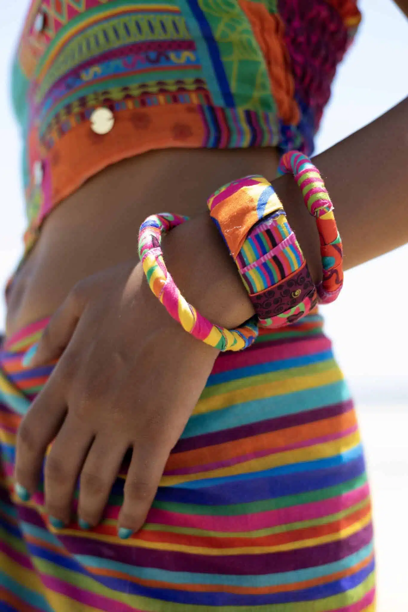 he patchy bangles set consists of one thick bangle and 4 thin bangles. They will definitely add a very stylish taste to your outfits. You can wear them together as a set on a simple plain outfit, or wear them on out patches set (this is the boldest option <3)