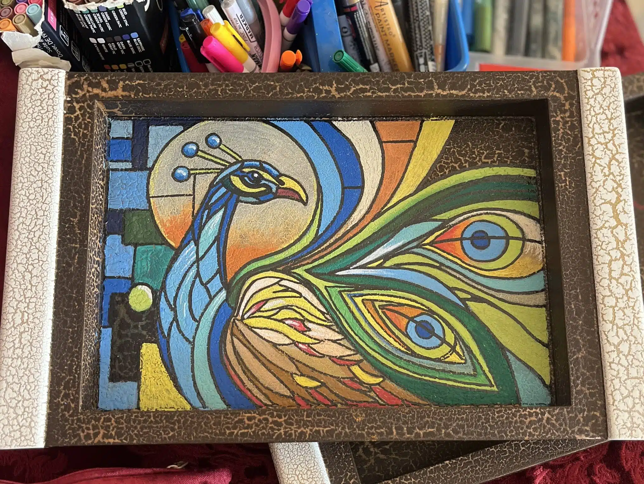 A unique design for a very colorful and special peacock.painted on bleech wood. Natural fine wood. That last forever. Water resistant surface. Acid free and toxic free paint.
