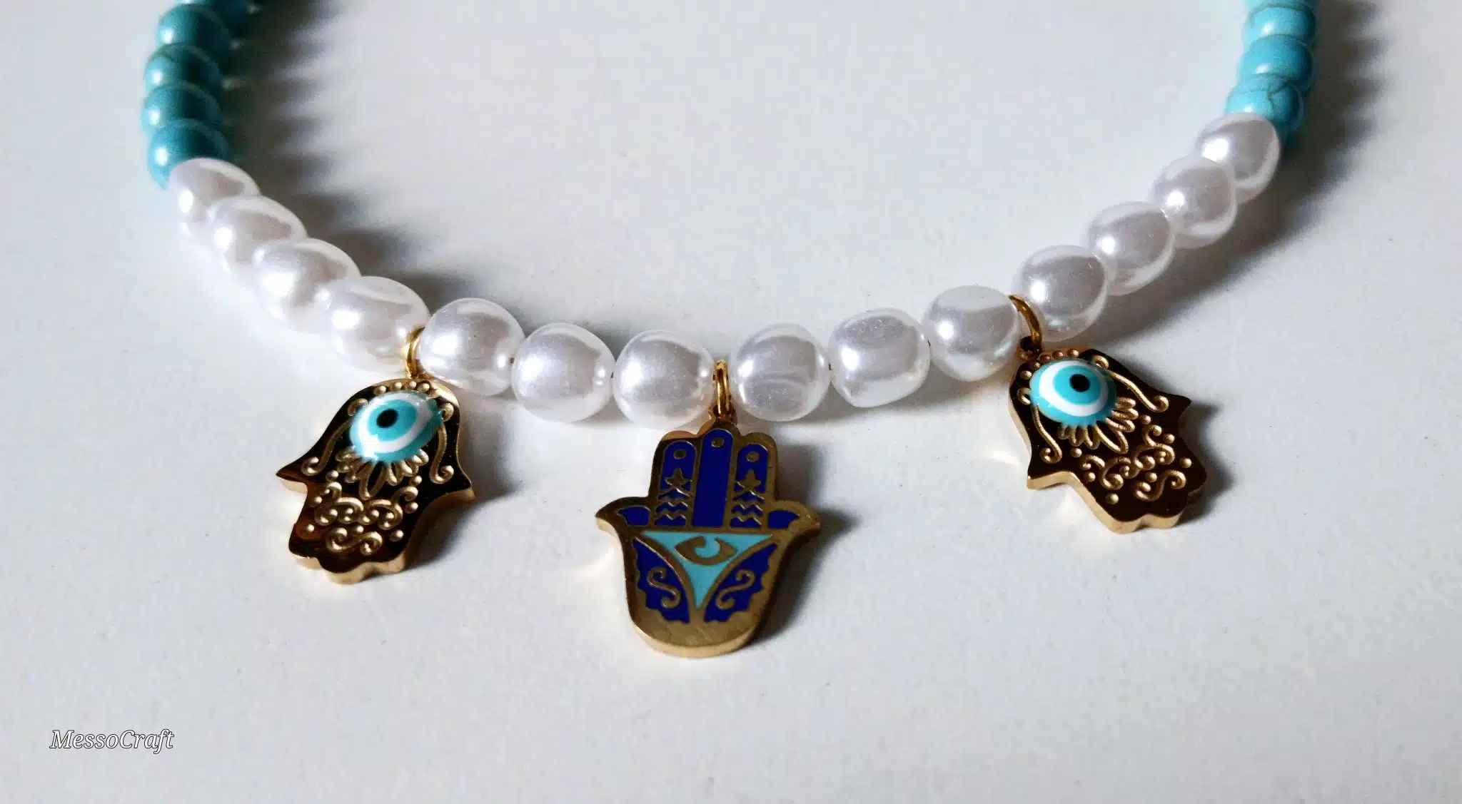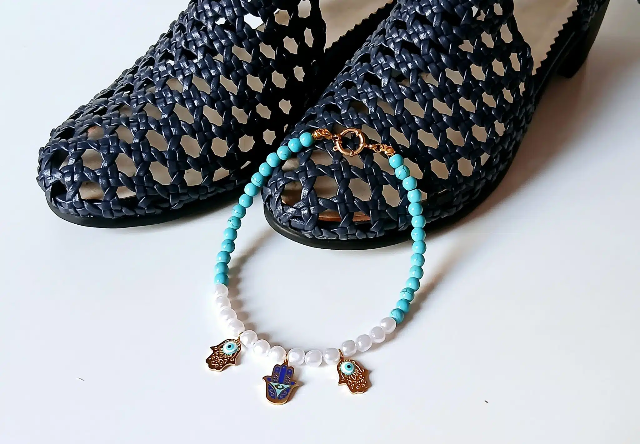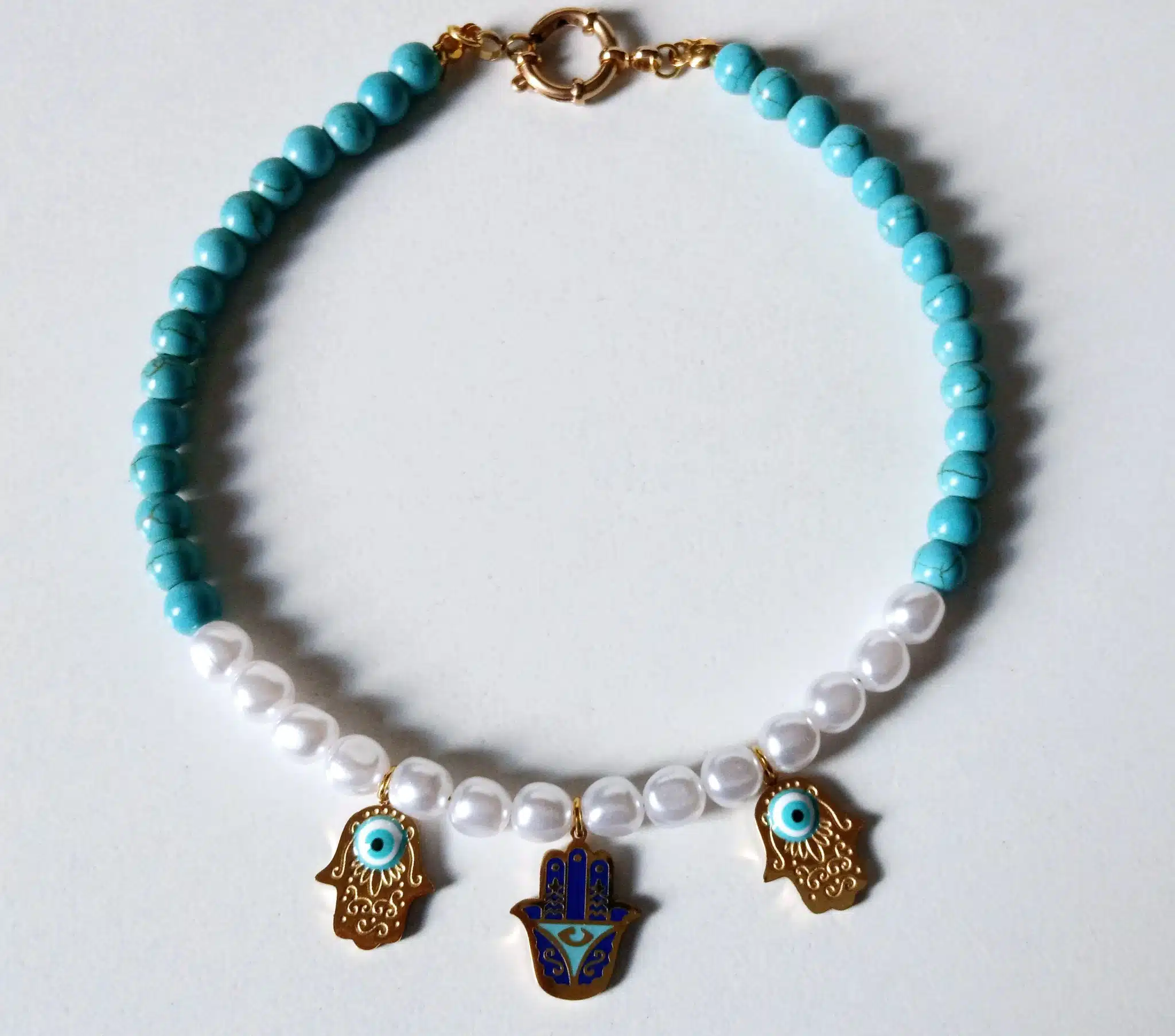 Anklet made of pearl and turquoise stones with three unique hamsa pendants