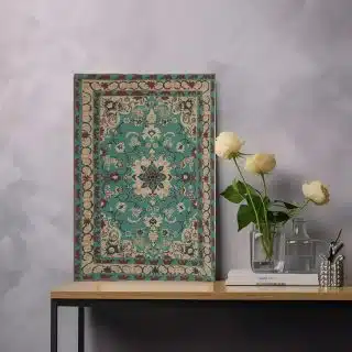This Artwork showcases a breathtaking Persian-inspired design, featuring two majestic peacocks flanking a central ornamental vase. Surrounding the focal point is a lush floral pattern, bursting with vibrant hues of blue, green, terracotta, and gold. The border, adorned with an elegant geometric pattern, frames the piece perfectly, creating a harmonious blend of nature and artistry.