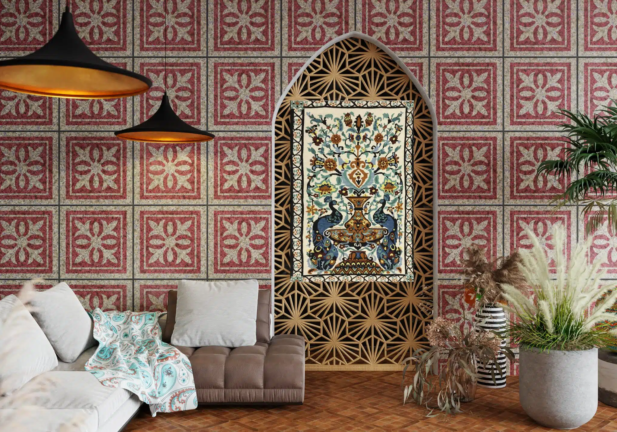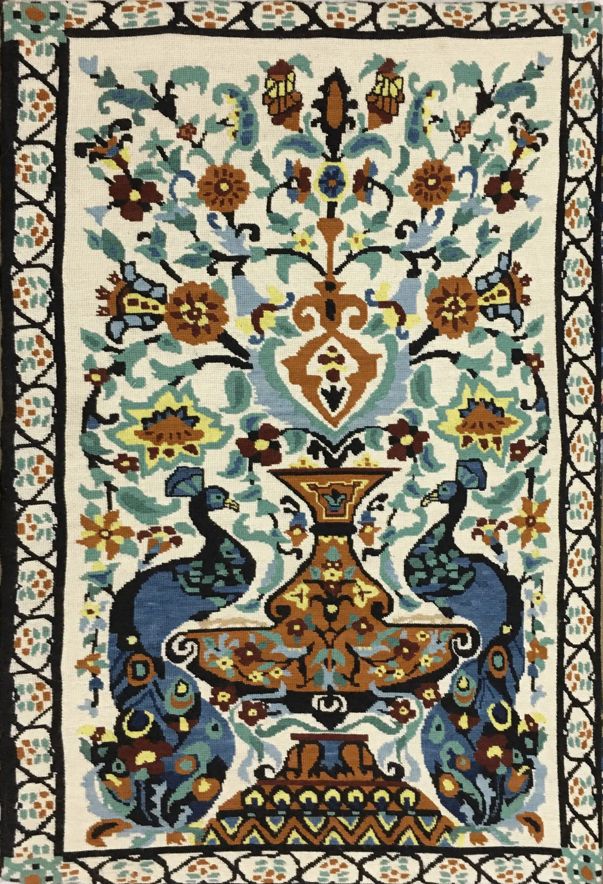This Artwork showcases a breathtaking Persian-inspired design, featuring two majestic peacocks flanking a central ornamental vase. Surrounding the focal point is a lush floral pattern, bursting with vibrant hues of blue, green, terracotta, and gold. The border, adorned with an elegant geometric pattern, frames the piece perfectly, creating a harmonious blend of nature and artistry.
