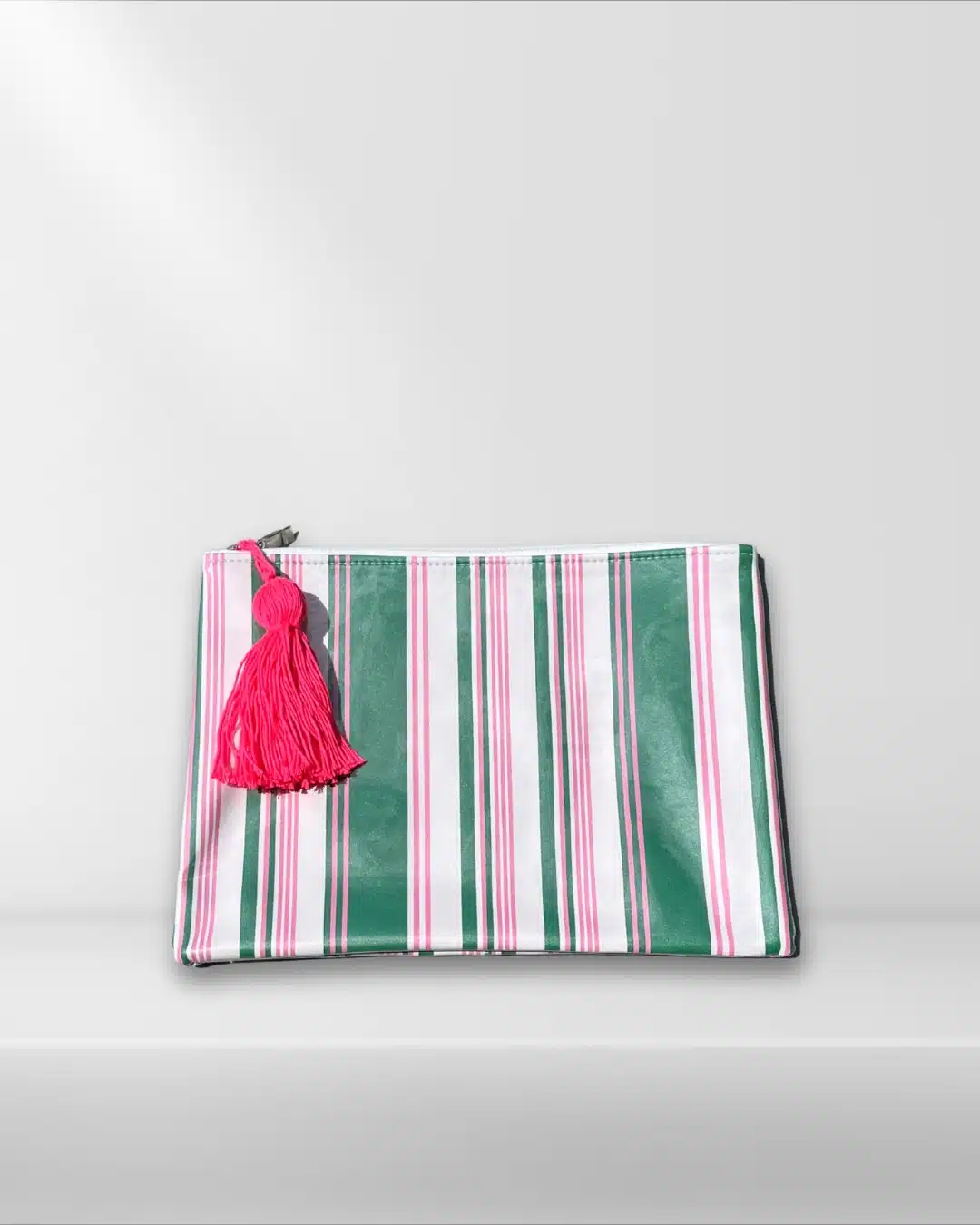 Plastic Wrapped Pouch size 25x35cm , in green & pink striped pattern with fuchsia tassel,