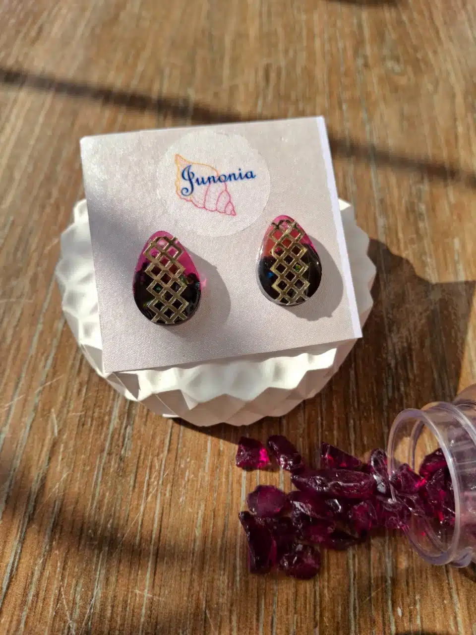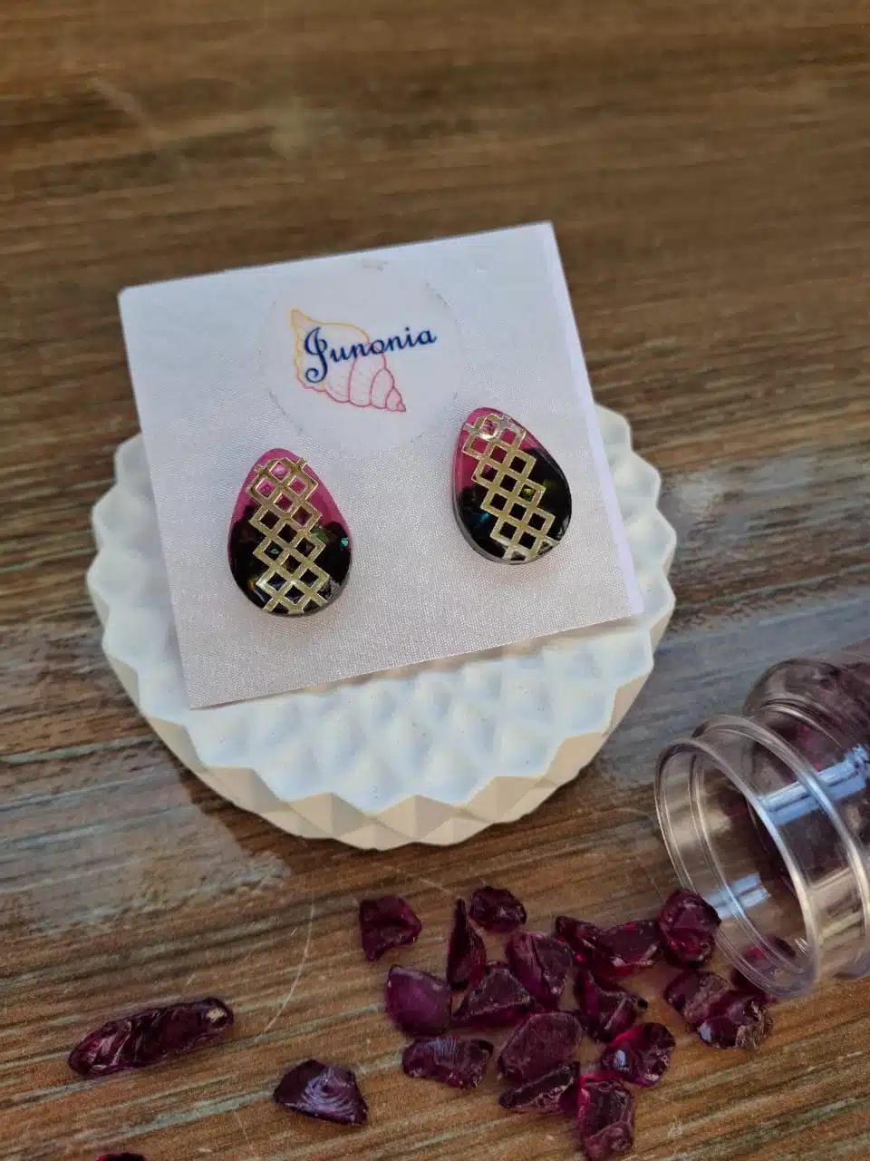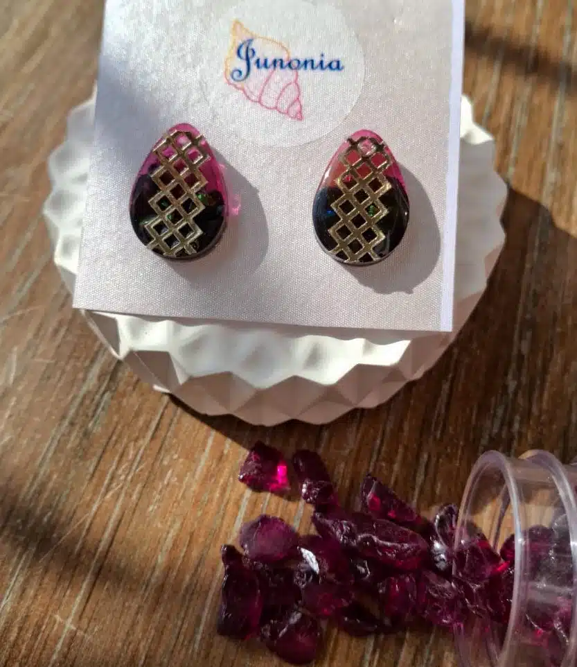 Resin Earrings. Magenta and black with golden pattern.