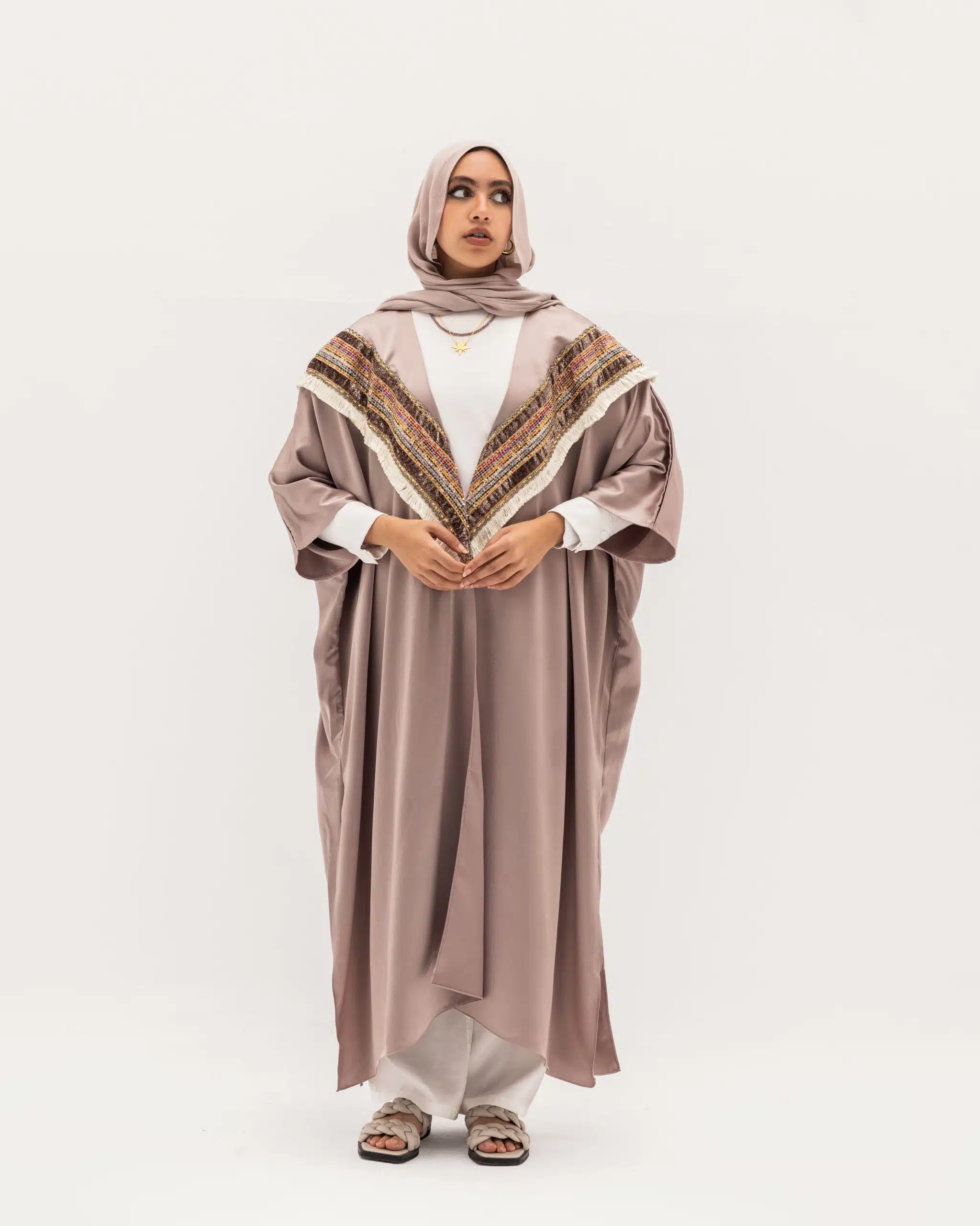 Unique design abaya style with valuable Indian decorative strap on the chest.