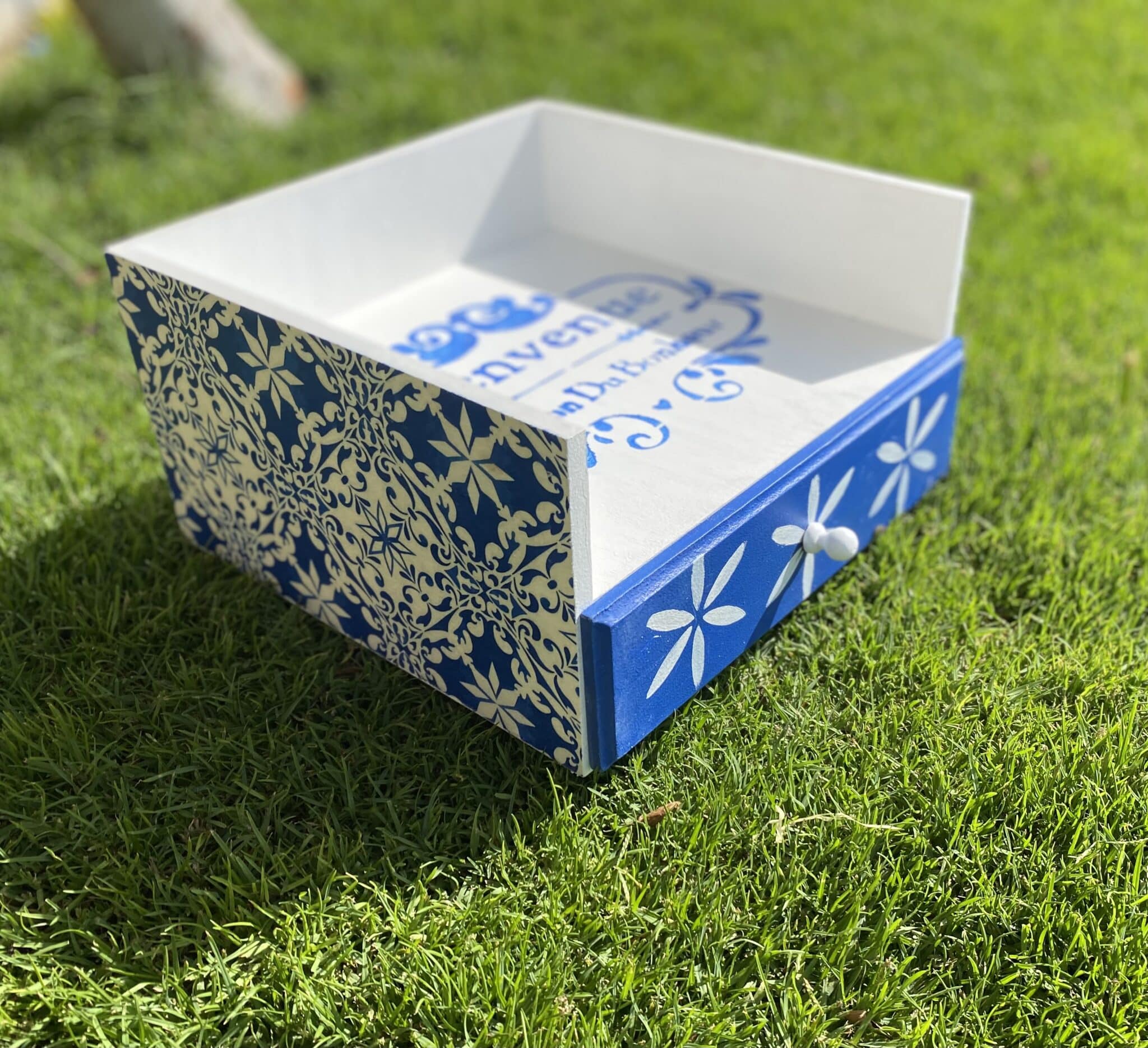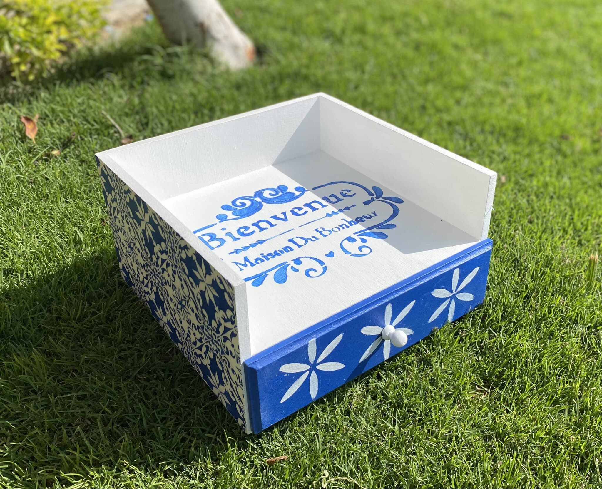 Wooden Plates & Cutlery organizer with drawer with Santorini design and colors