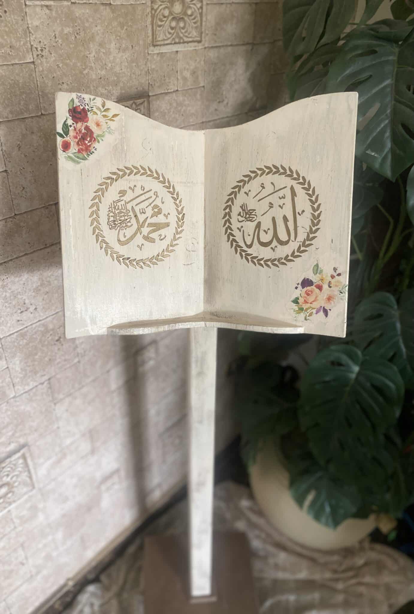 Wooden Prayer Corner: Mushaf Stand Fleuri beige x brown and matching prayer wear box