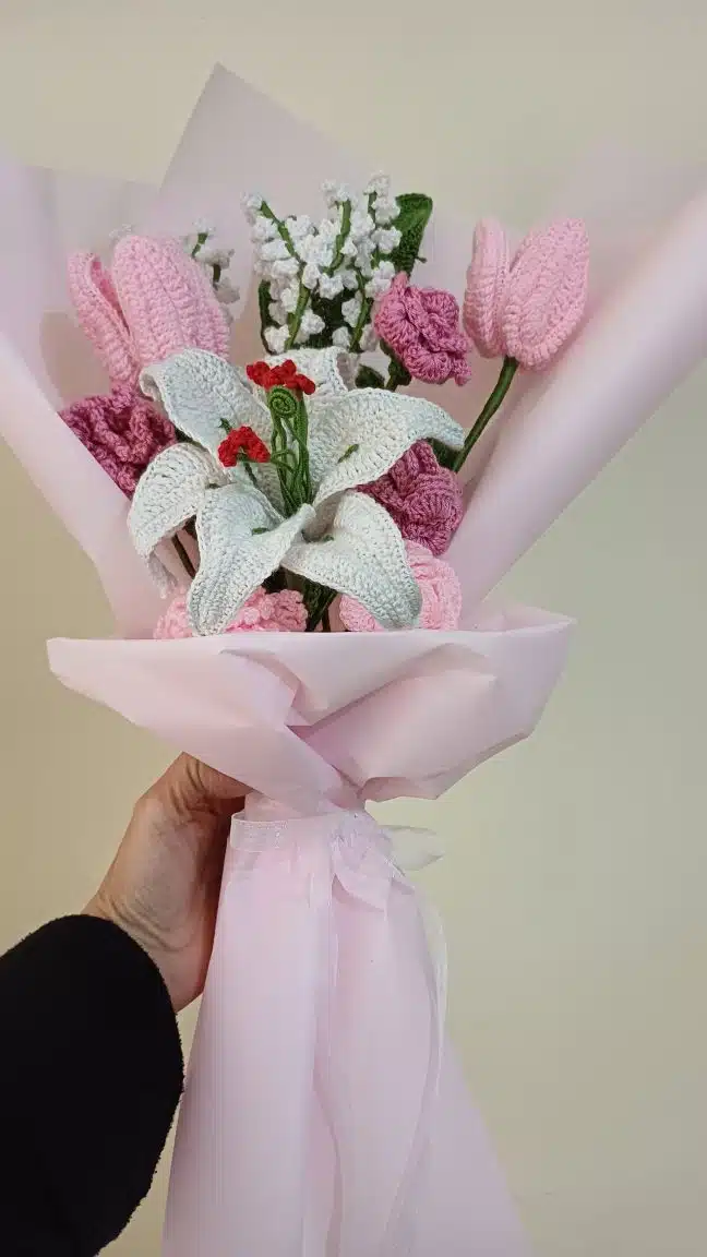 1 Lily + 2 Tulips + 4 Roses + 2 Carnations + 3 Gypsophilas + 1 Sun Greenery.