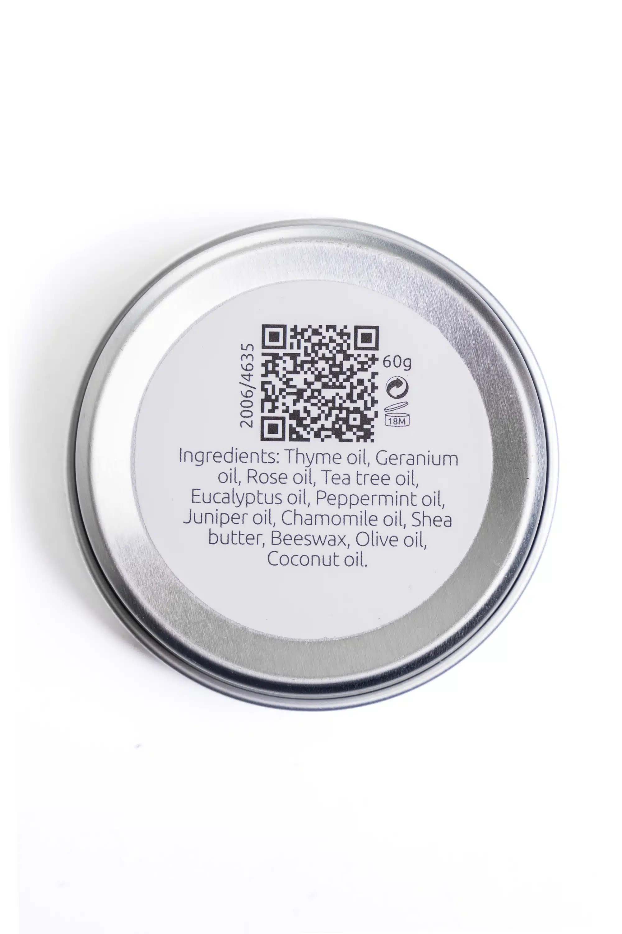 Thyme oil, Geranium oil, Rose oil, Tea tree oil, Eucalyptus oil, Peppermint oil, Juniper oil, Chamomile oil, Shea butter, Beeswax, Olive oil, Coconut oil.