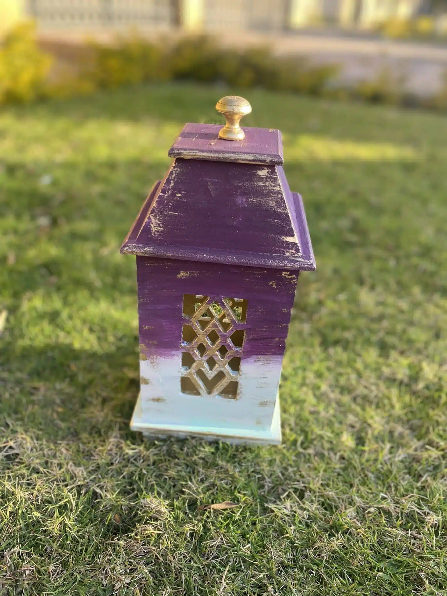Wooden fanous for Ramadan in purple x mint colors with touches of gold