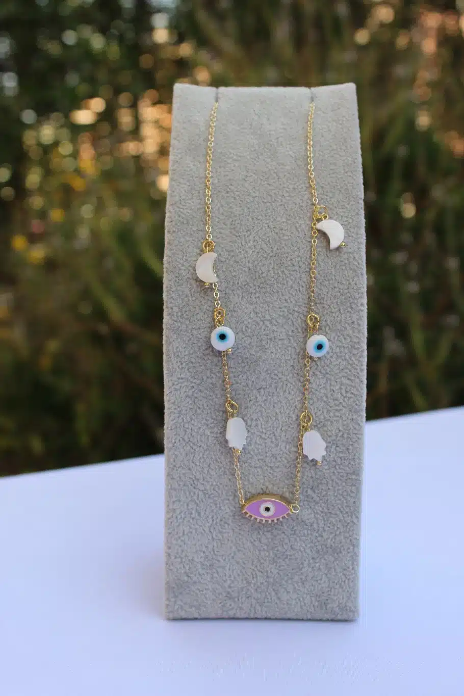 Necklace Chinese gold with evil eye & pearl charms.