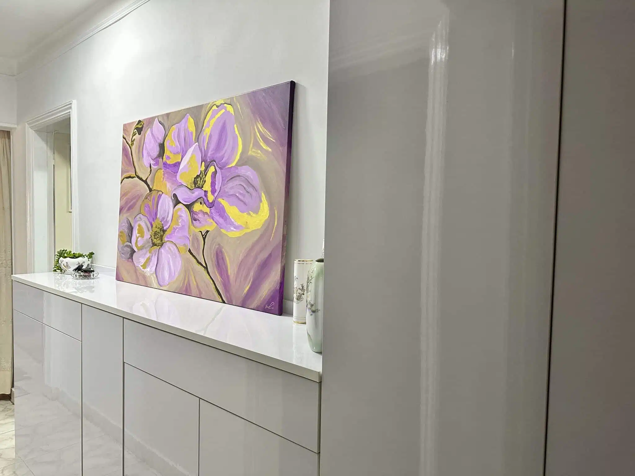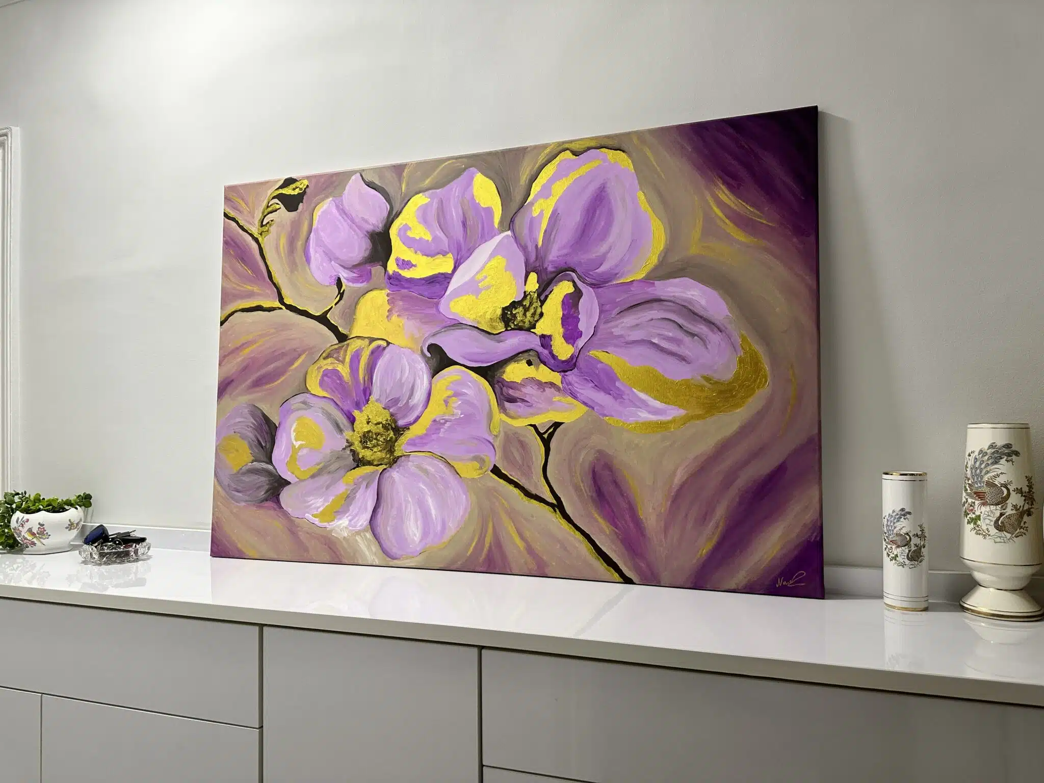 This is an acrylic painting of purple / rose flowers with touches of gold.