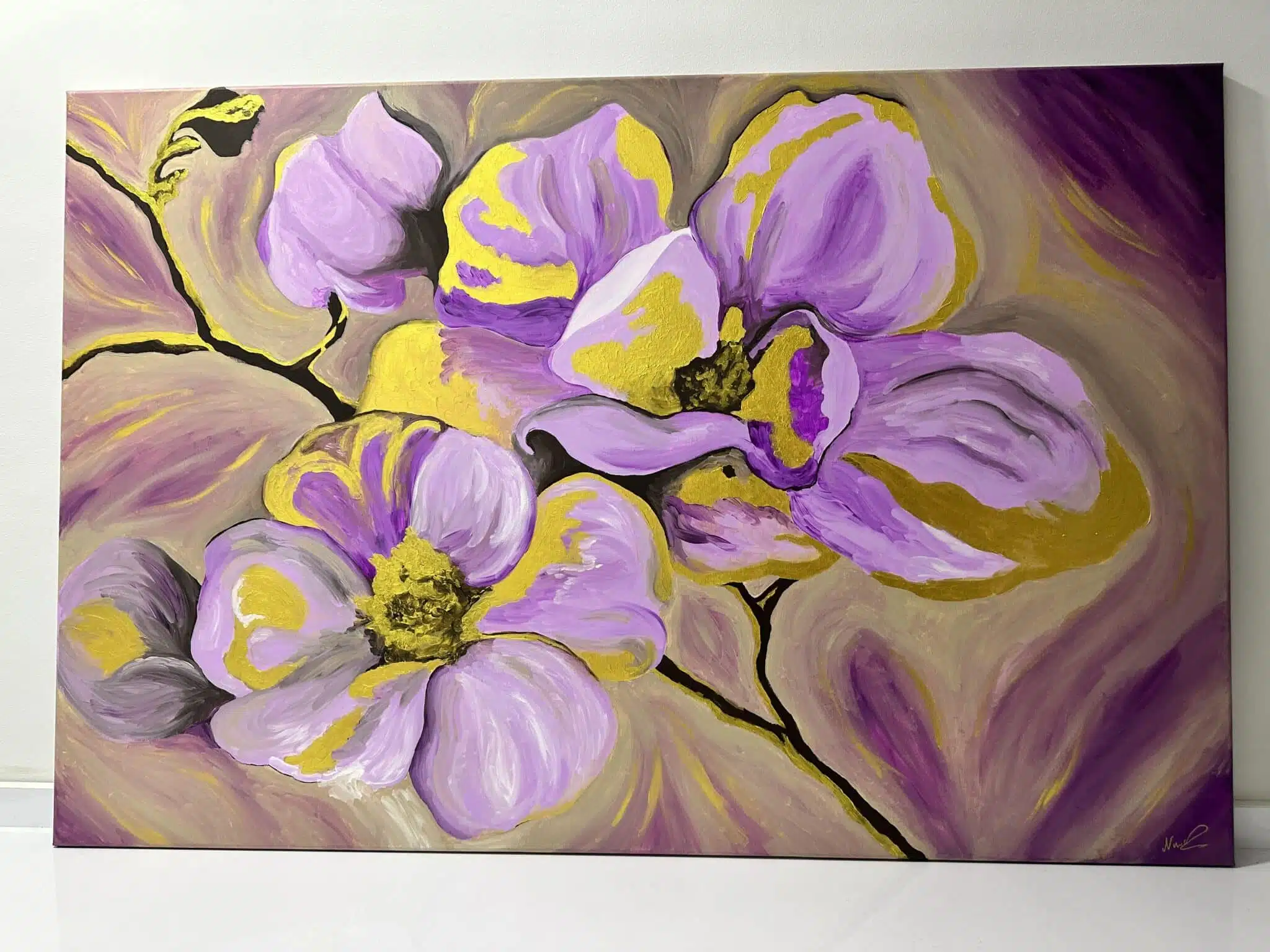 This is an acrylic painting of purple / rose flowers with touches of gold on canvas.
