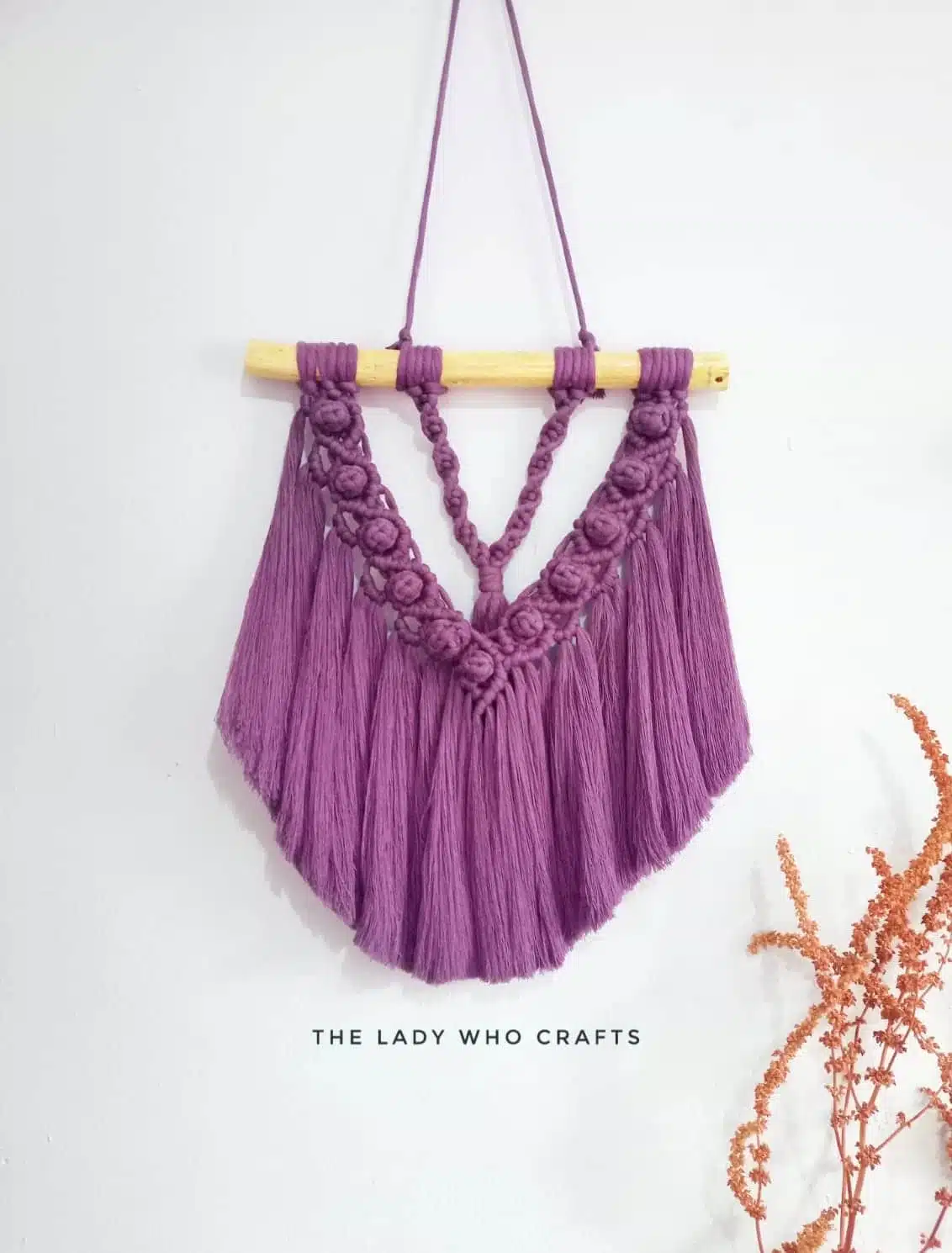 Small purple macrame wall hanging.