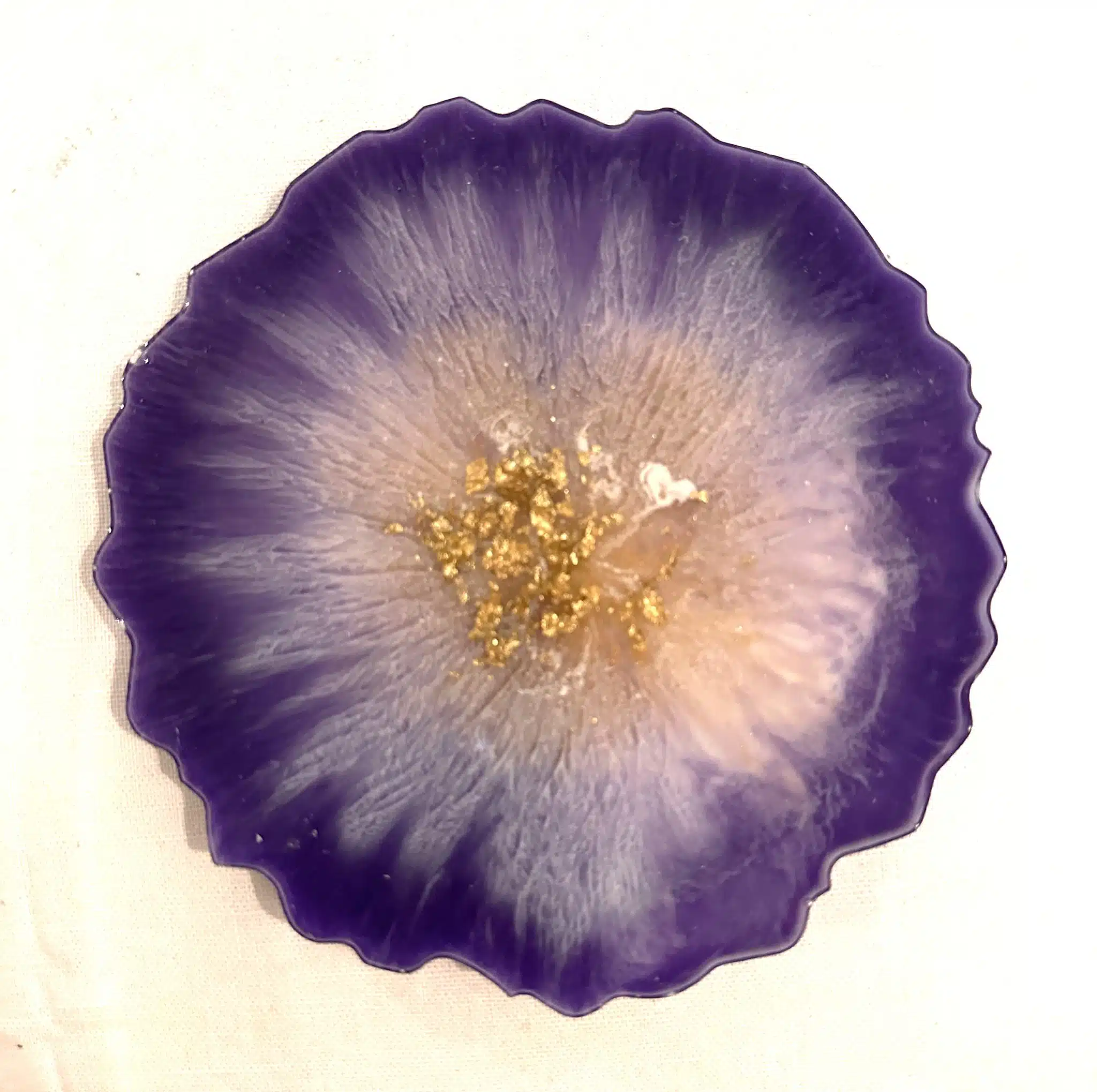 Round purple and white resin coaster, creating a flower like design with gold leaves in the center. Its size is around 13 cm.