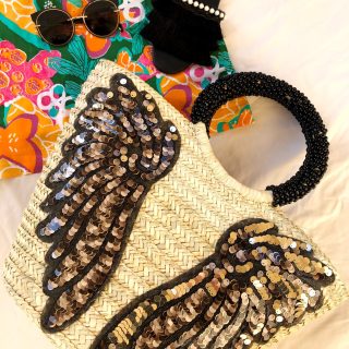 Handmade bag by raffia threads and embroidery flowers and beads on the top