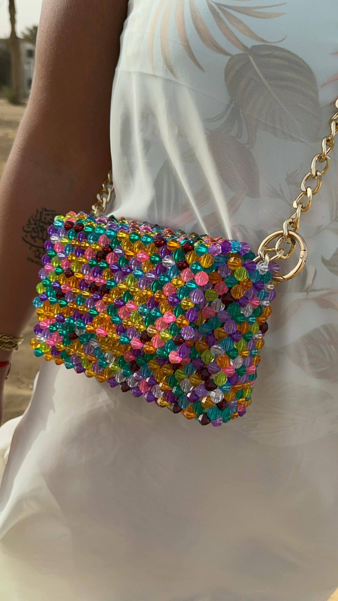 The Rainbow Bag is your go-to statement piece for summer days and nights. Handcrafted from colorful acrylic beads and finished with a chic gold chain, it’s the perfect mix of playful charm and polished elegance.