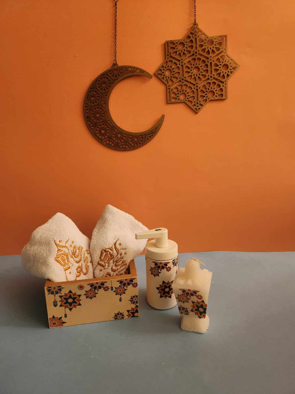 Ramadan set to add the holy month vibes to your bathroom decoration it consists of a glass soap dispenser ,candle and a wooden mdf box 15×15 cm with 2 matching guest towels 30×30