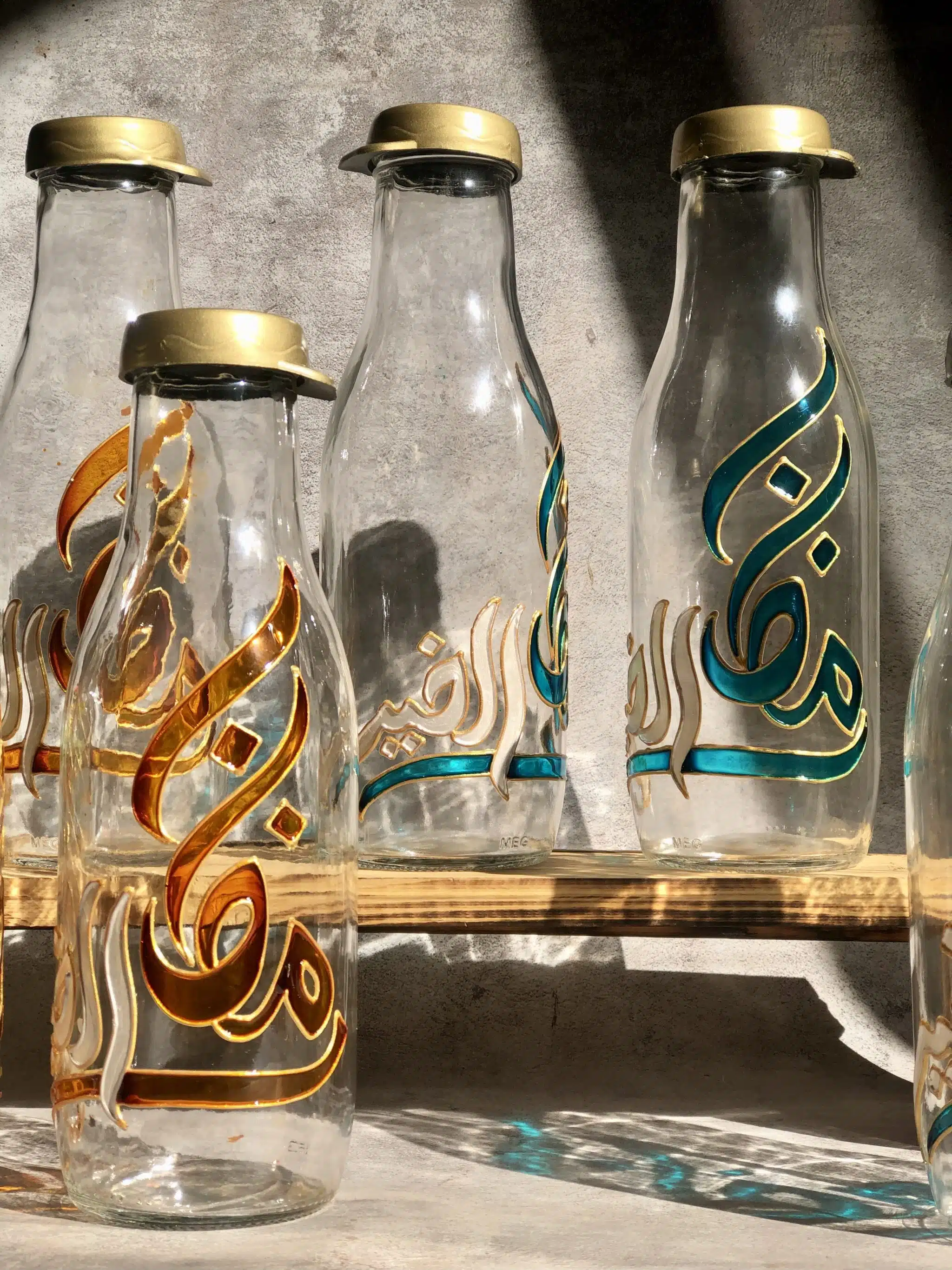 Hand painted Ramadan el_kerr caption on glass bottles