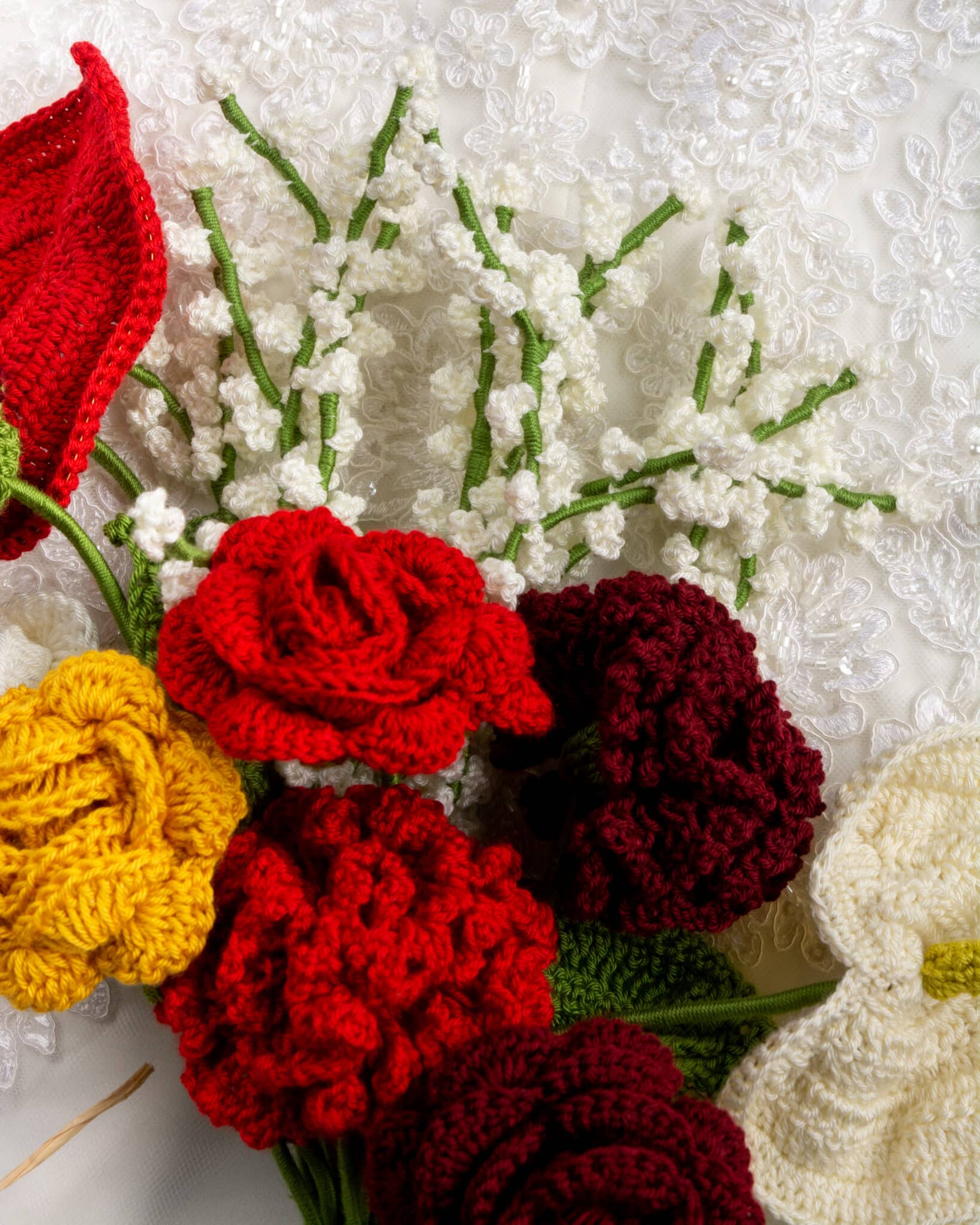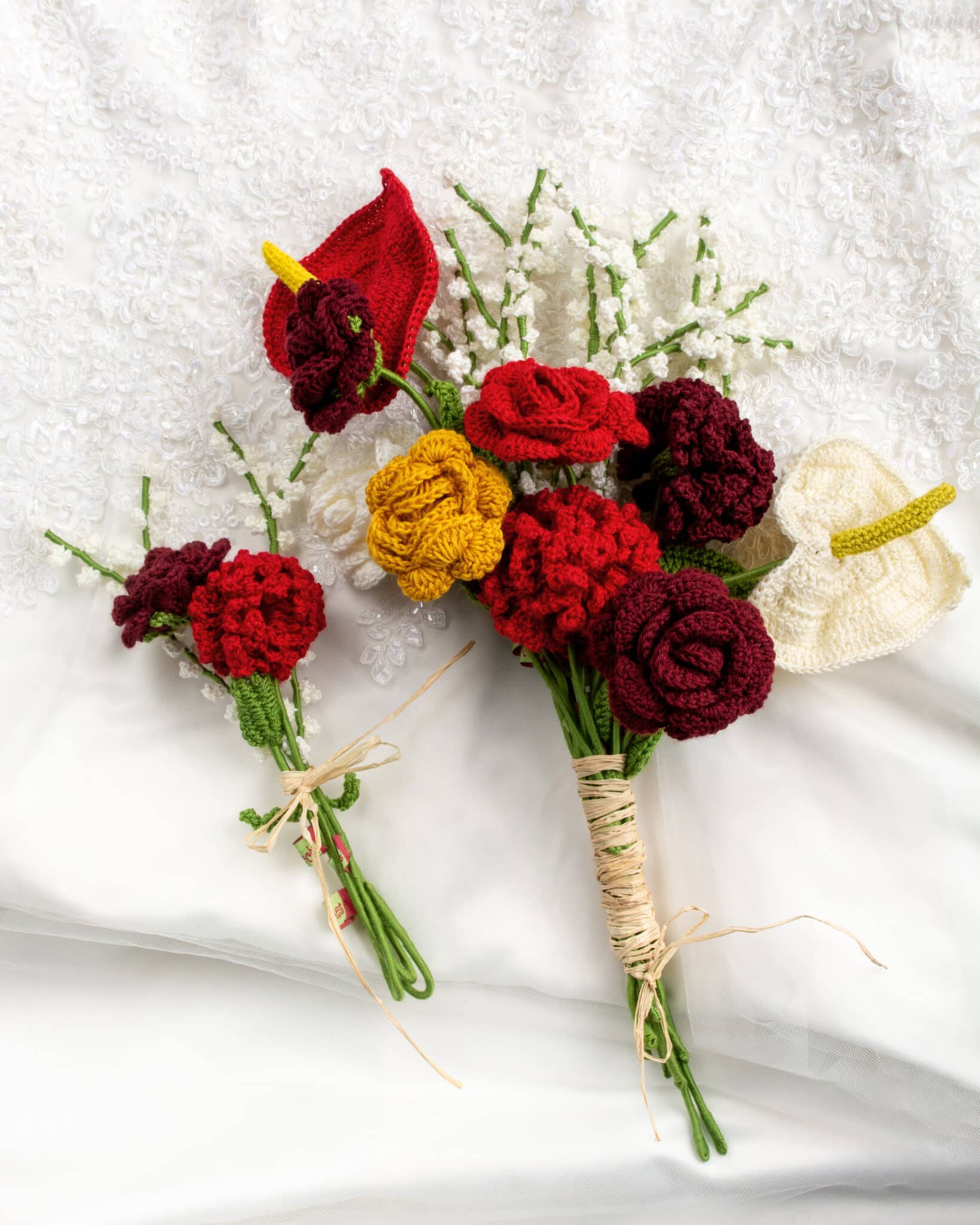 1 Red Rose, 1 Saffron Rose, 1 Light Cream Rose, 2 Bordeaux Roses, 1 Bordeaux Carnation, 1 Red Carnation, 1 Red Anthurium, 1 Light Cream Anthurium & 5 Light Cream Gypsophilas wrapped with natural raffia.