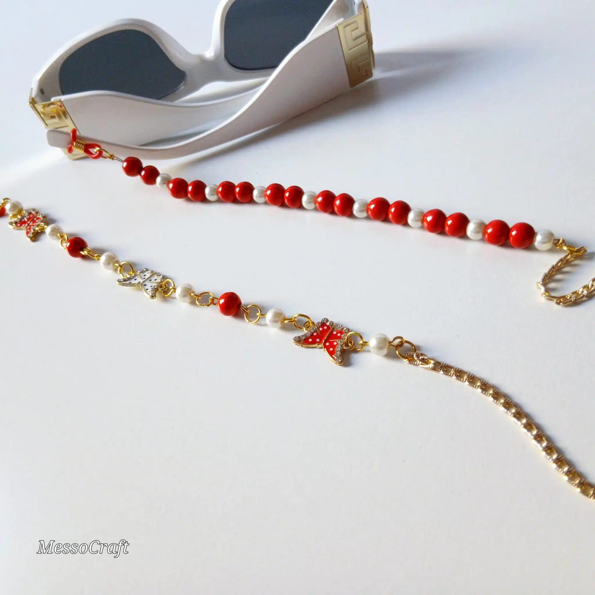 Glasses chain made of Red / white pearl stones with nice elegant 3 dotted butterflies pendants and chain Chinese gold