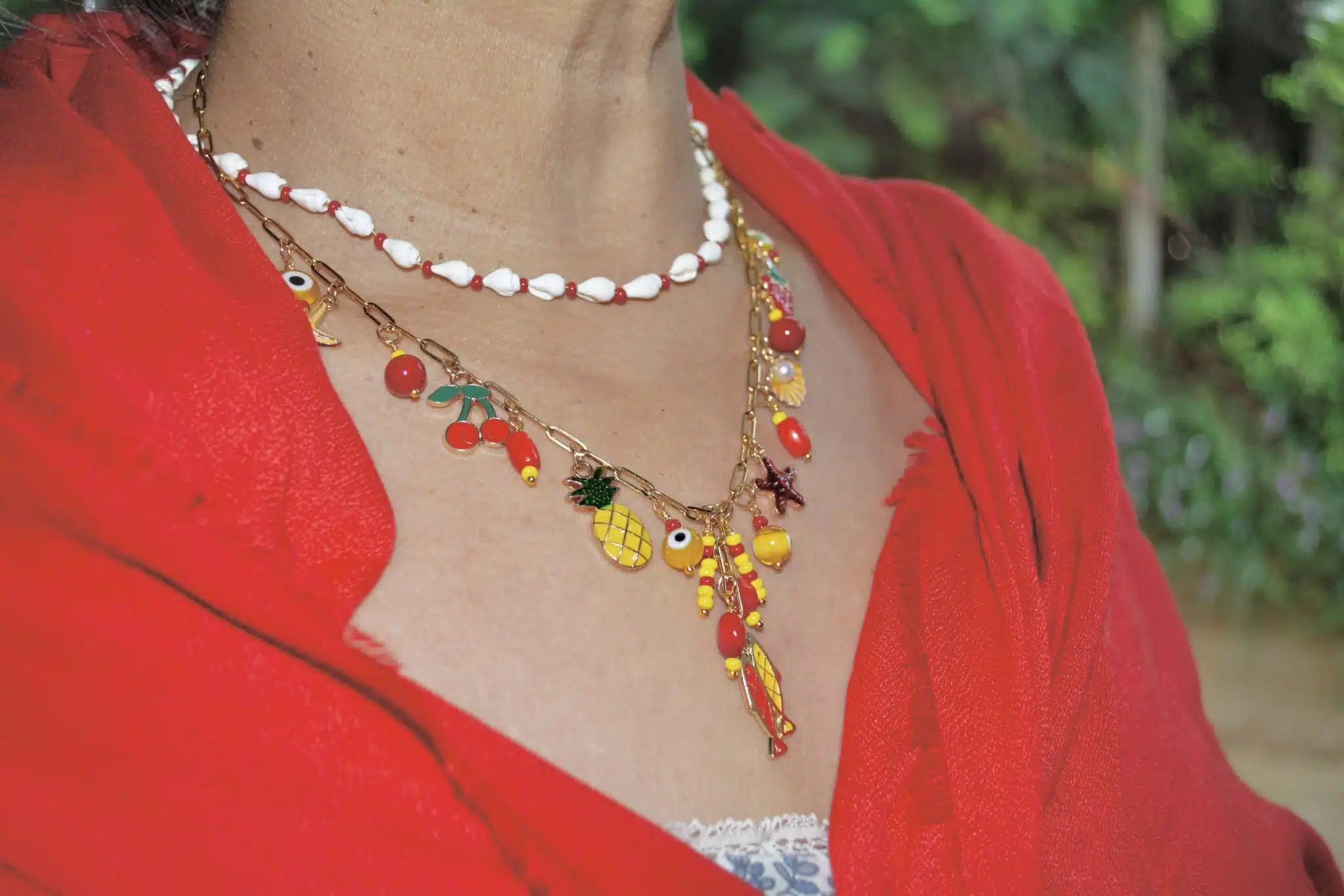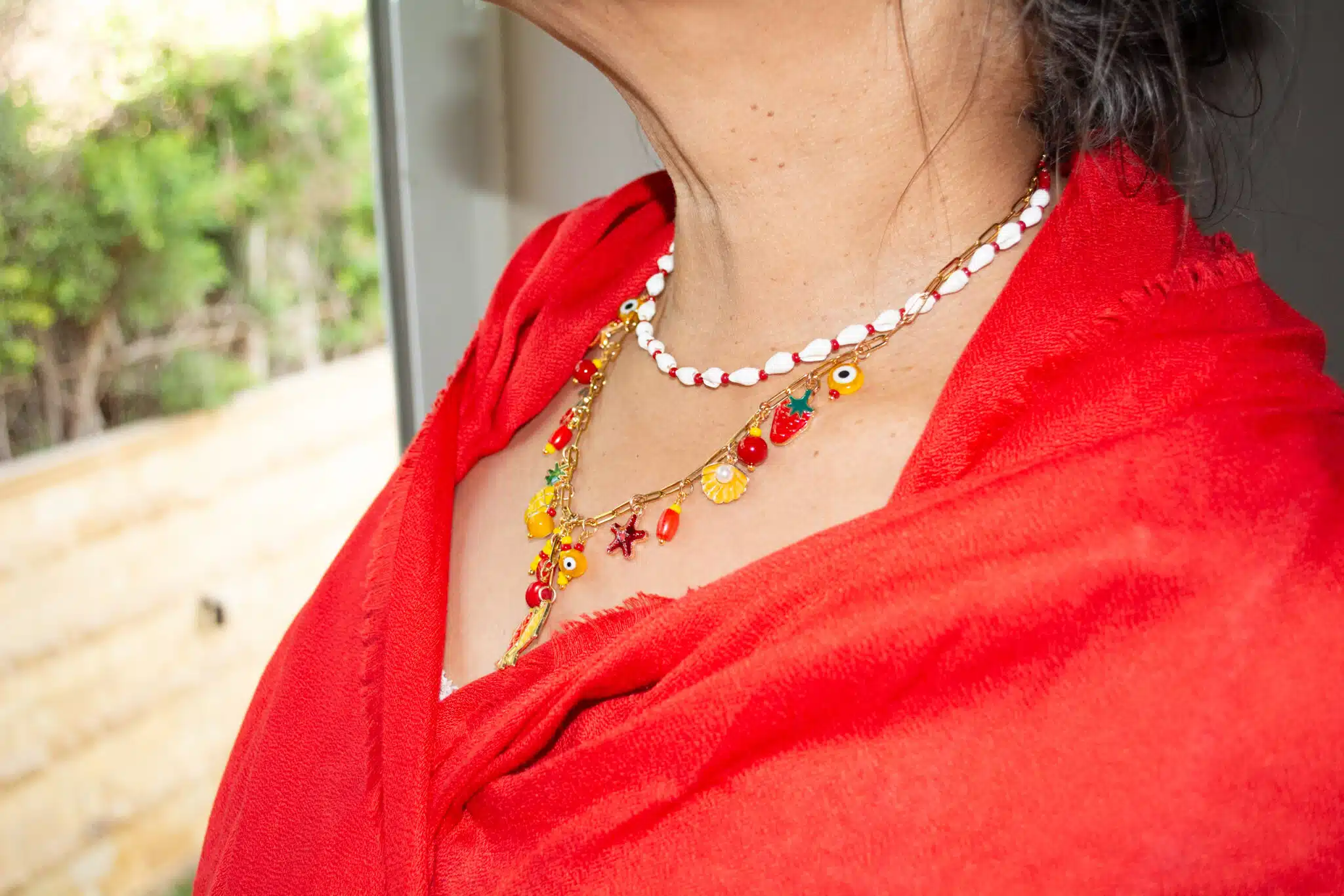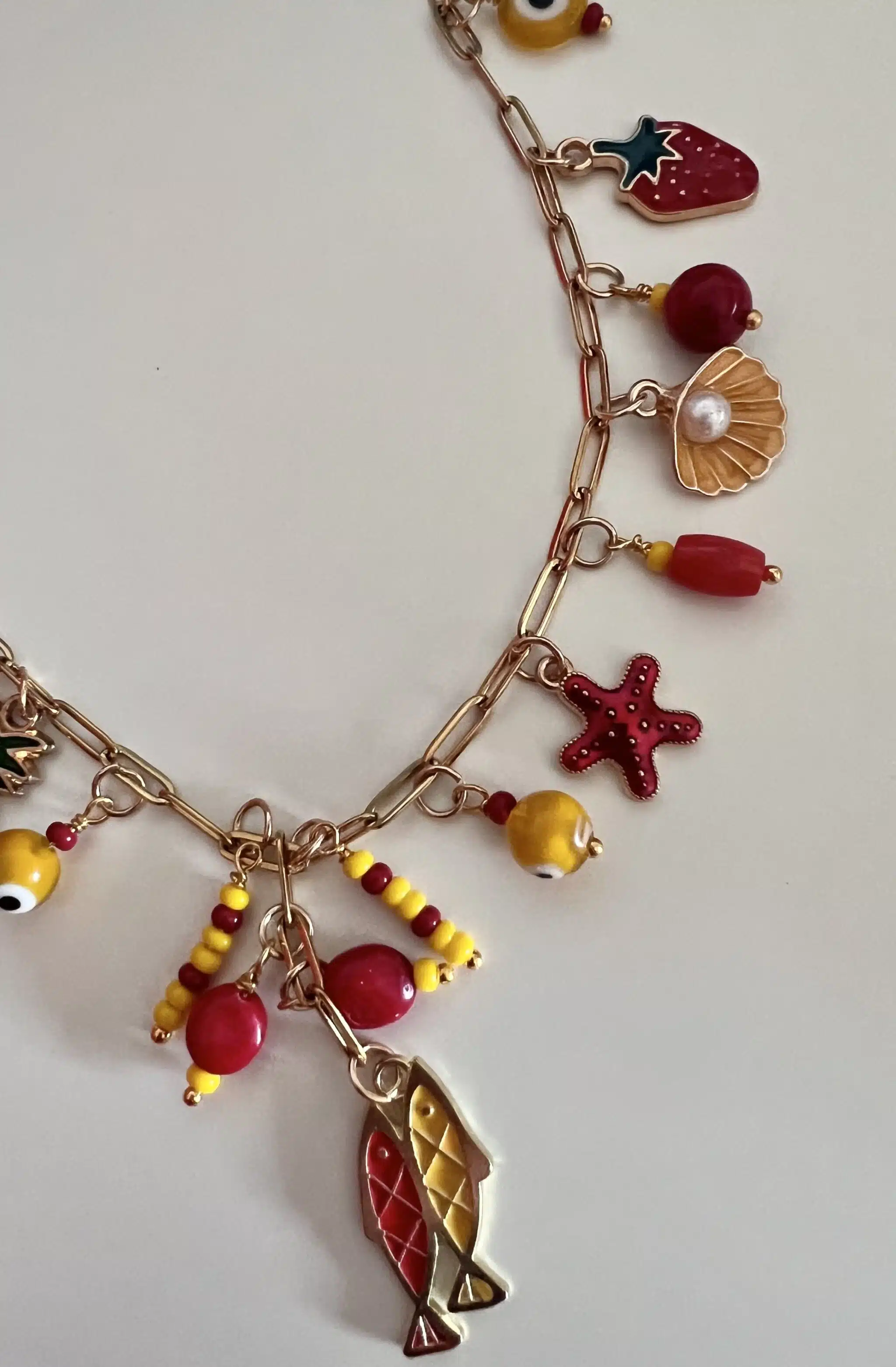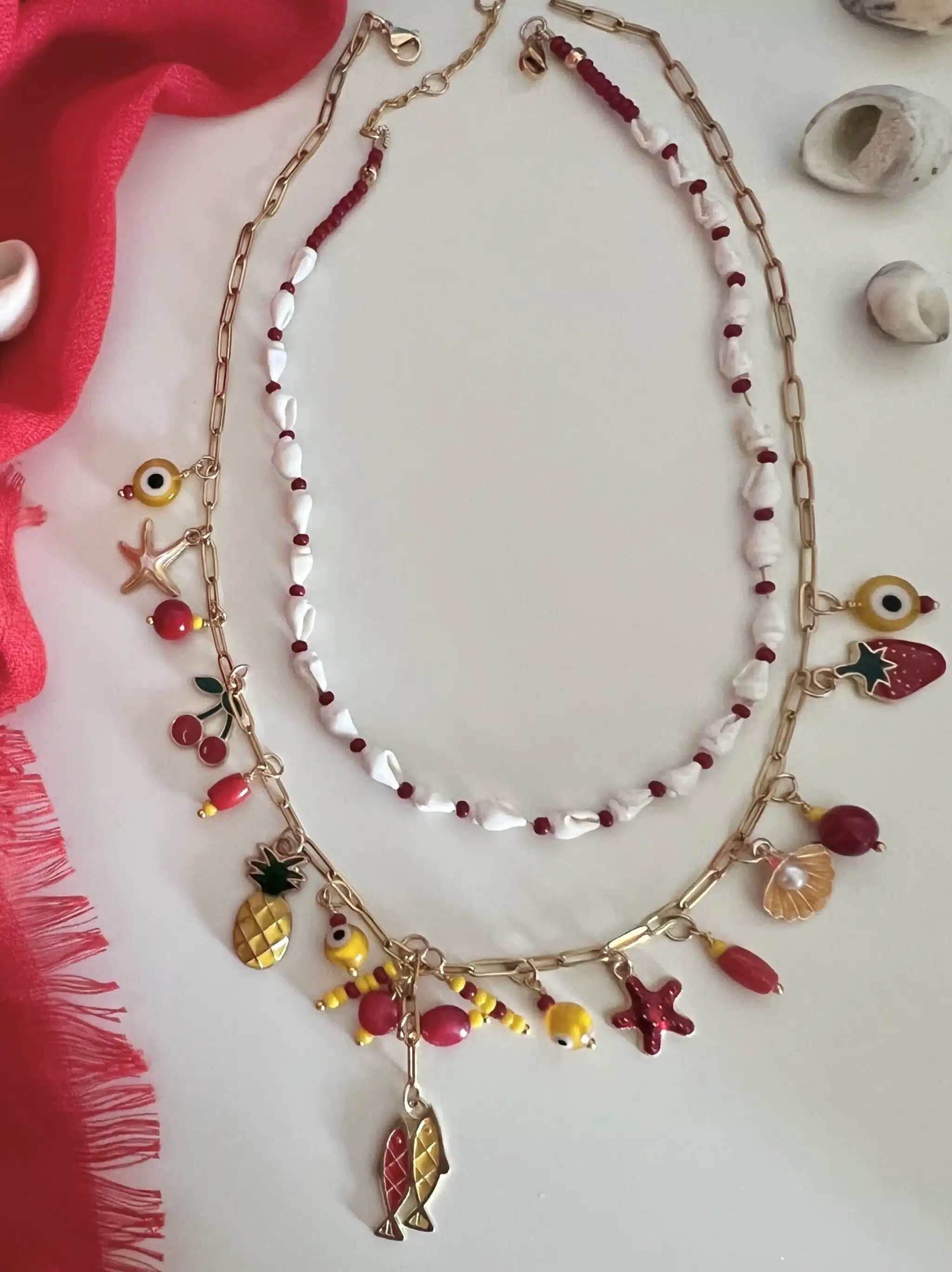 Red & yellow charms chain necklace, shell necklace. Sold separately