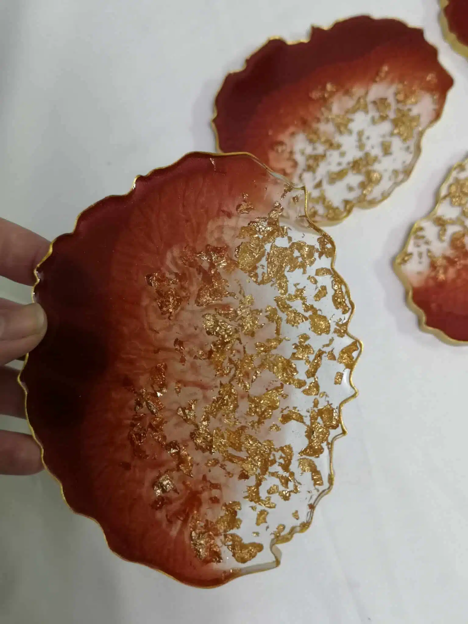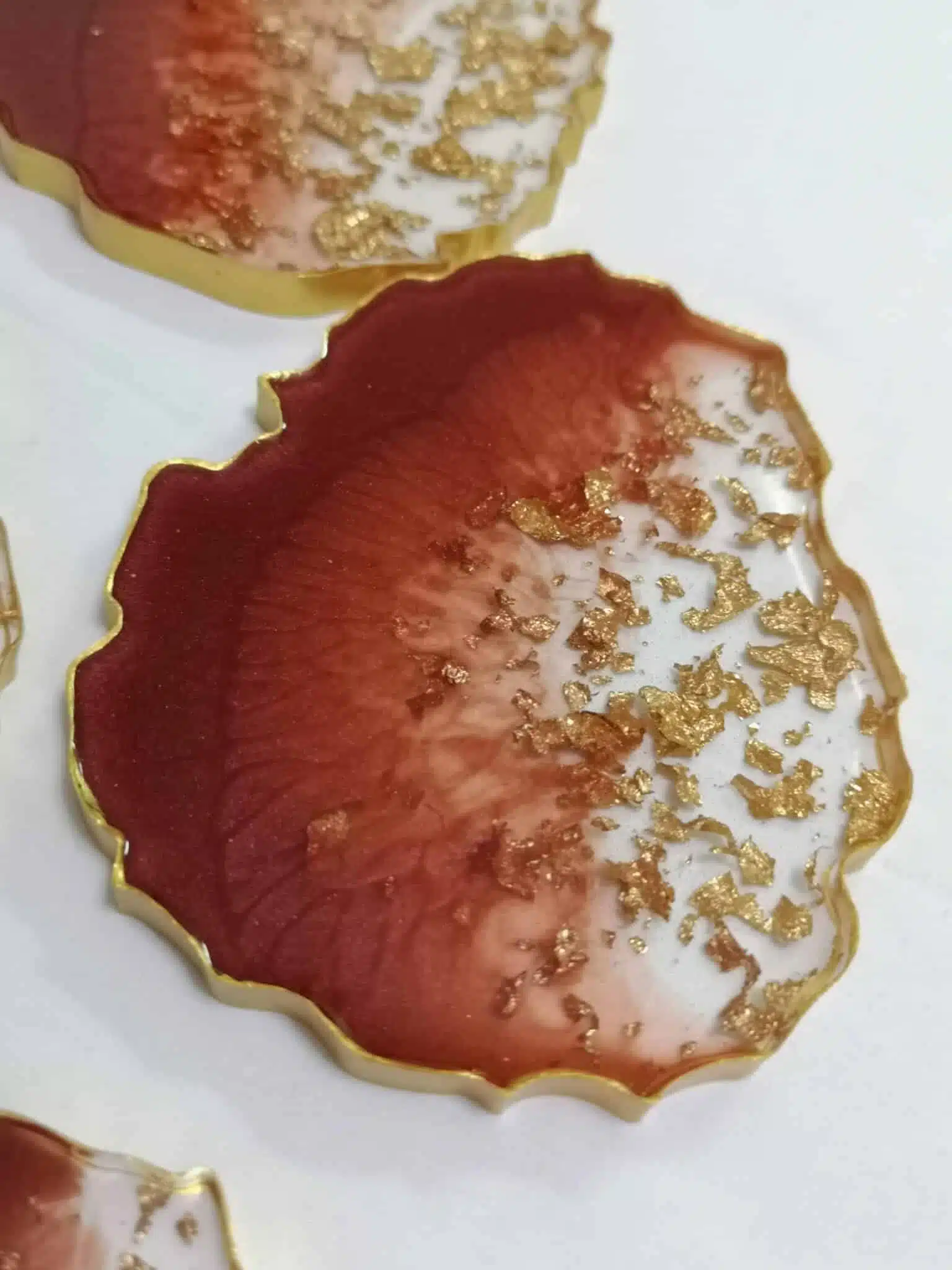 Oval bordeaux resin coasters with transparent resin and gold leaves. You can select from 3 different shapes.