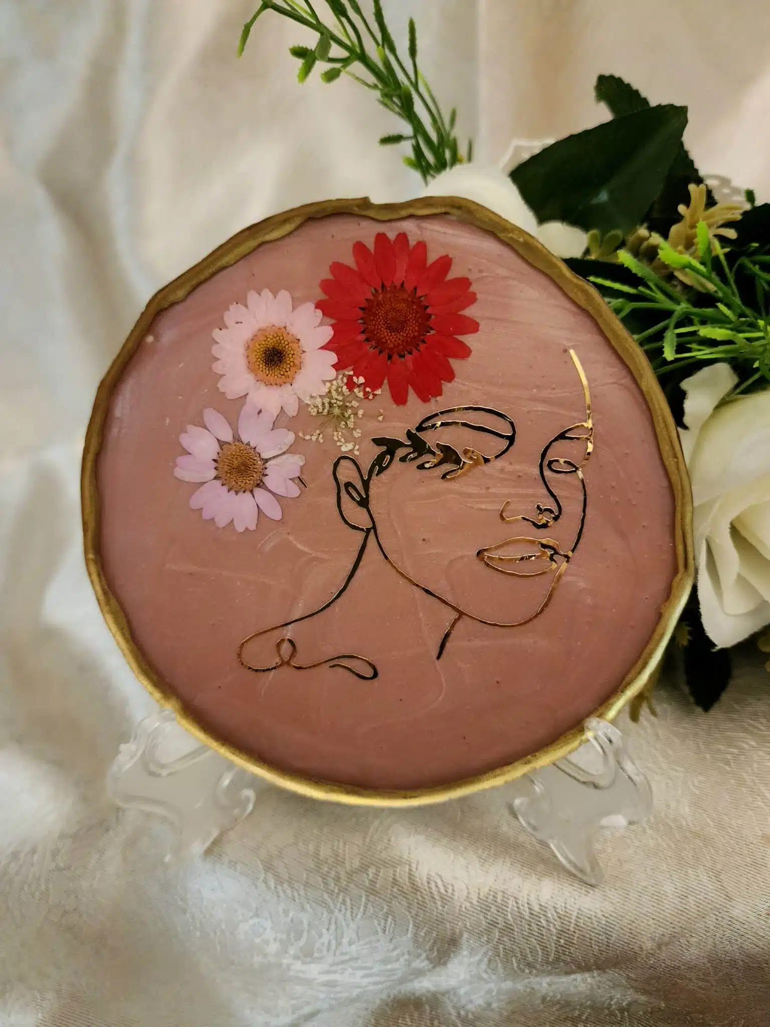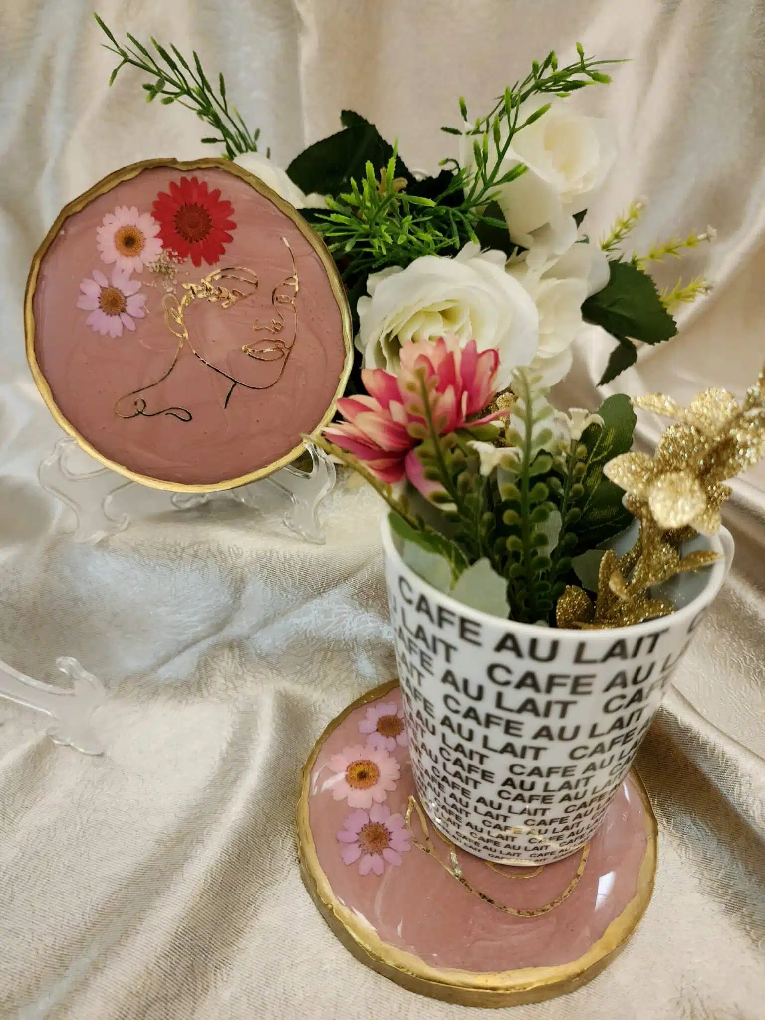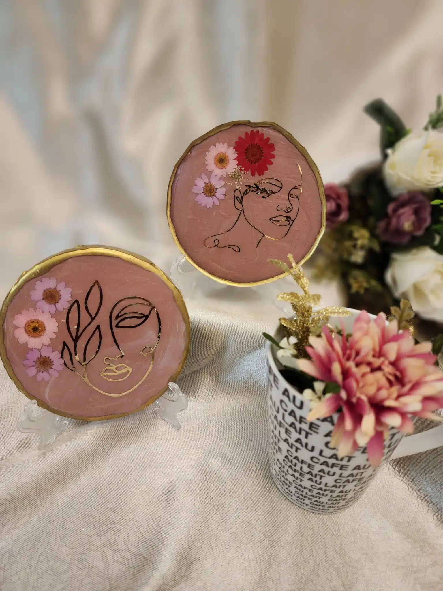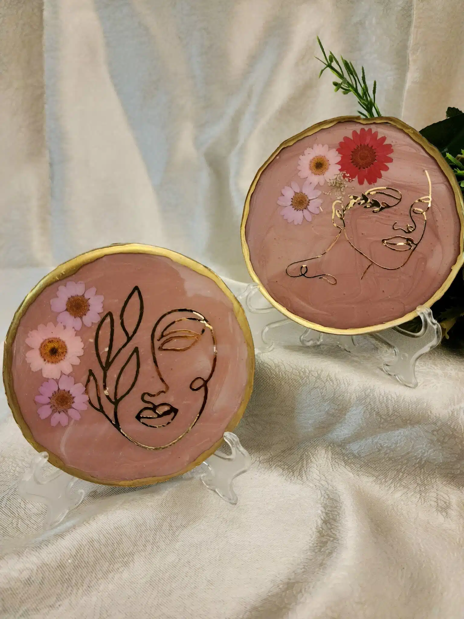 2 set Resin on wood coasters with real dried flowers and veneel cuts