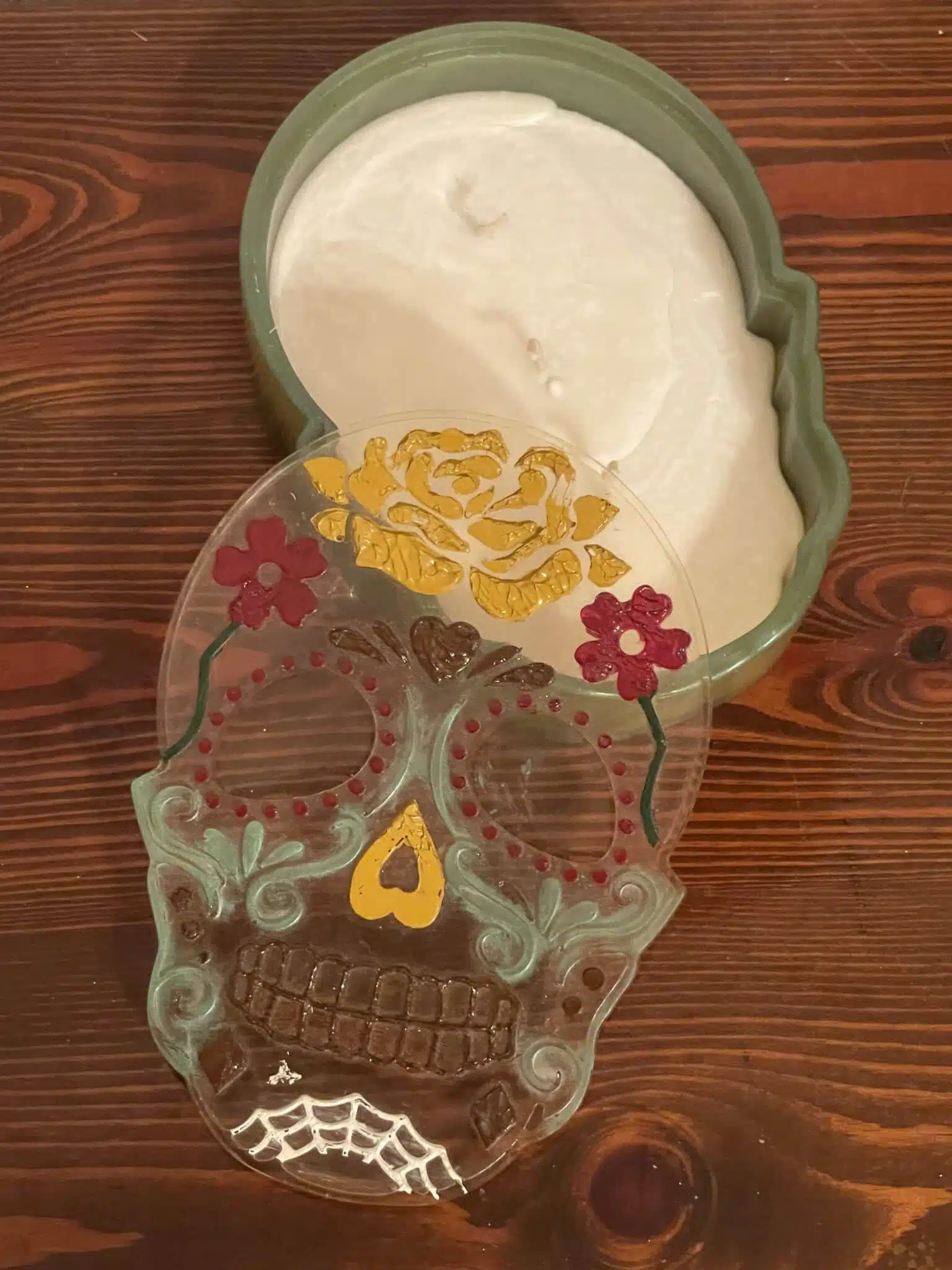 A resin skull box with a candle