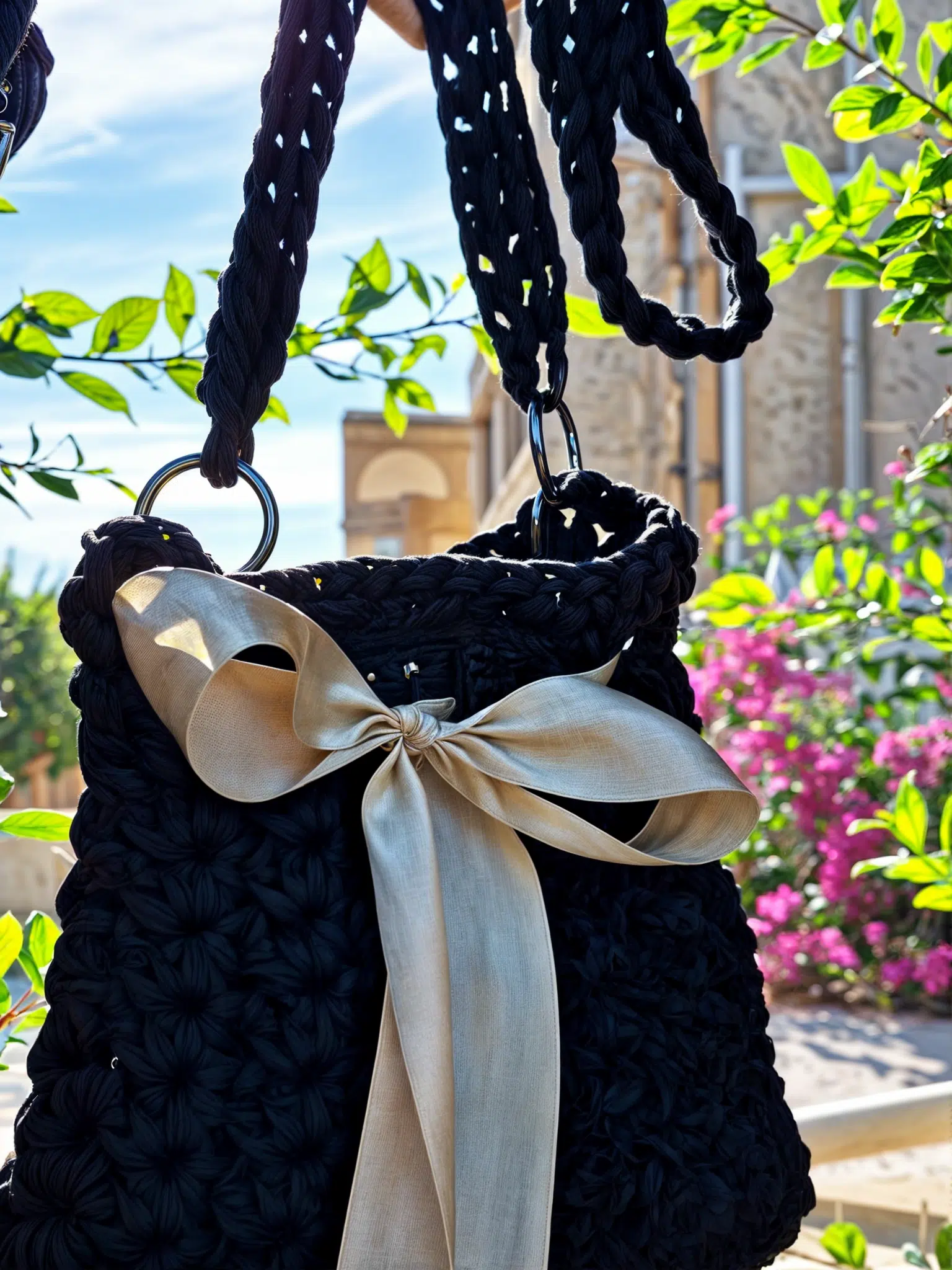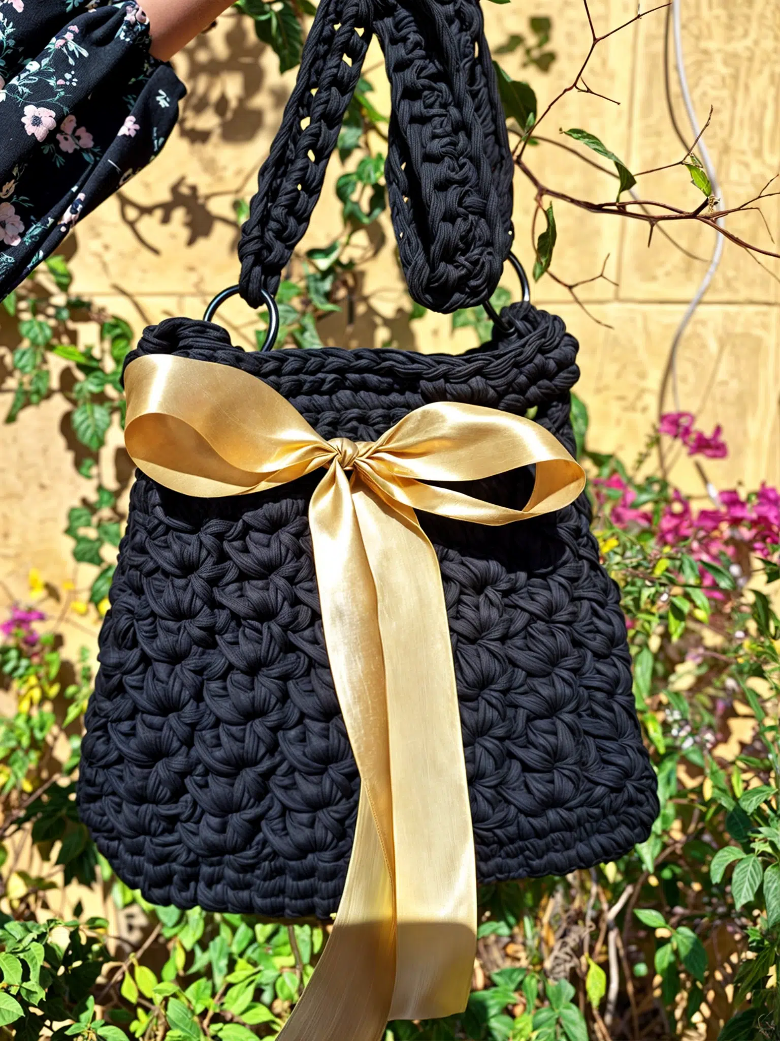 A handbag with a gold ribbon tied around it.