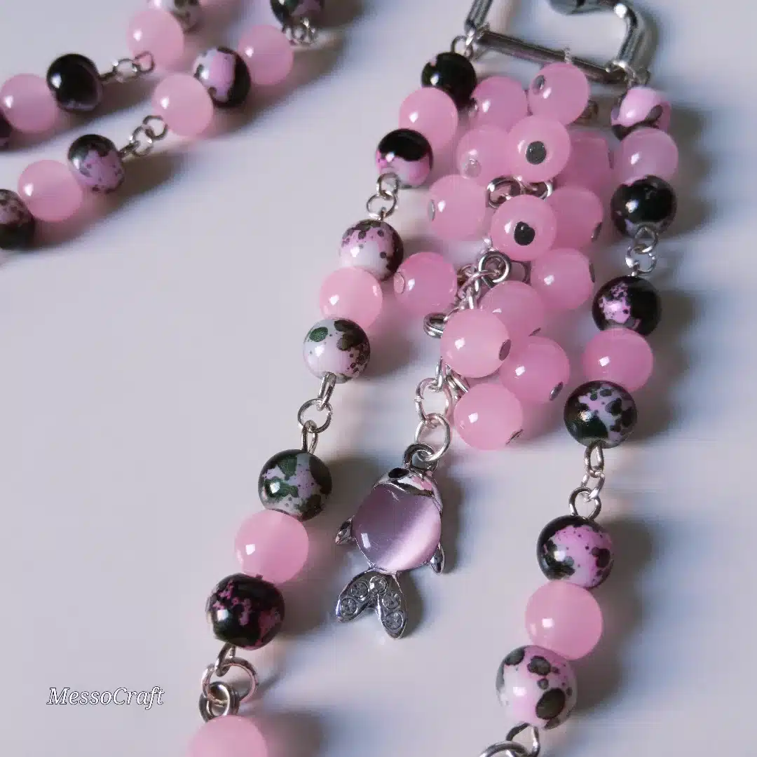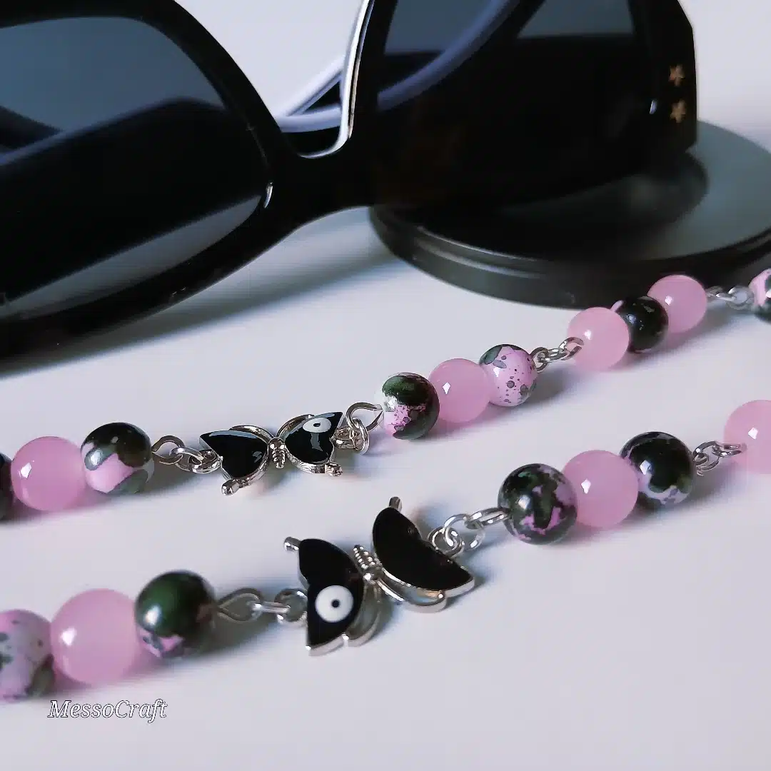 • Set consists of a bag charm and a glasses chain made of rose and mix black alabaster stones, hanged from bag charm a pendant in shape of a fish and in the glasses chain 2 black butterfly pendants