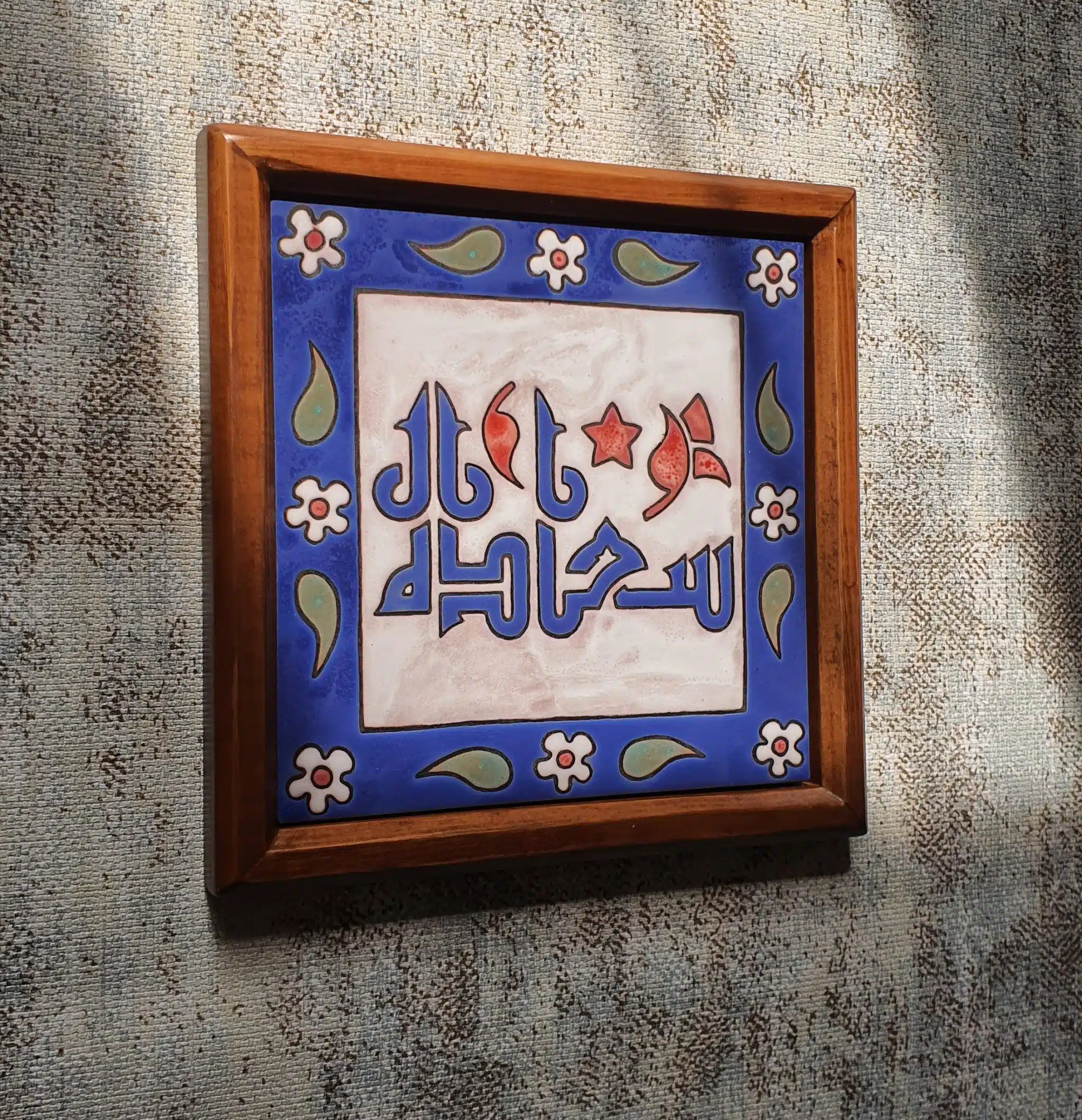 Hand made ceramic tile with wooden frame.