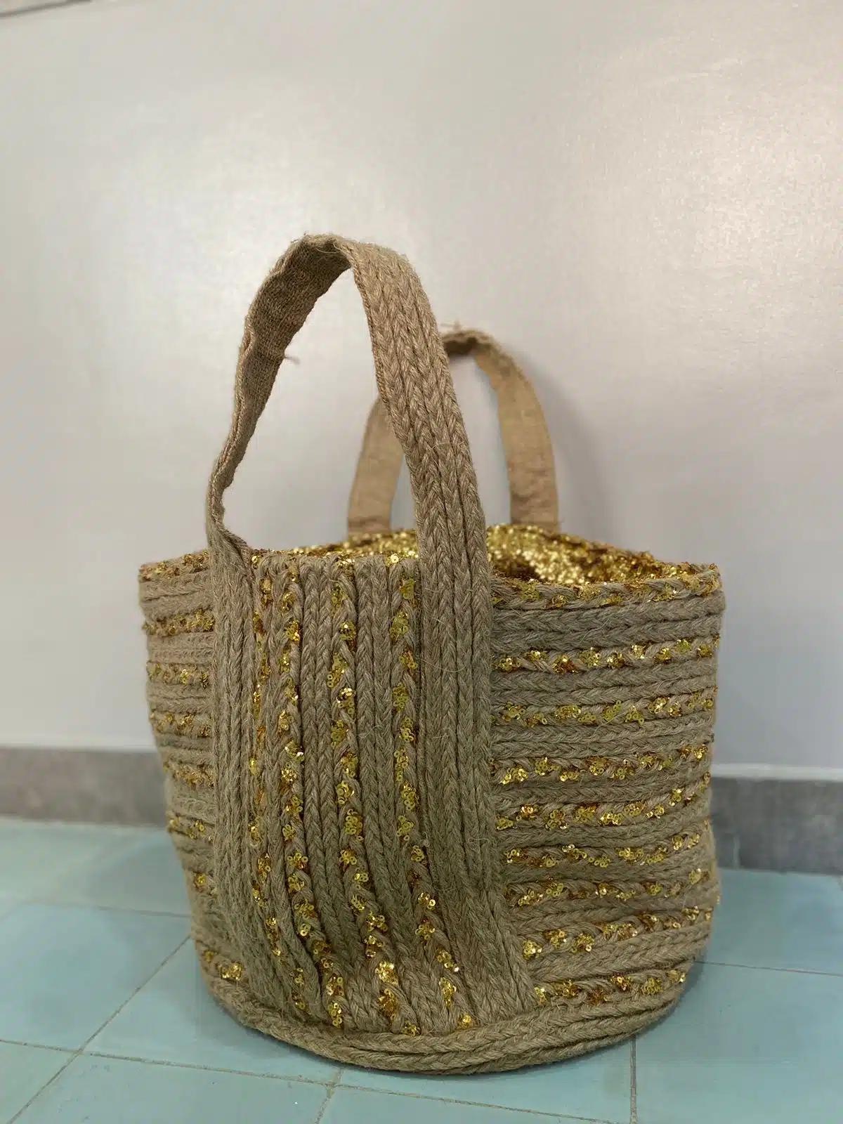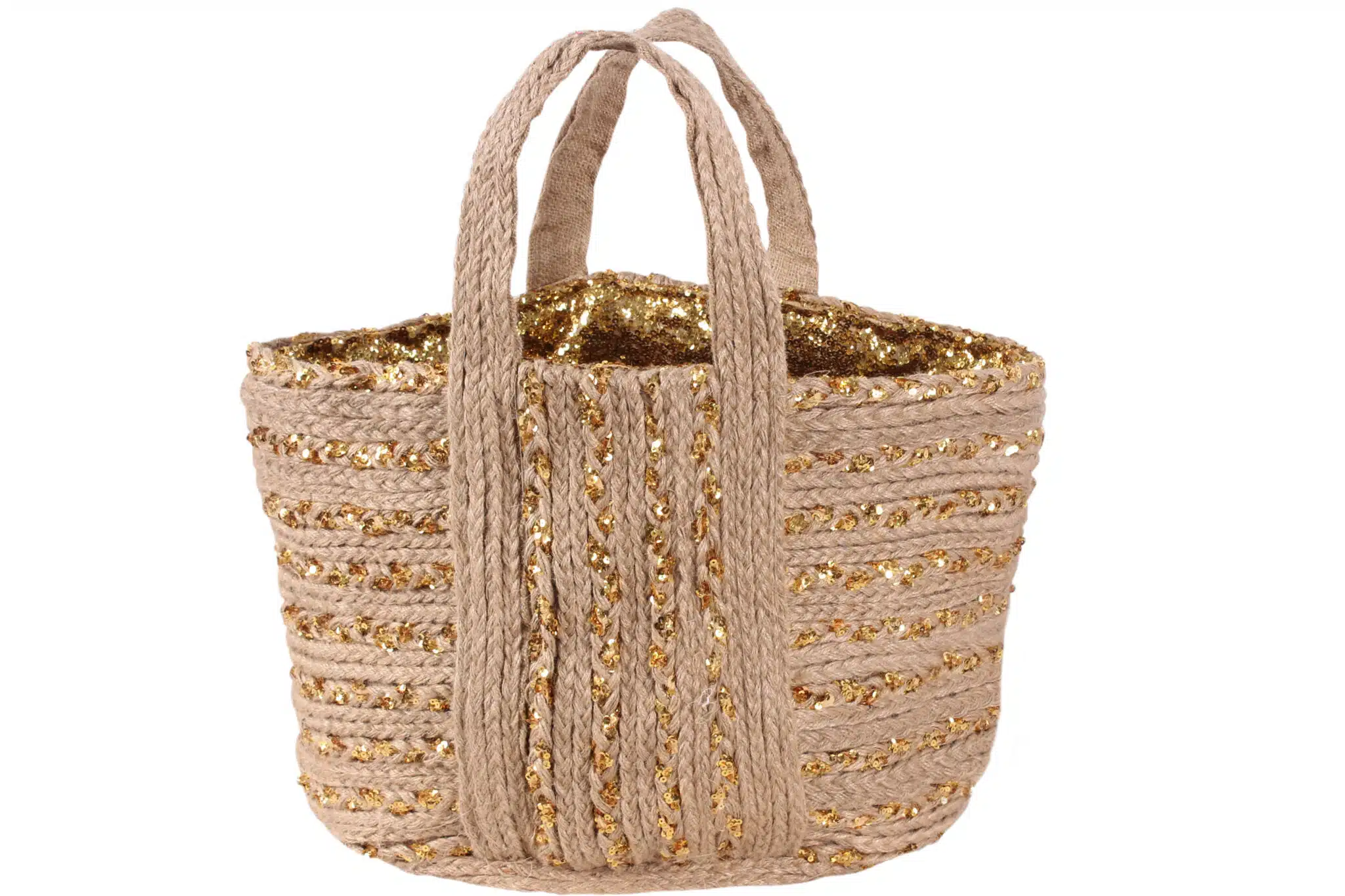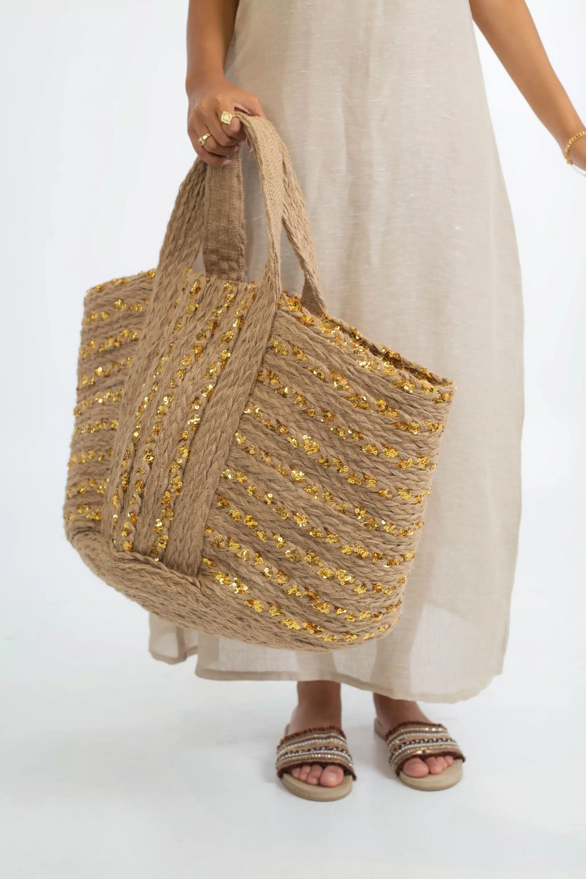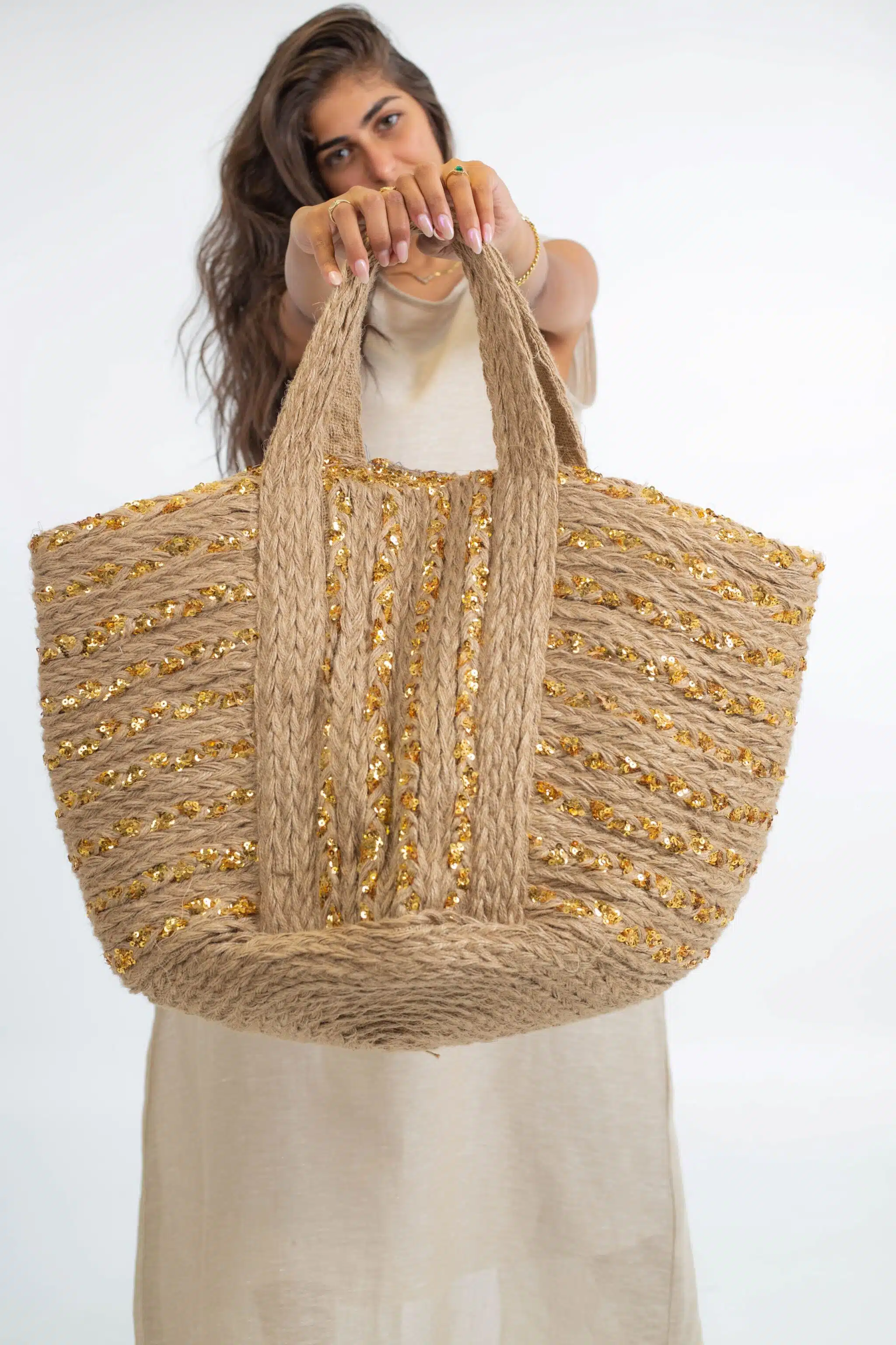 Sandsational Style: The Burlap Sequined Beach Bag in Gold