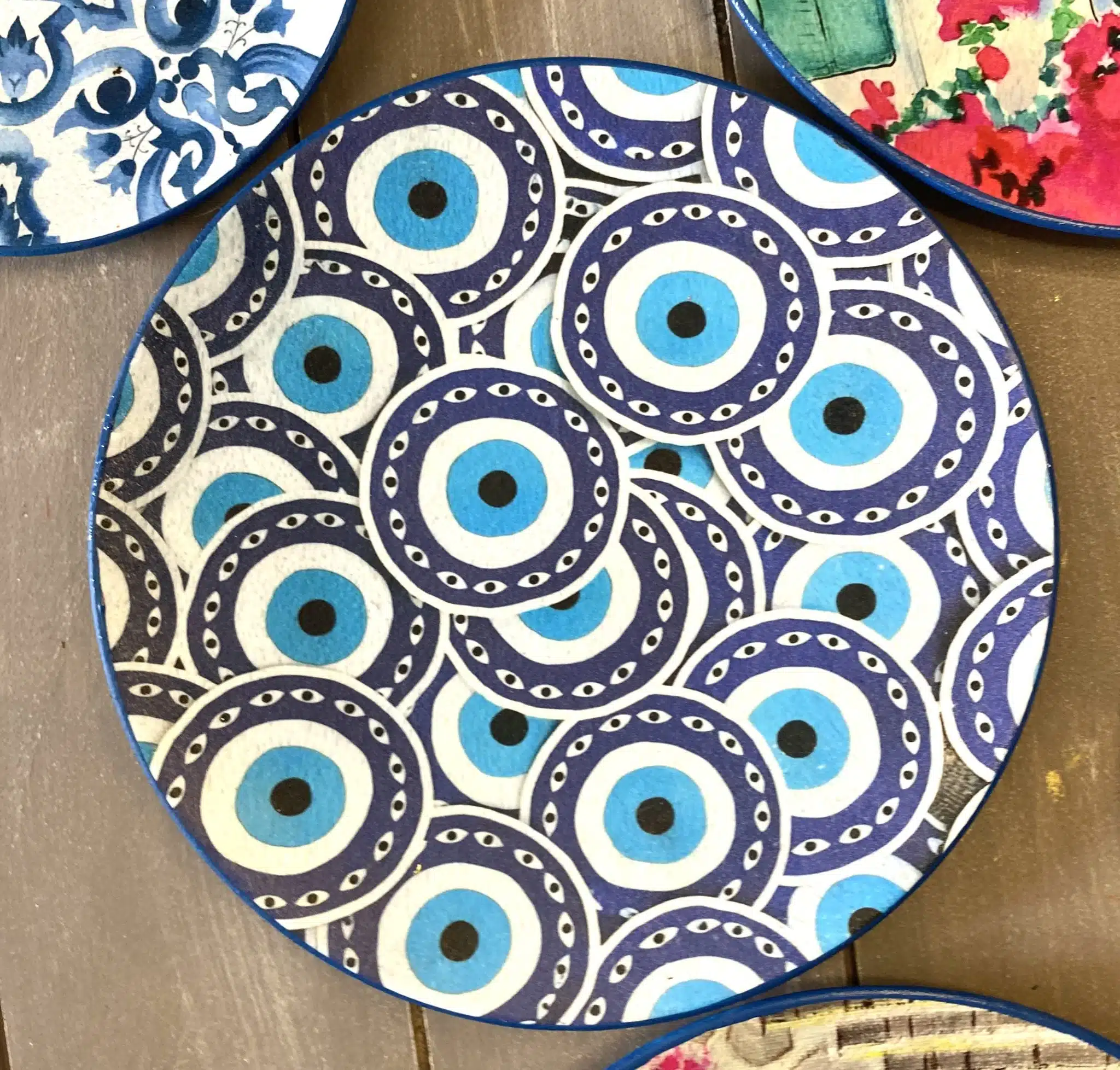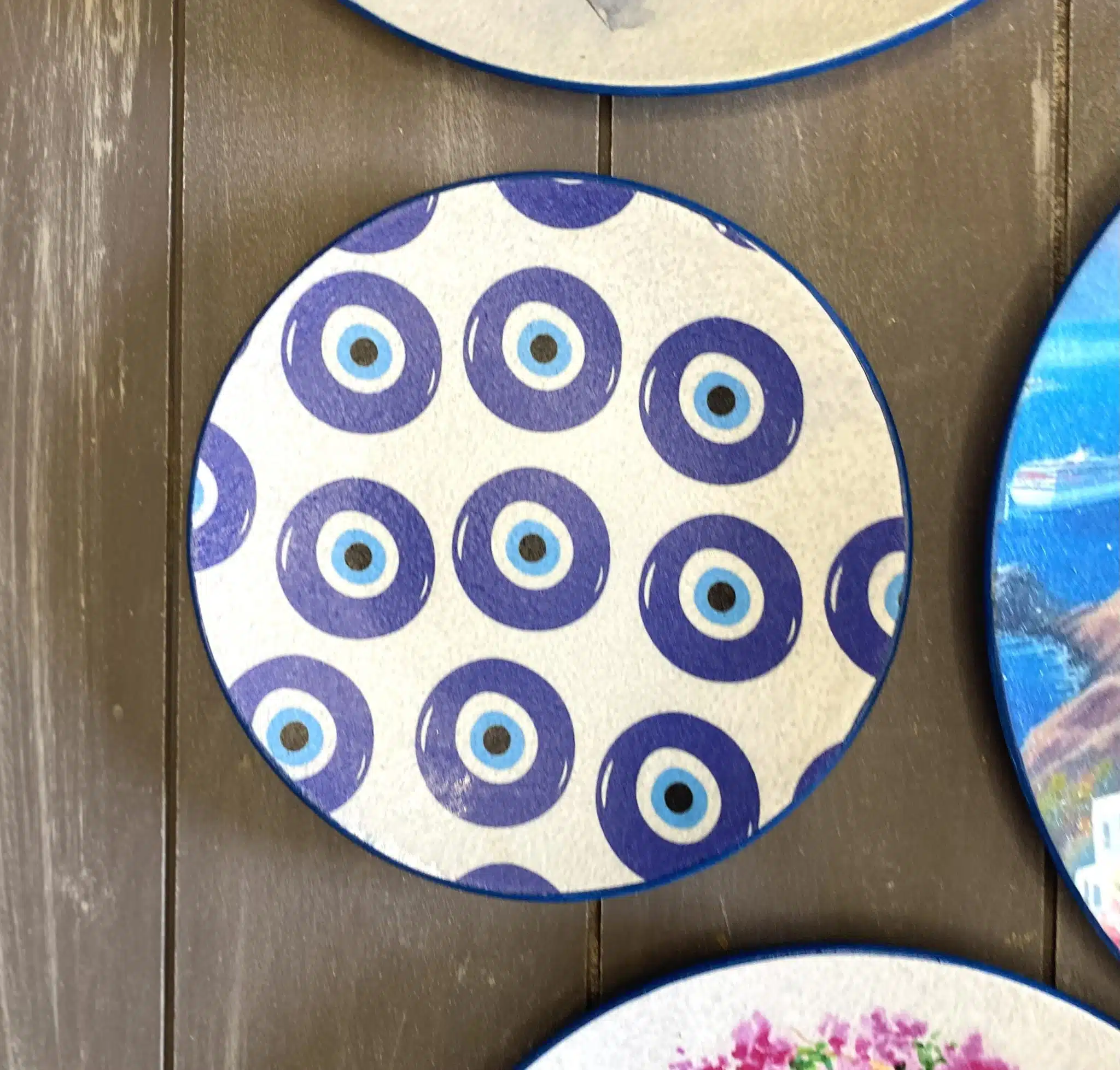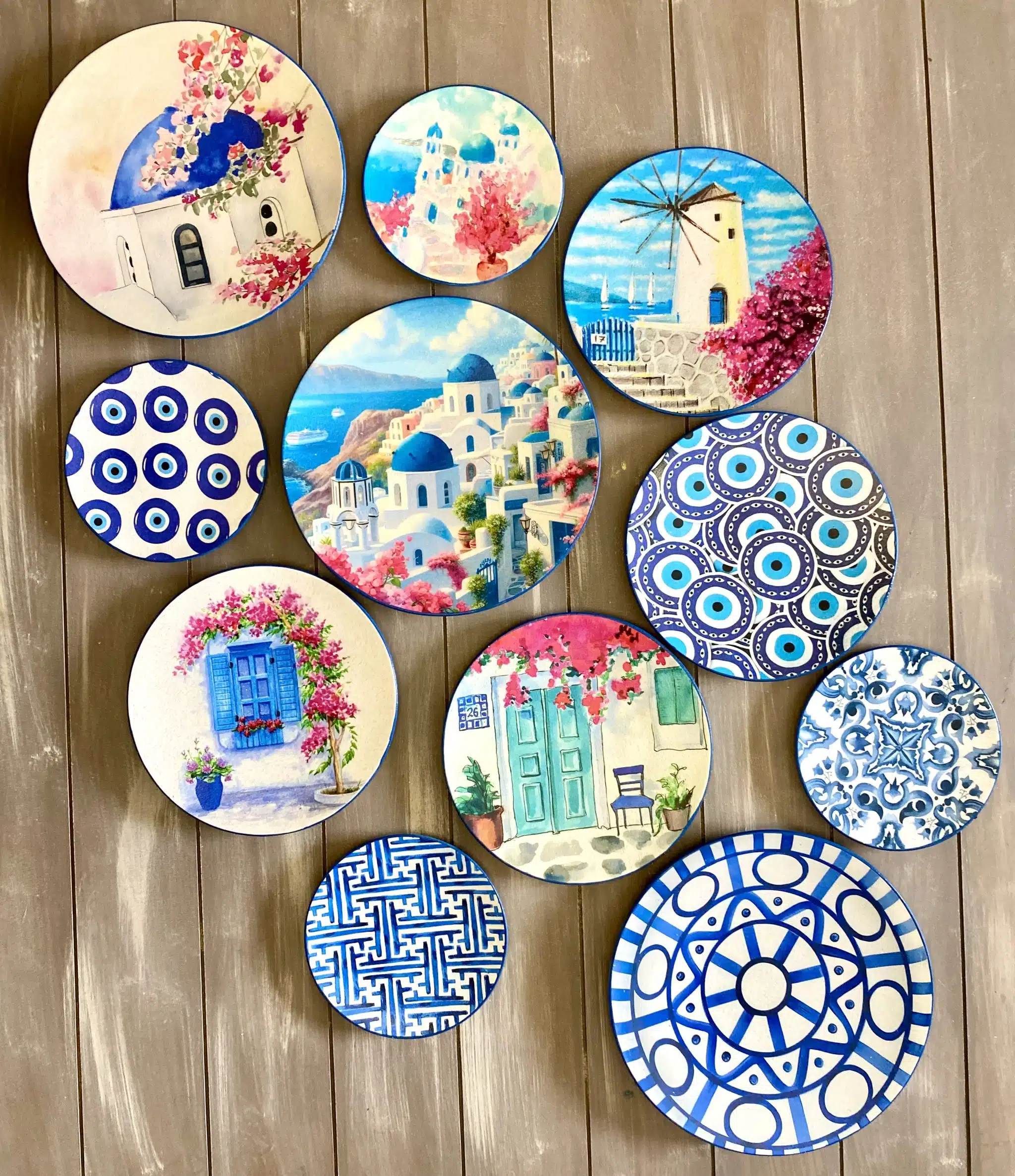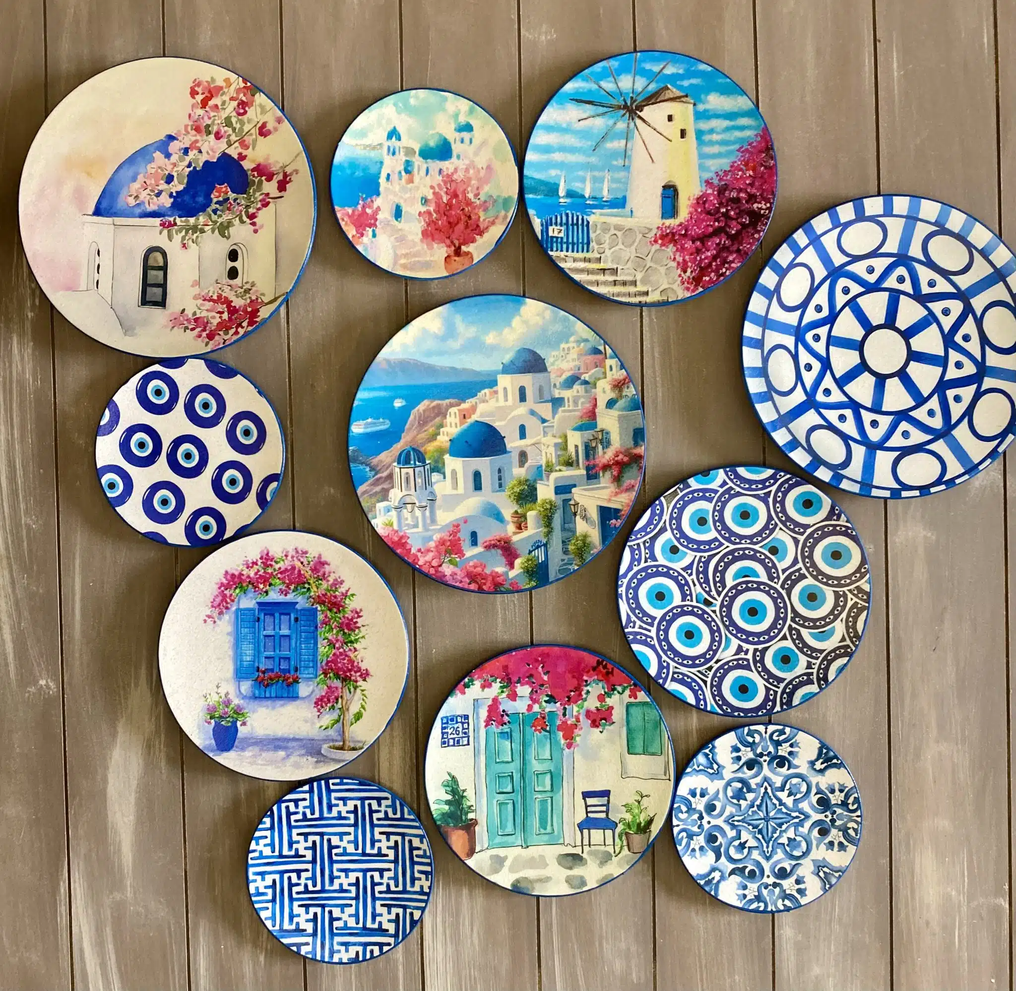 Decoupaged wall plates in Santorini theme and blue eye
