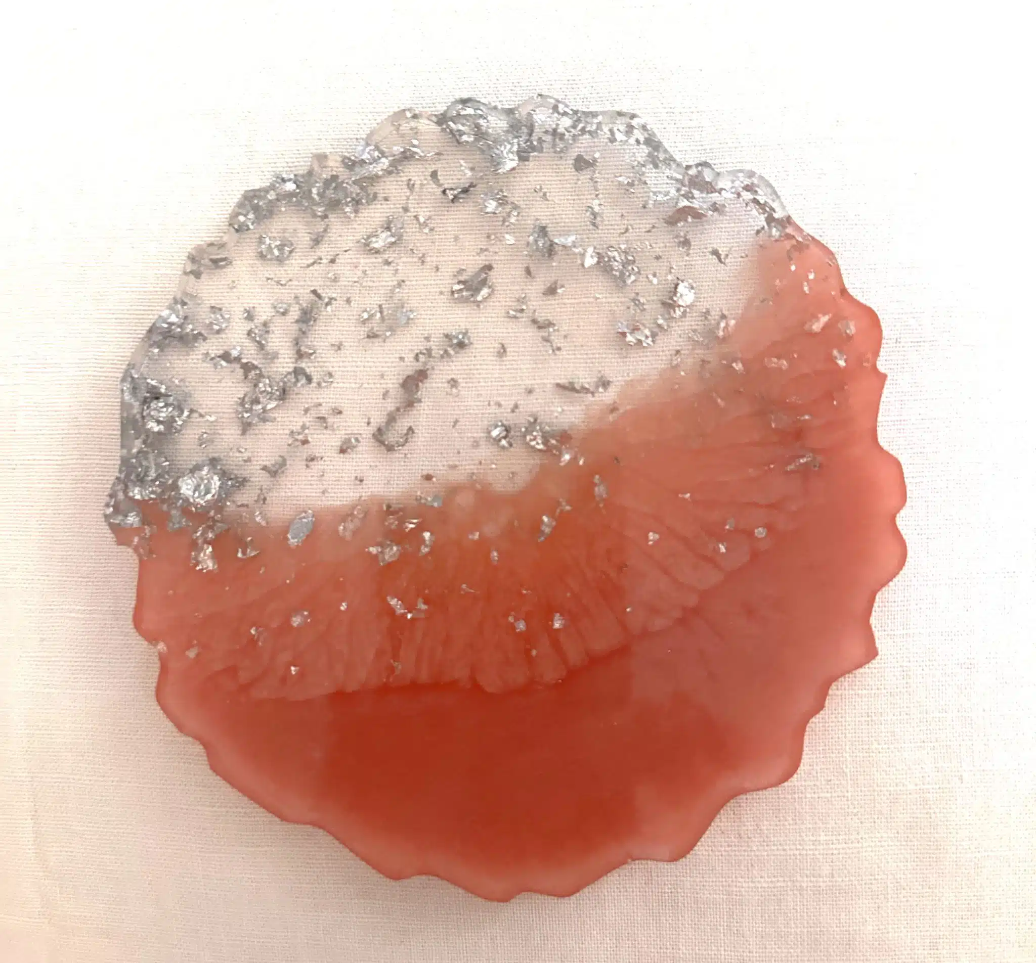 Round salmon pink and transparent resin coasters with gold or silver leaves. It’s size is around 13 cm.