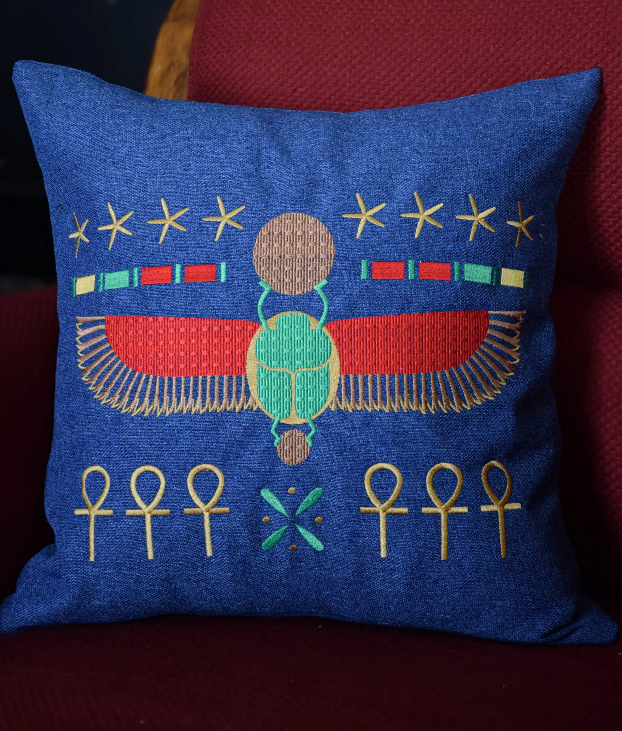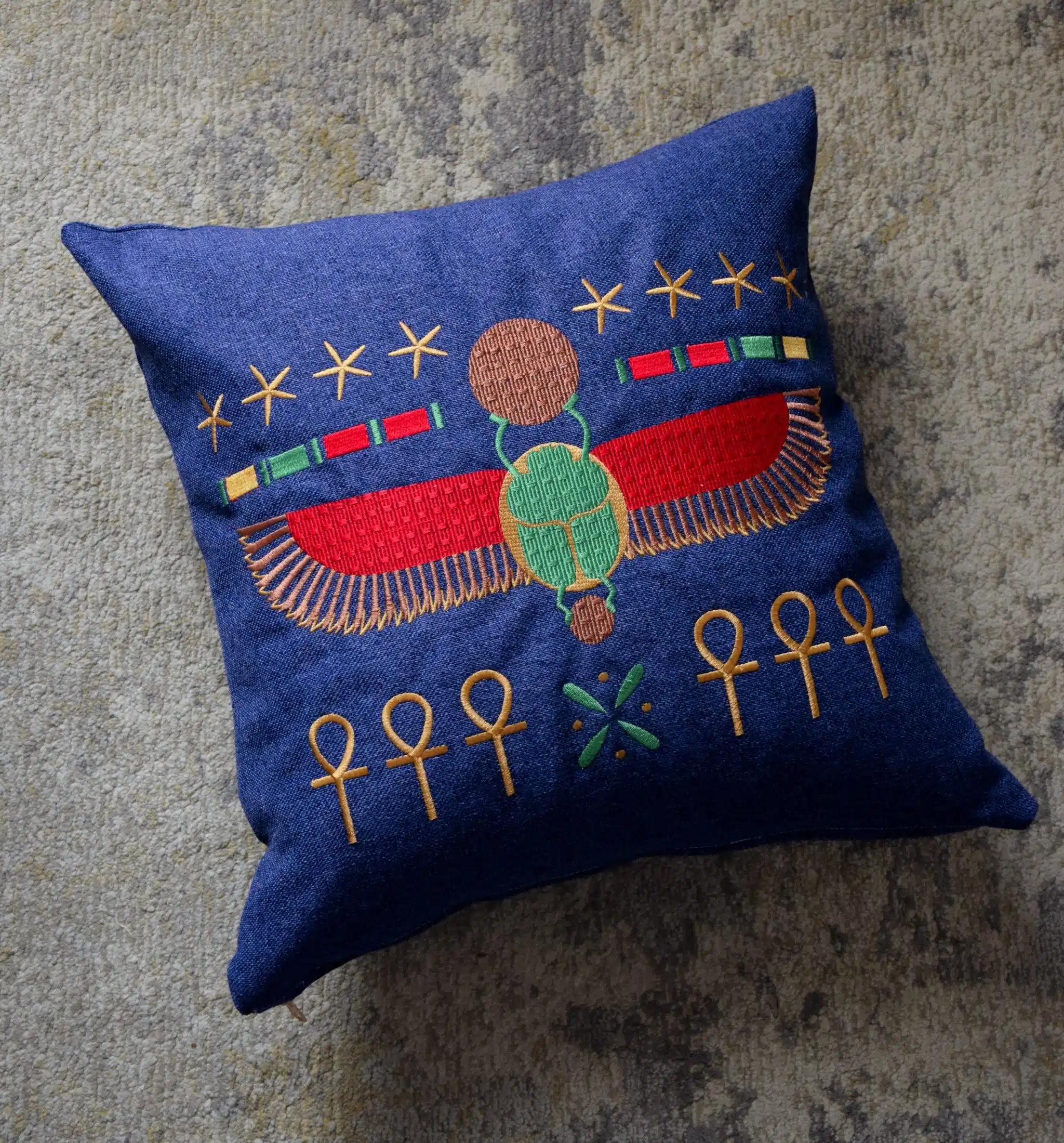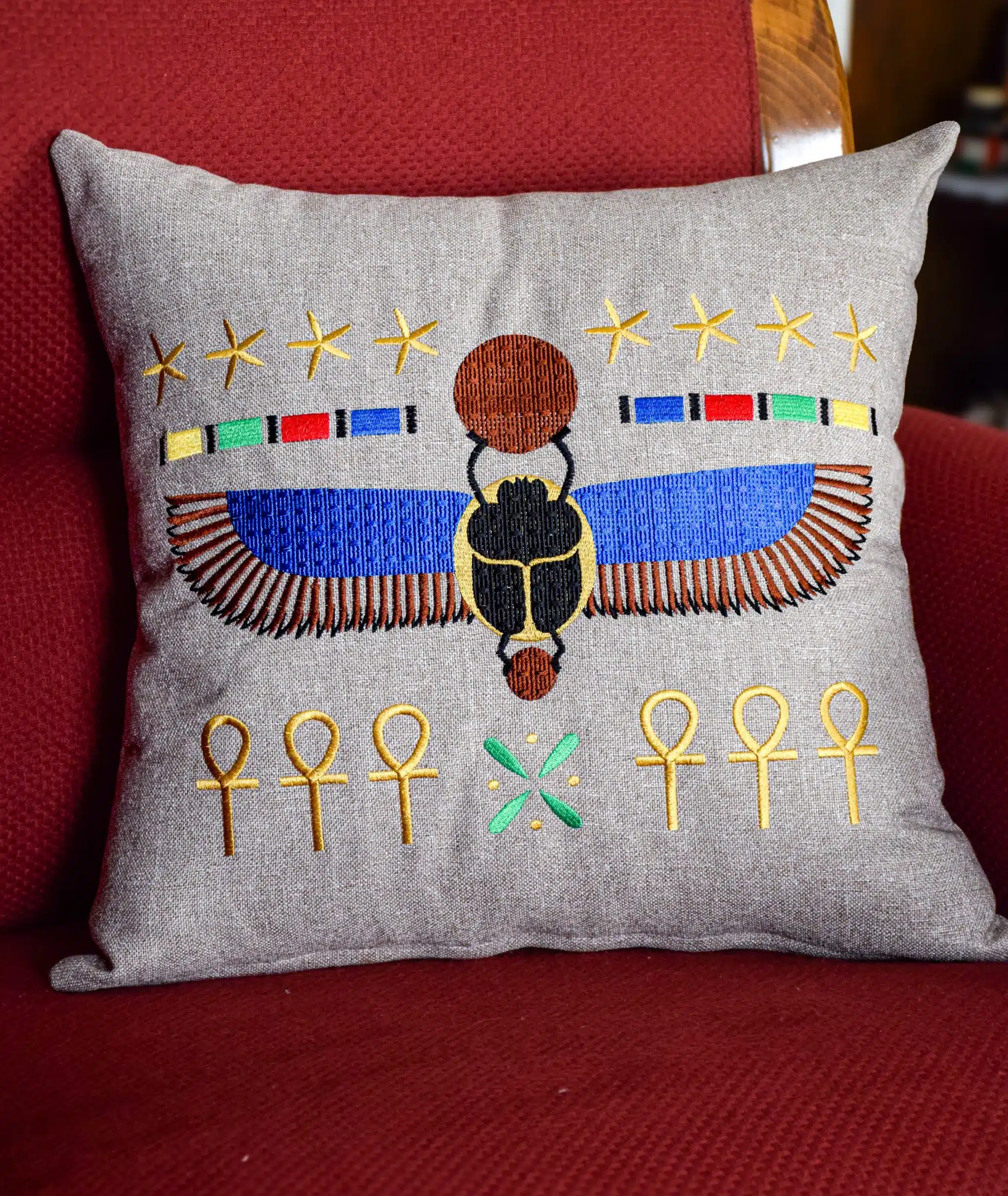 A cushion made of linen fabric. This cushion adorned with embordered scarab, carries the legacy of this ancient symbol.