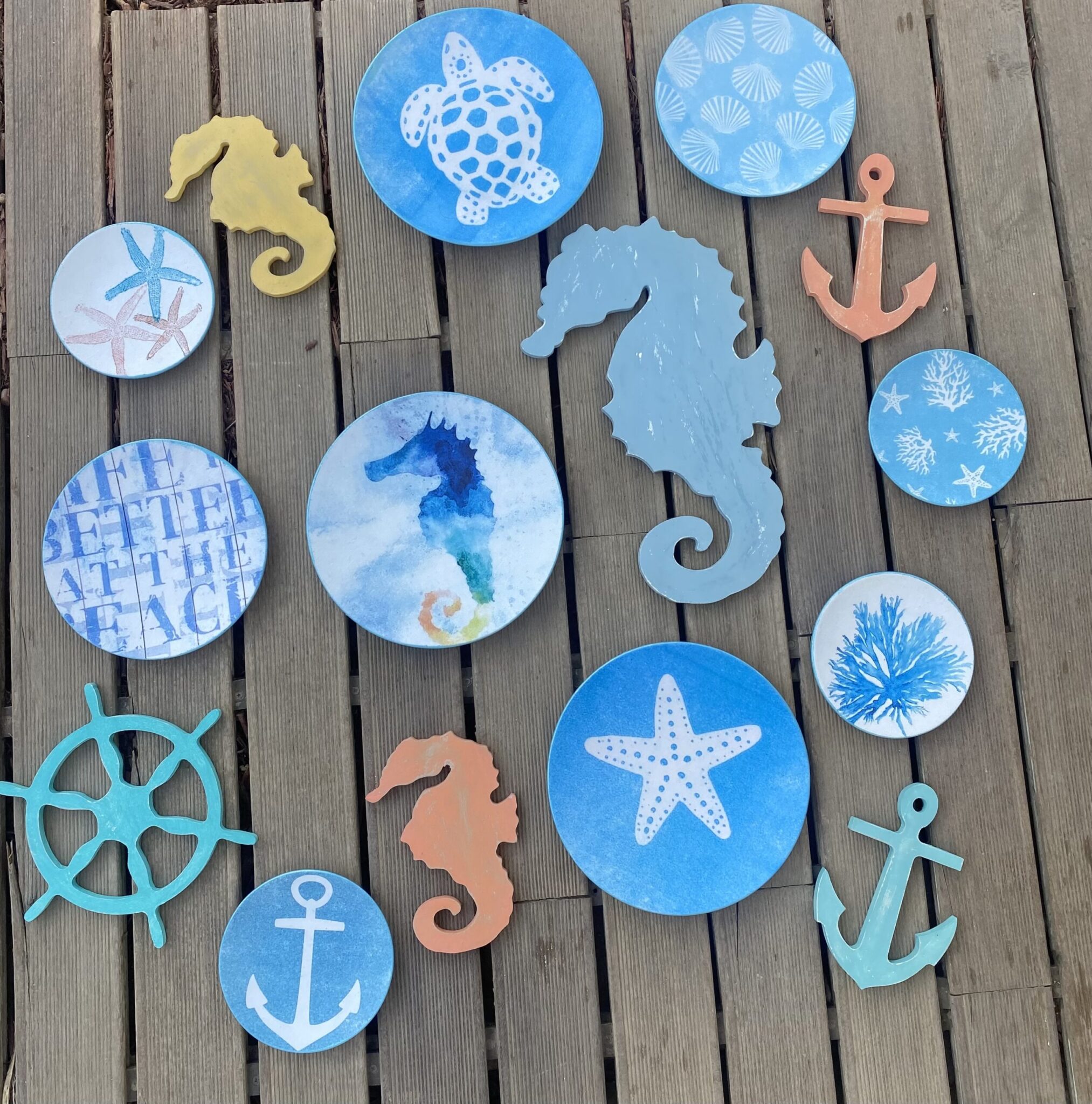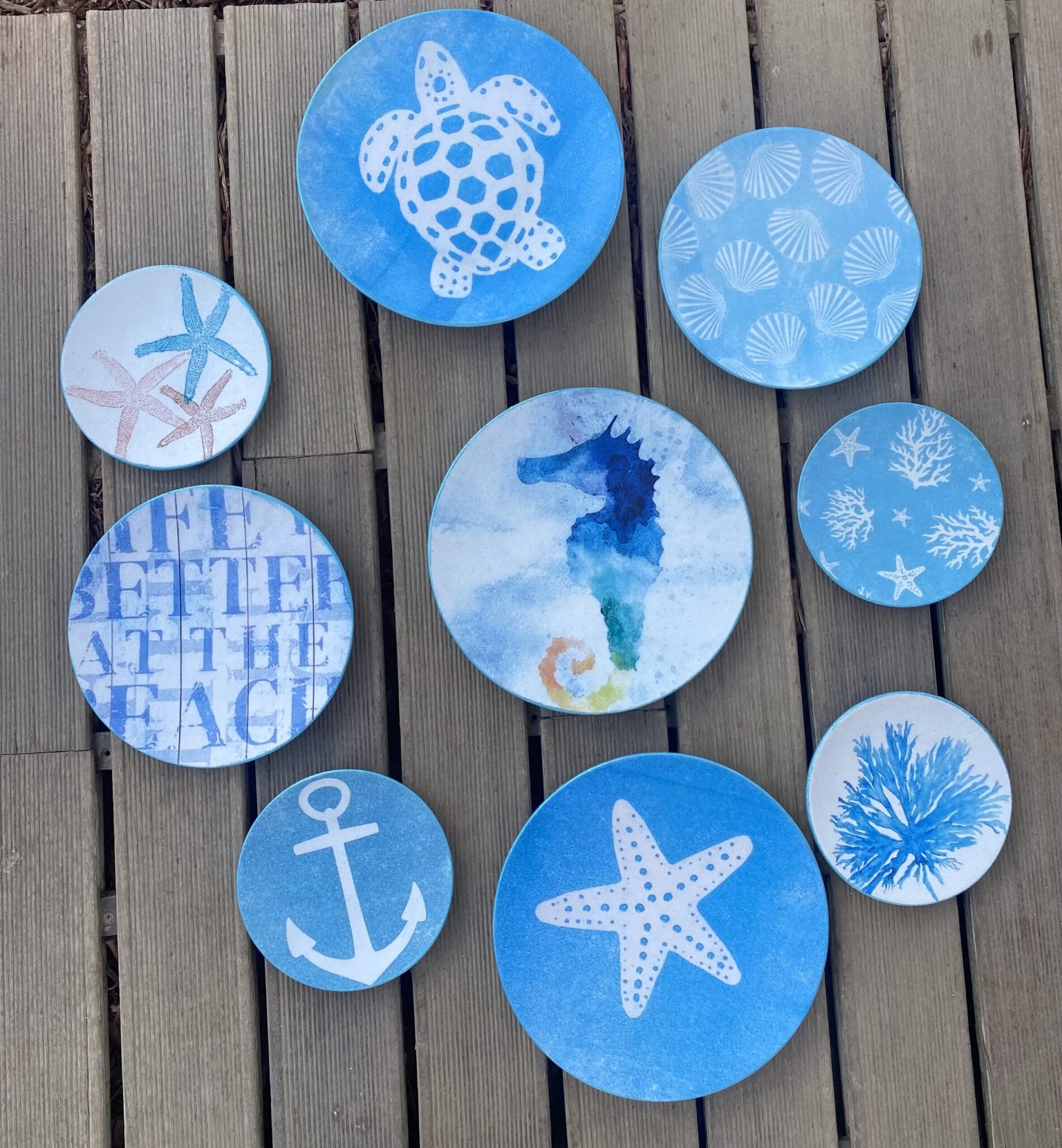 Decoupaged porcelain plates for summer in sea blue theme
