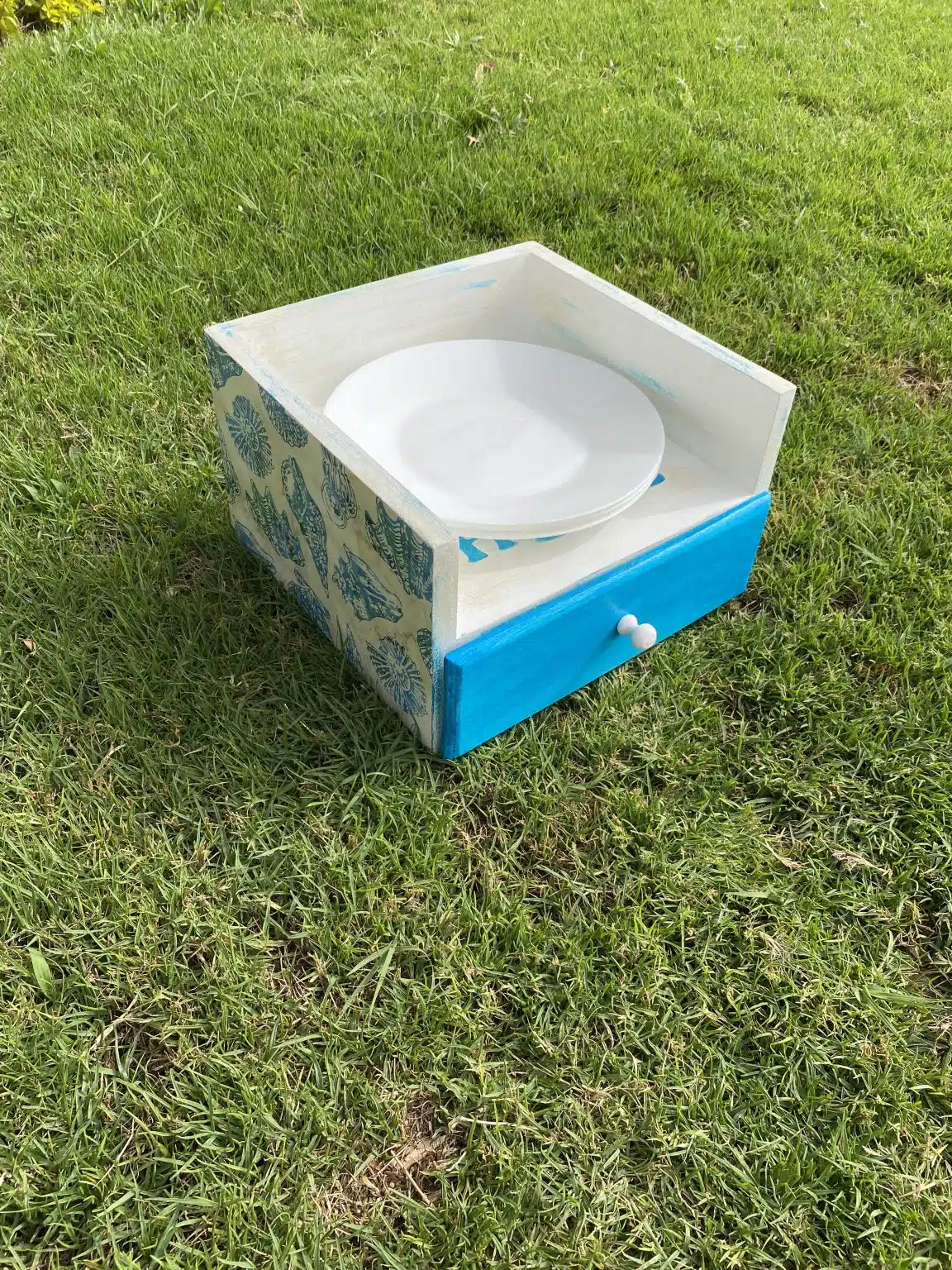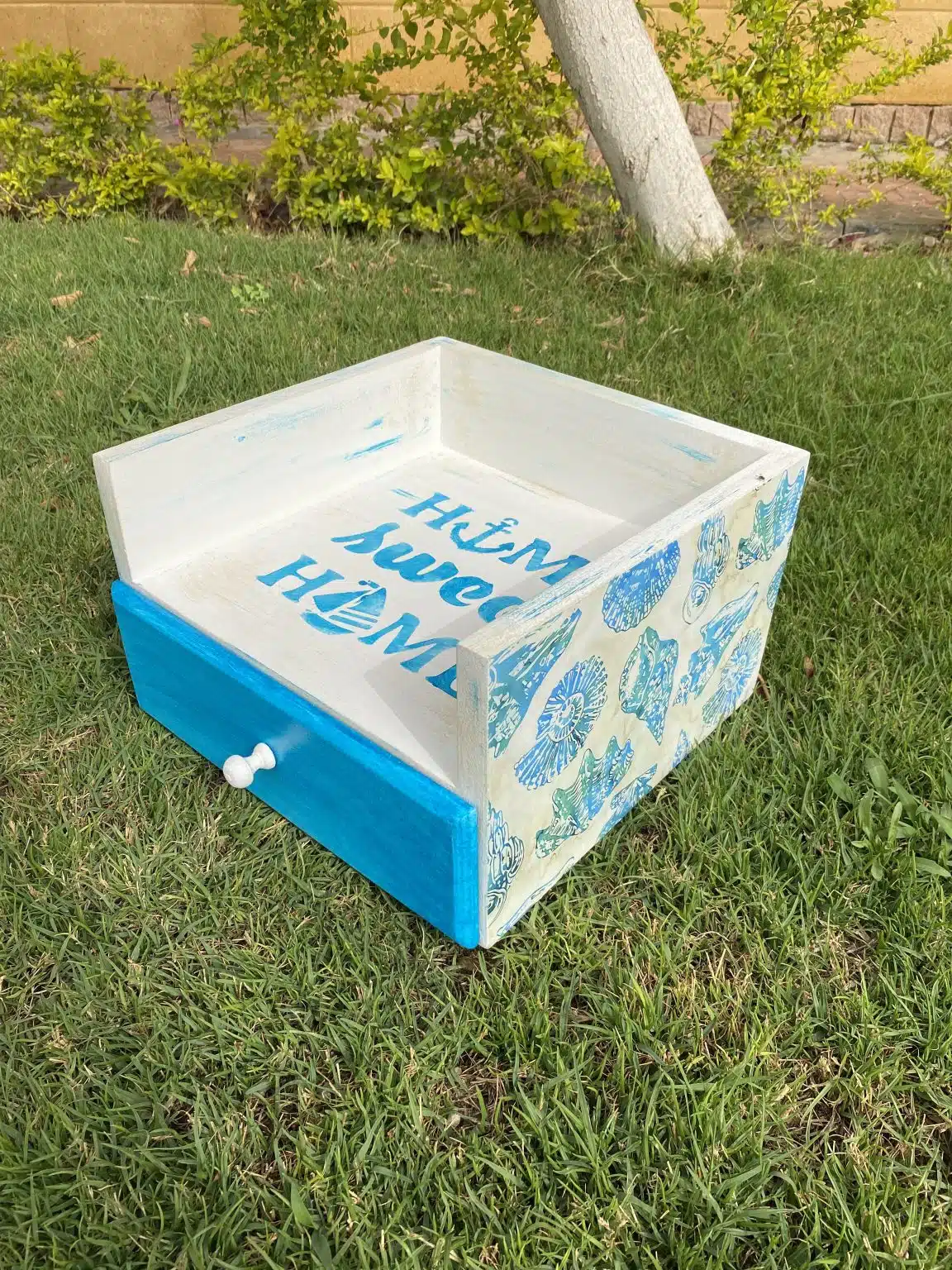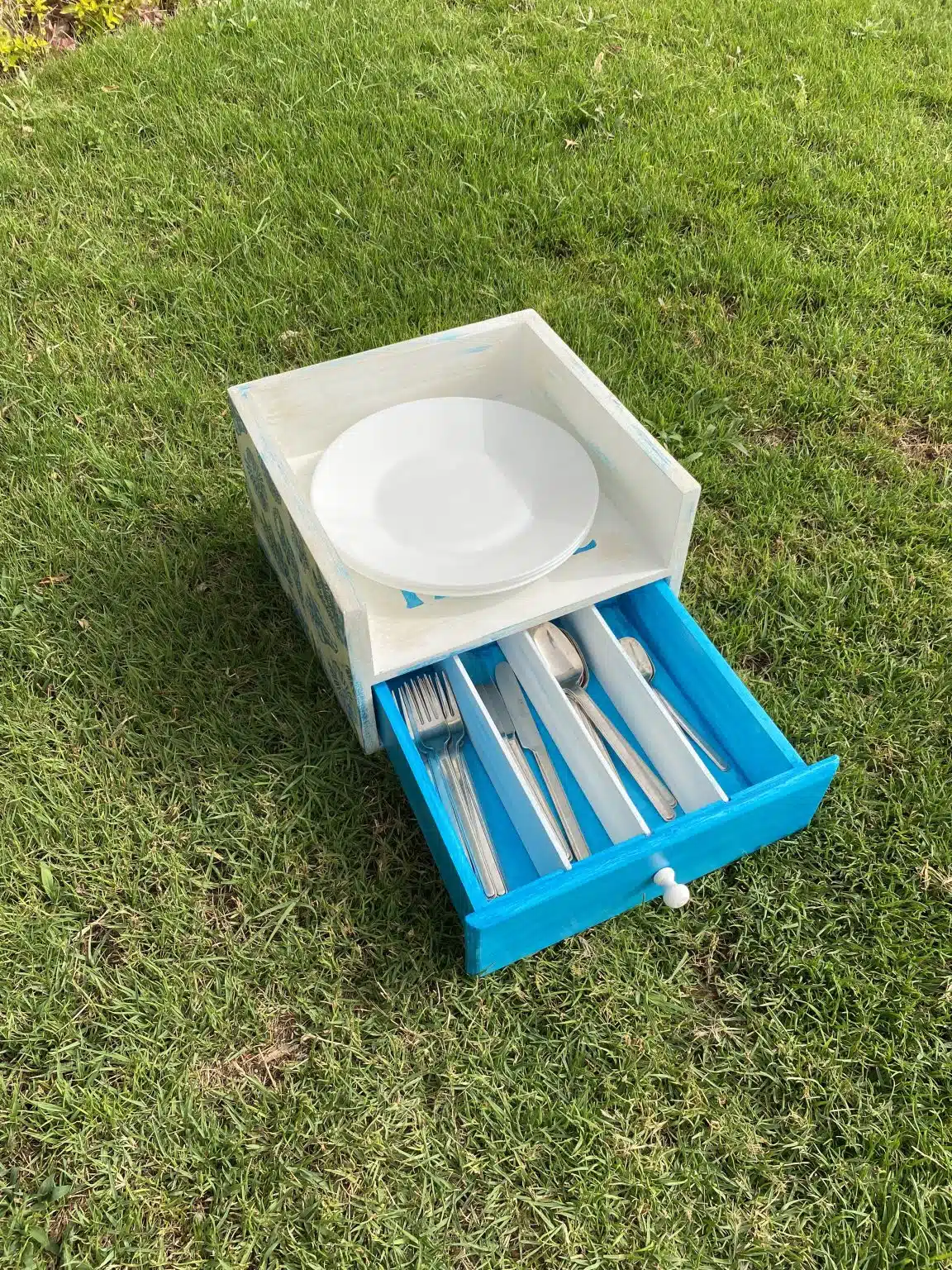 Wooden box for plates and drawer for cutlery organizer with sea shells and summer design
