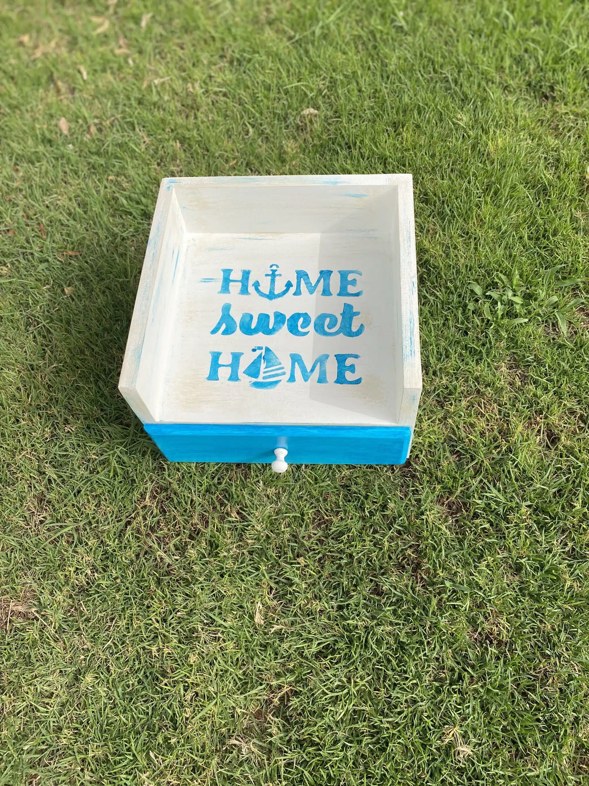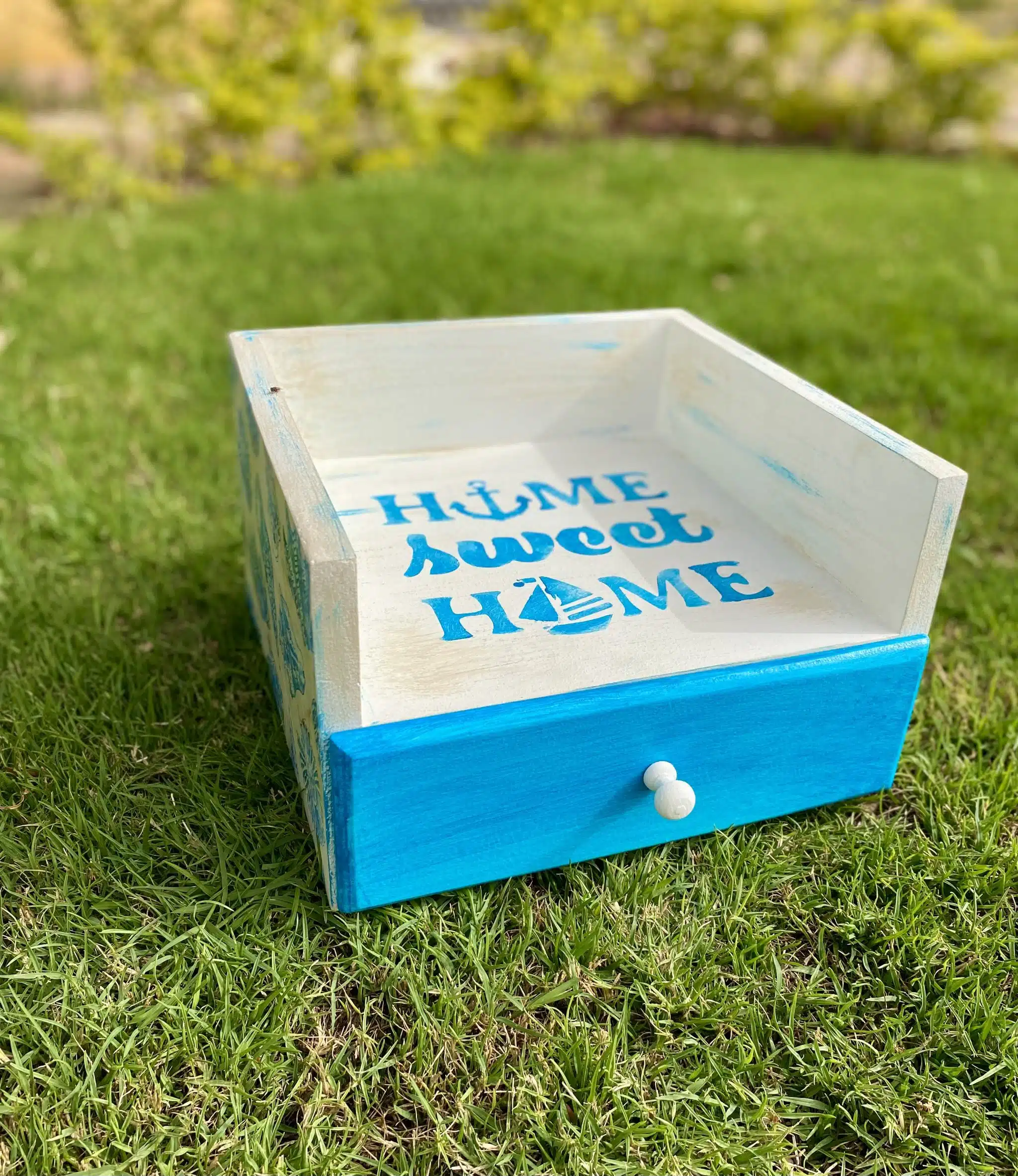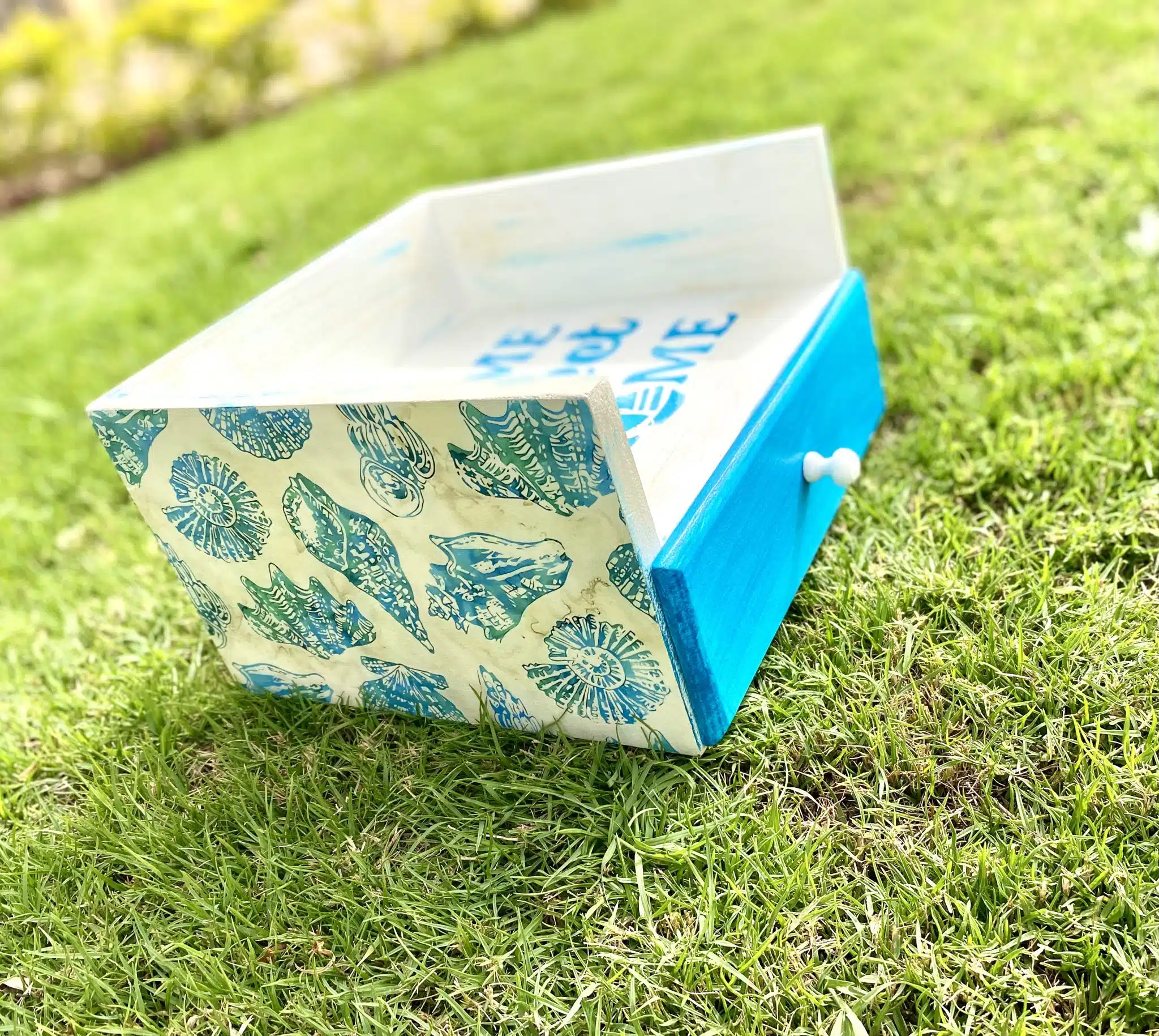 Wooden box for plates and drawer for cutlery organizer with sea shells and summer design