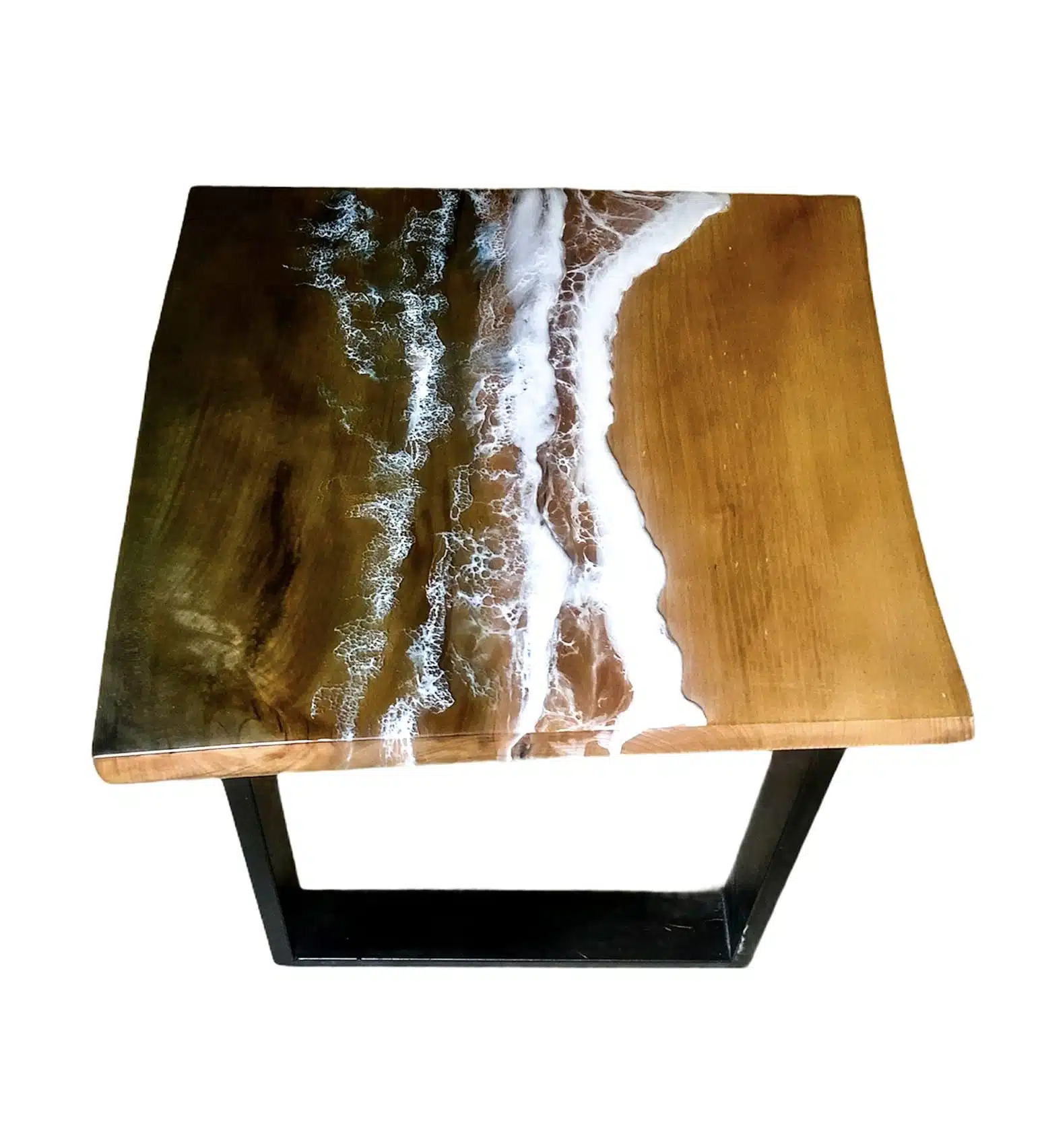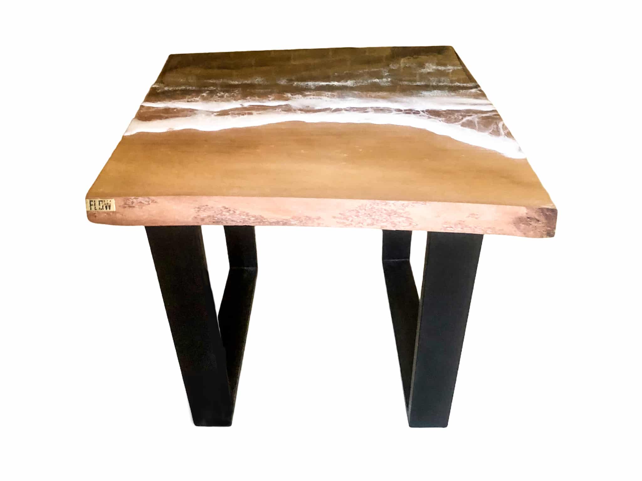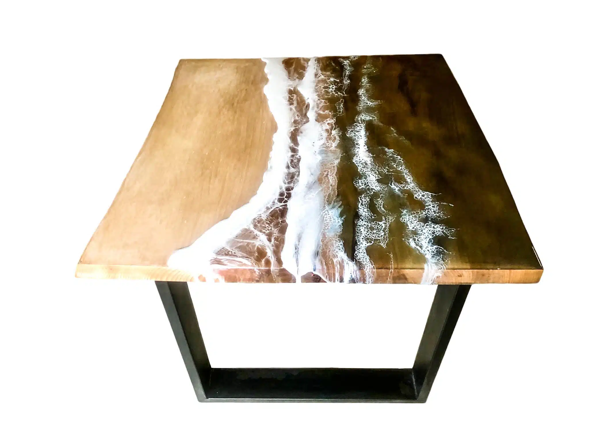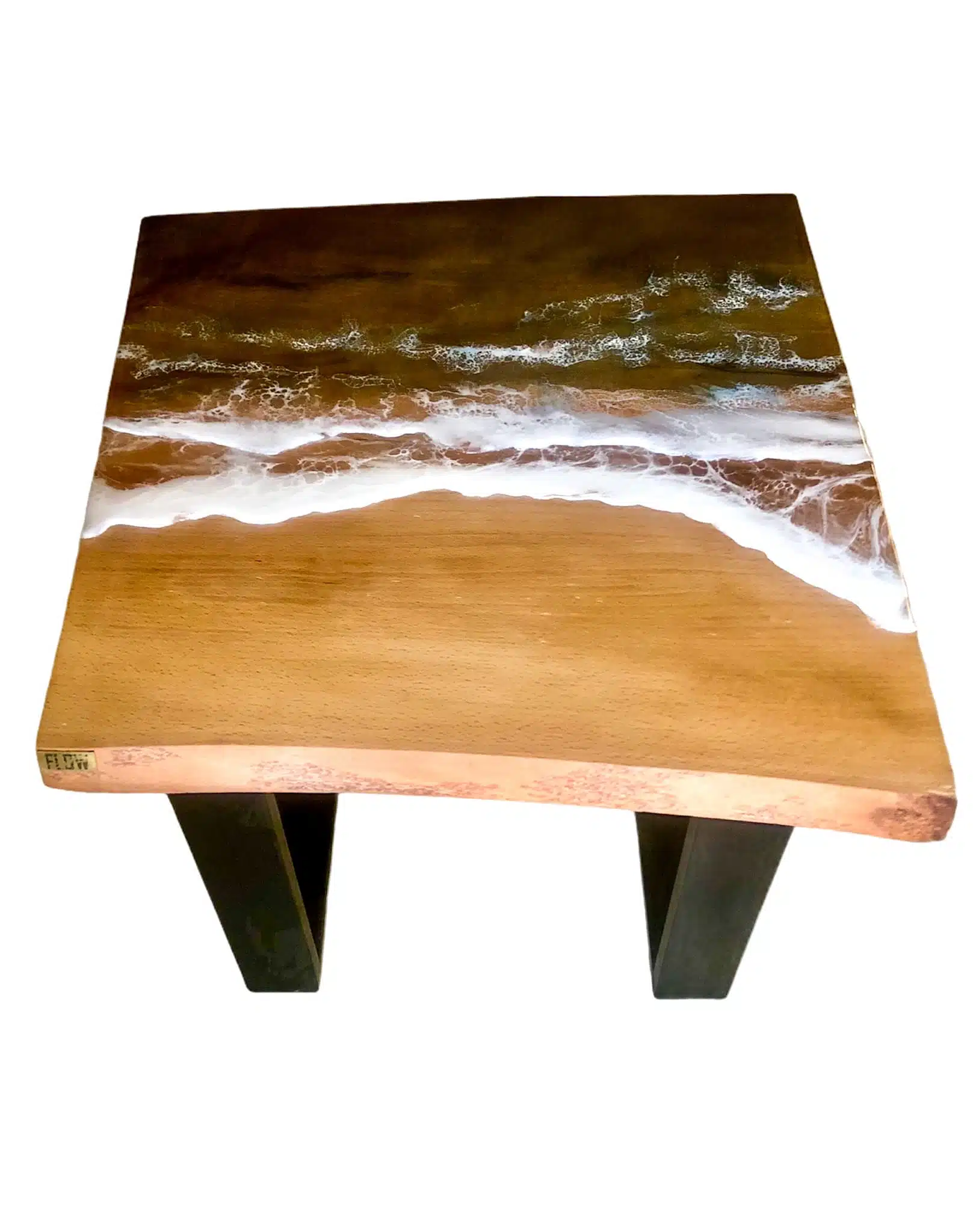 Side table Natural beech wood slab table top with epoxy resin seascape design Black steel legs Size: 45×49 cm Height: 45 cm