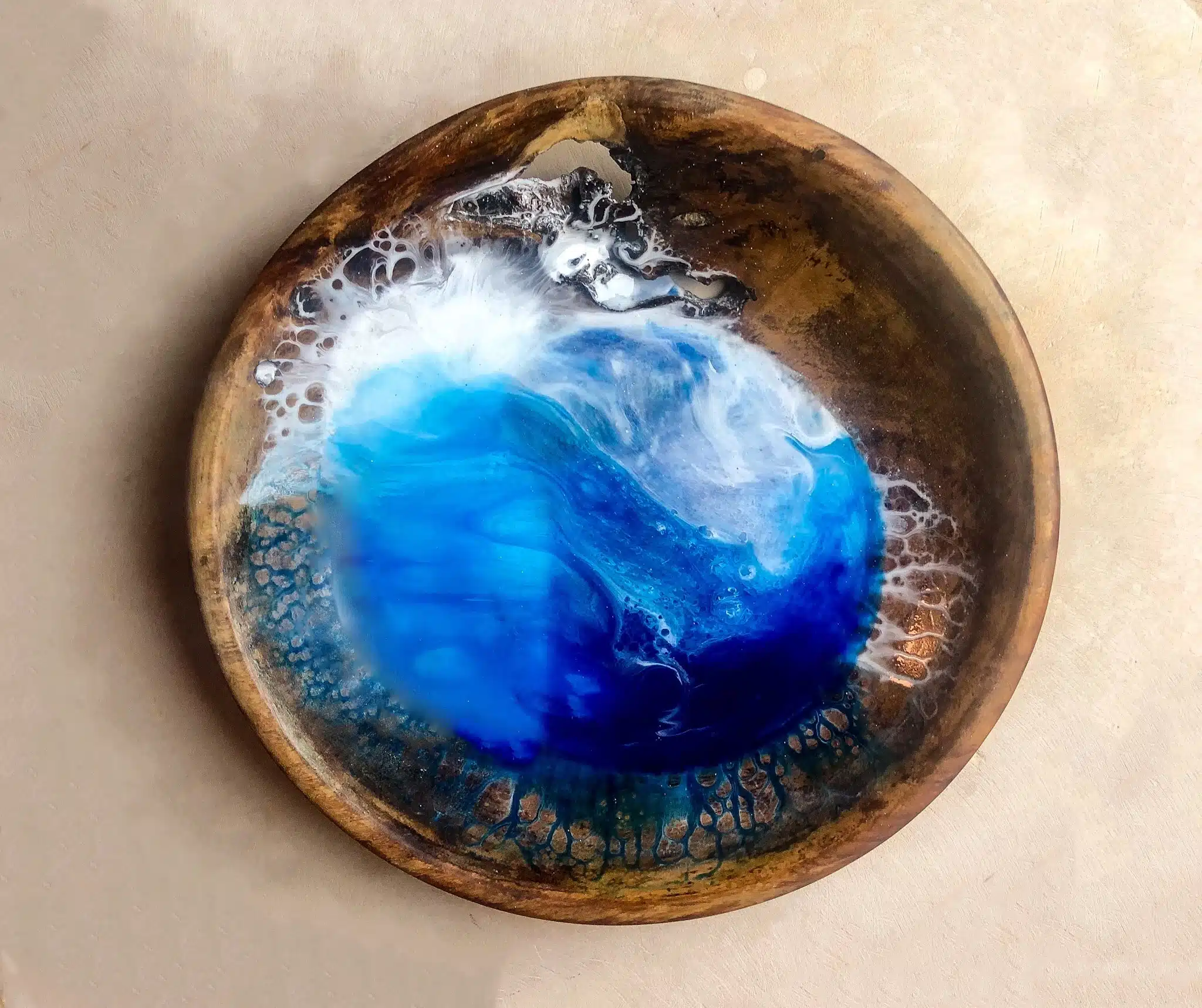 •Epoxy resin on natural Sissoo wood treated with olive oil.