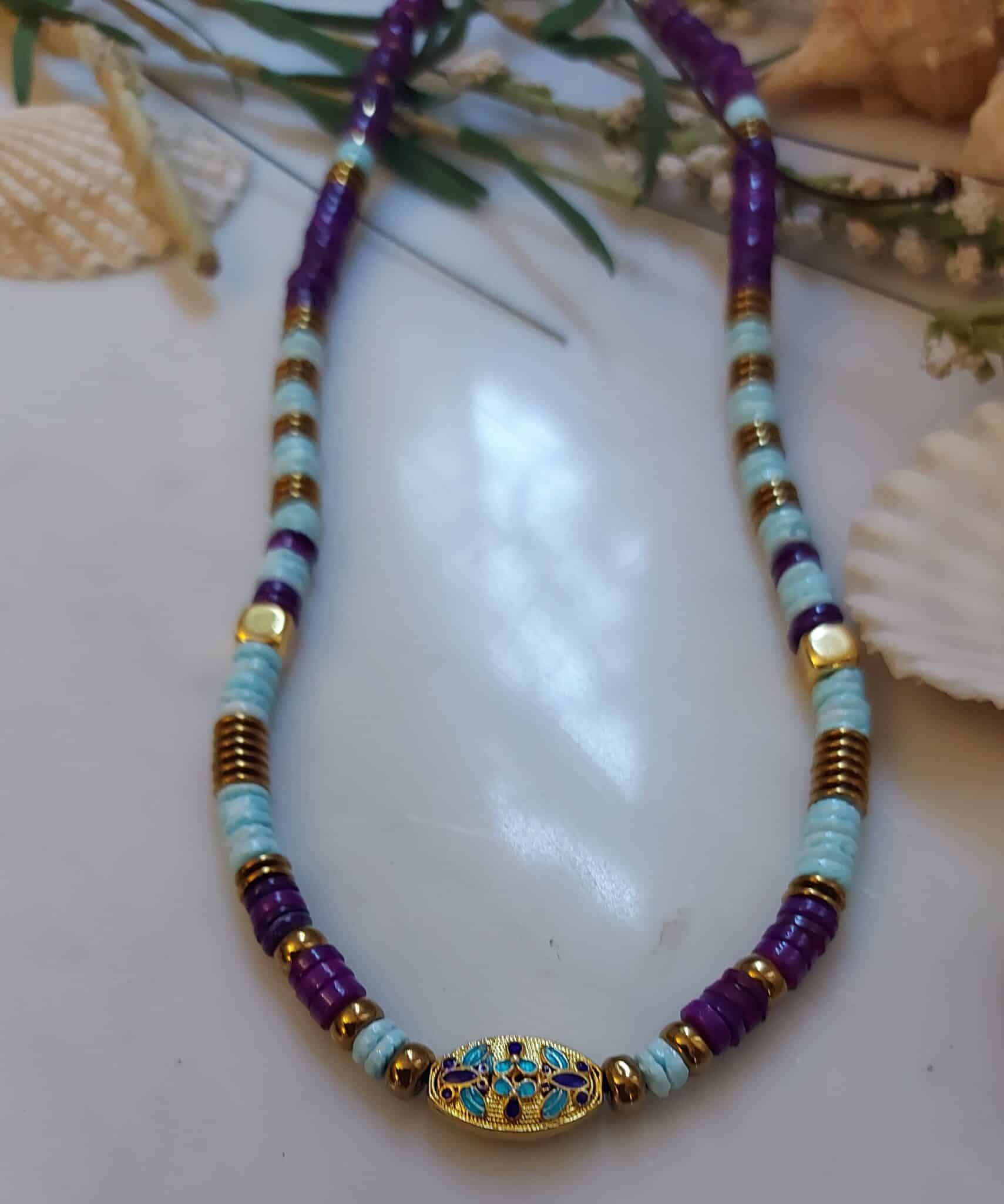 Handmade necklaces by seashell beads and India motifain the middle
